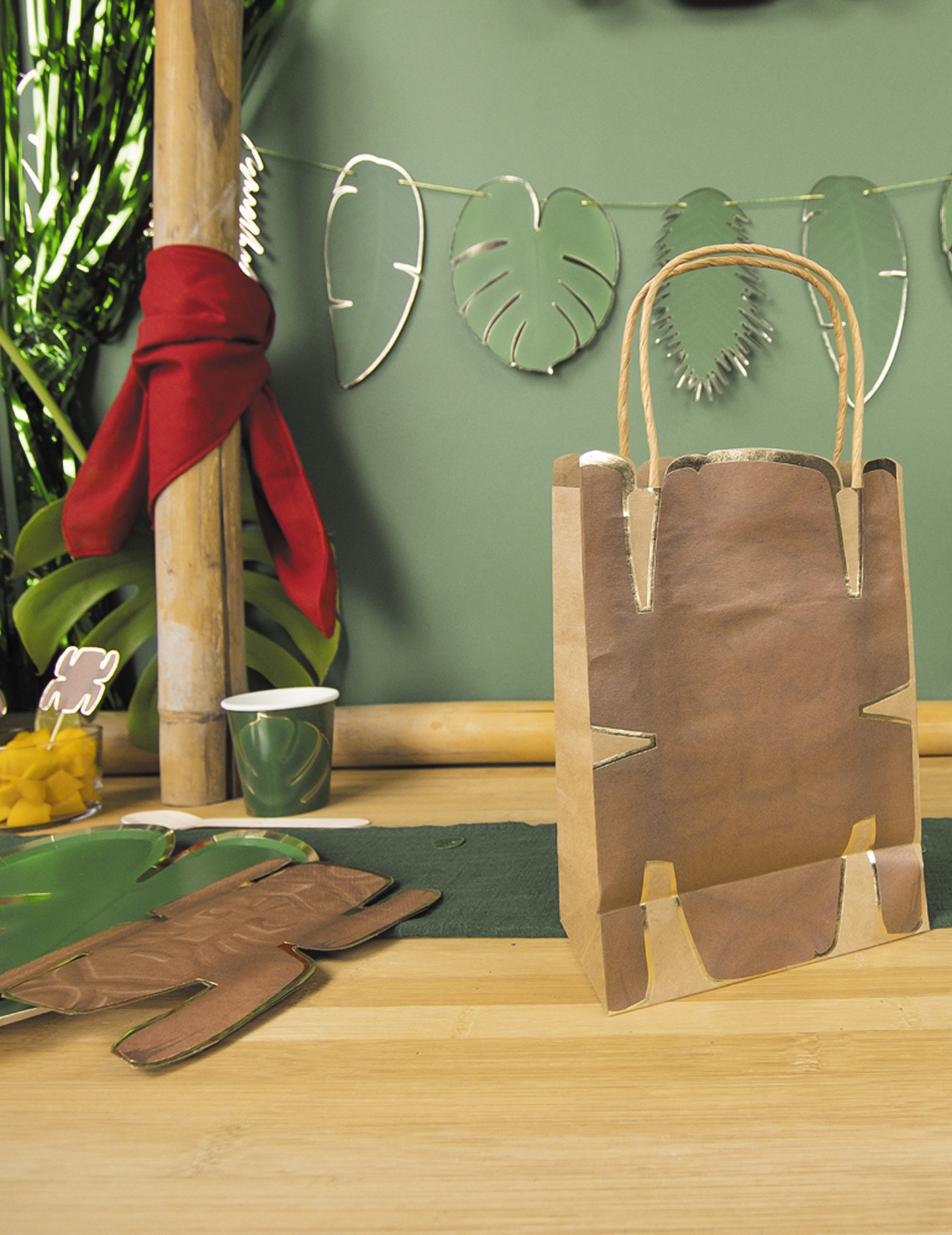 Tieto darčekové vrecká sa predávajú v dávke 4 a meria približne 28,5 cm x 8 cm x 15 cm. V papieri majú farbu kraft a majú hnedú a zlatú totemovú tlač. Sú vybavené 2 rukovätiami sú v Raphii. Tieto tašky budú perfektné na ponúkanie malých darčekov svojim priateľom pri príležitosti vašich narodenín!