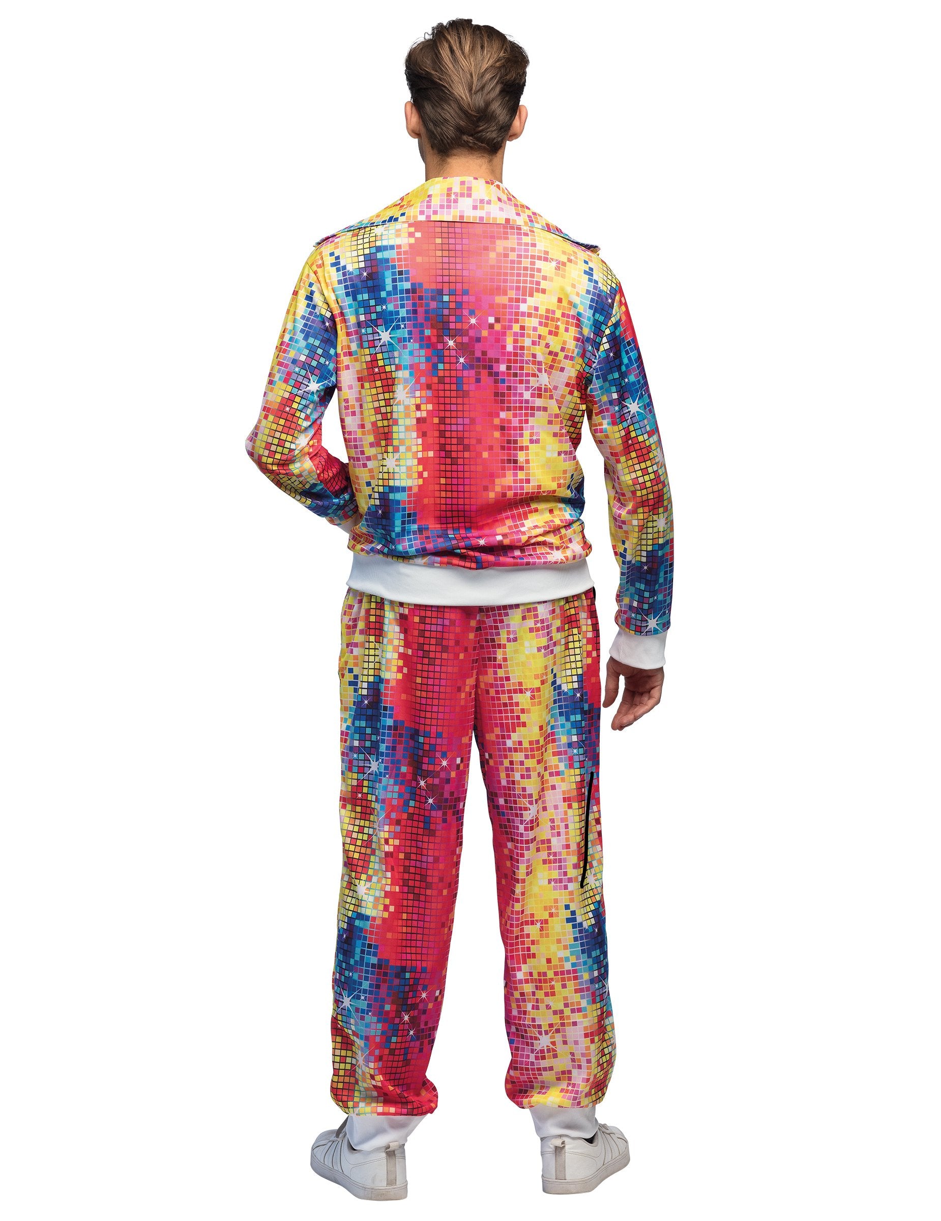 Táto disco sledovacia súprava je pre mužov a pozostáva z bundy a nohavíc. Bunda a nohavice majú viacfarebnú guľovú guľovú tlač. Bunda má zips, ktorý vám umožní ľahko ho zatvárať. Konce sú elastické a majú biele hranice, ktoré poskytujú športový vzhľad 80. rokov.