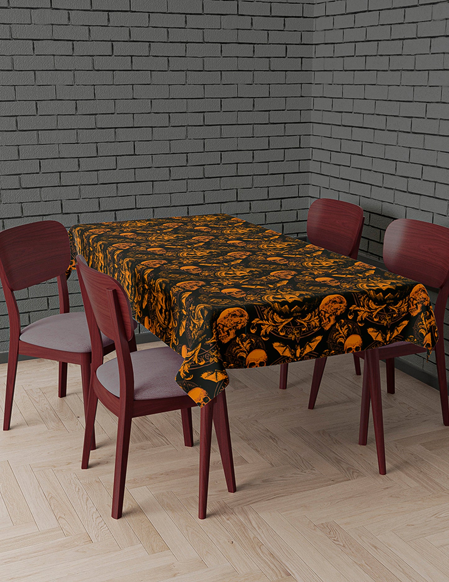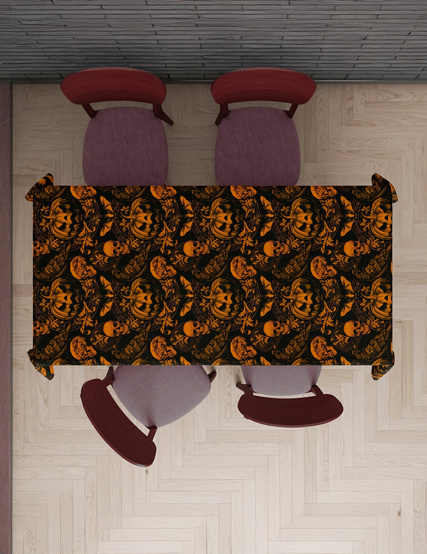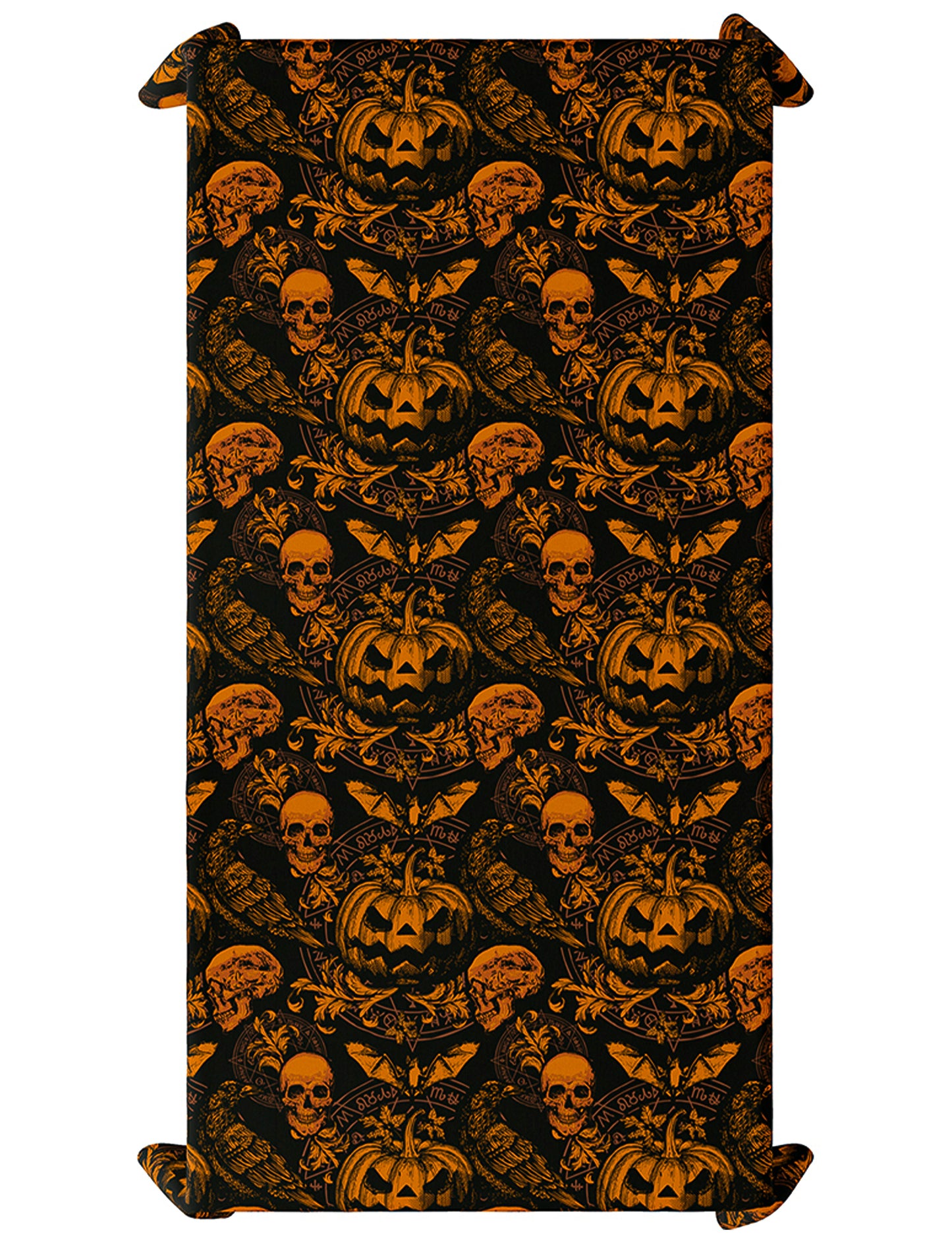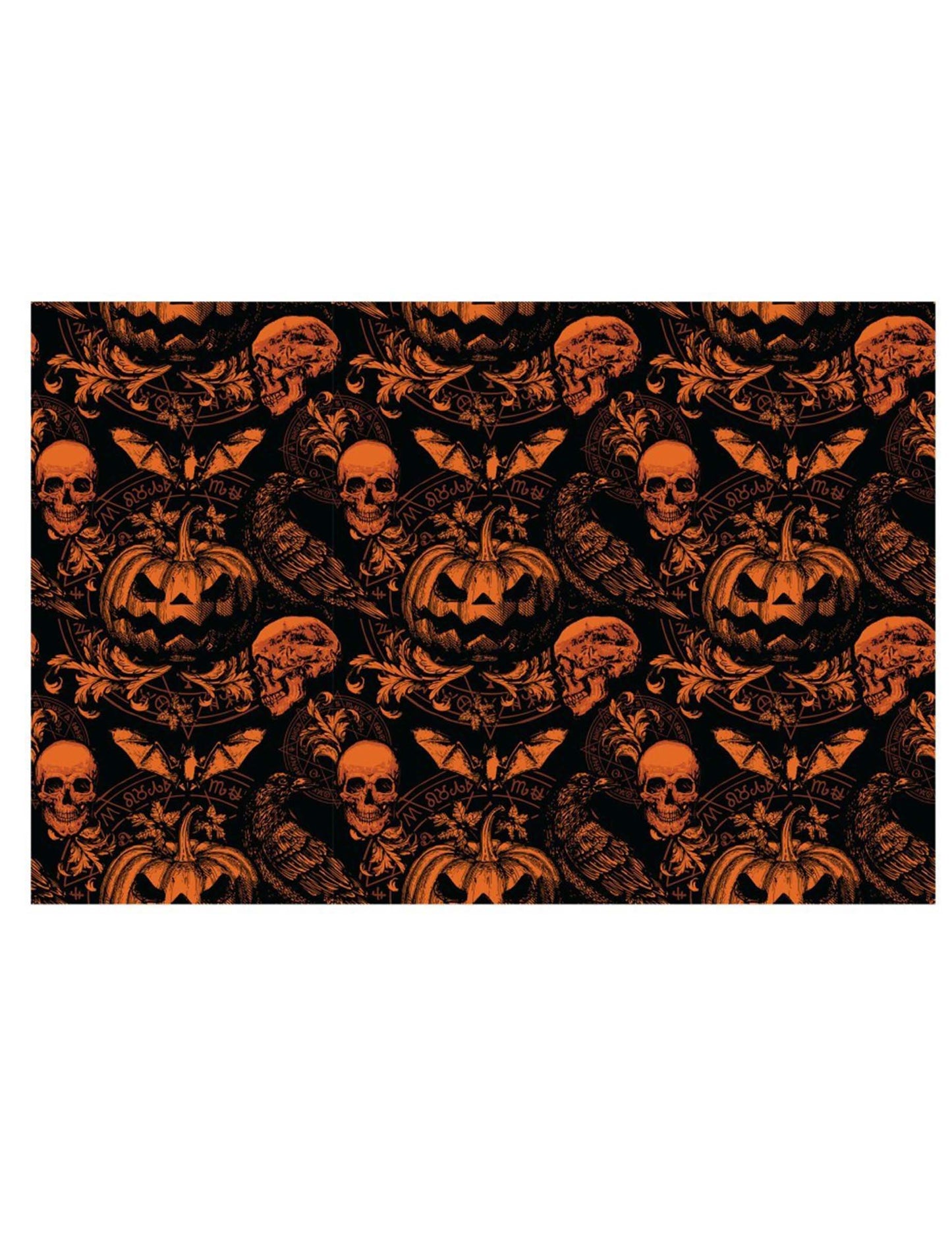 Tento obrus gotického tekvice je vyrobený z PVC a meria približne 137 x 274 cm. Má oranžové vzory tekvice, lebiek a netopierov na čiernom pozadí, čím vytvára tmavú a slávnostnú atmosféru. Tento obrus, ktorý je ideálny pre večery s tematikou gotiky alebo Halloweenu, dodá vášmu stolu nádych tajomstva a oslavy.