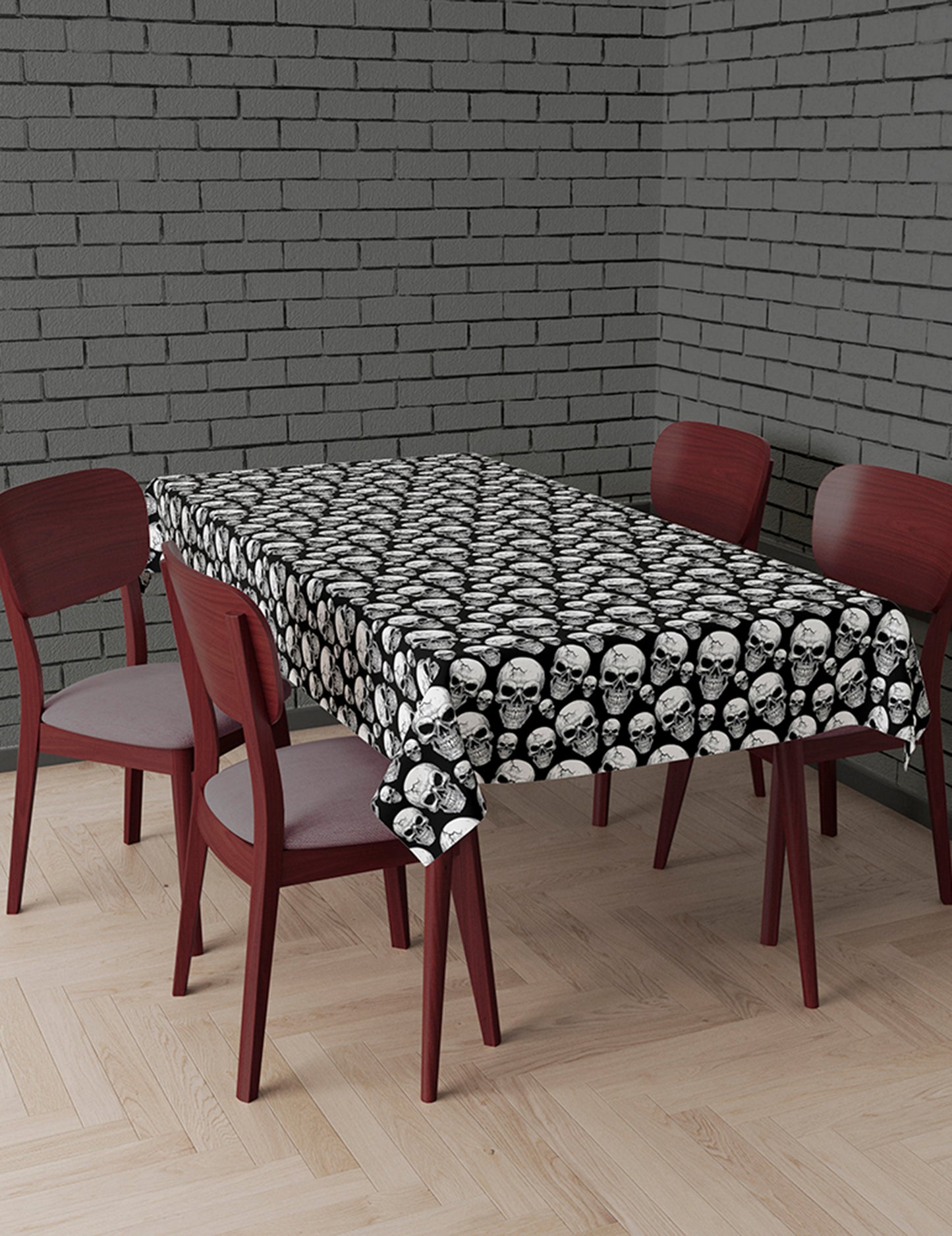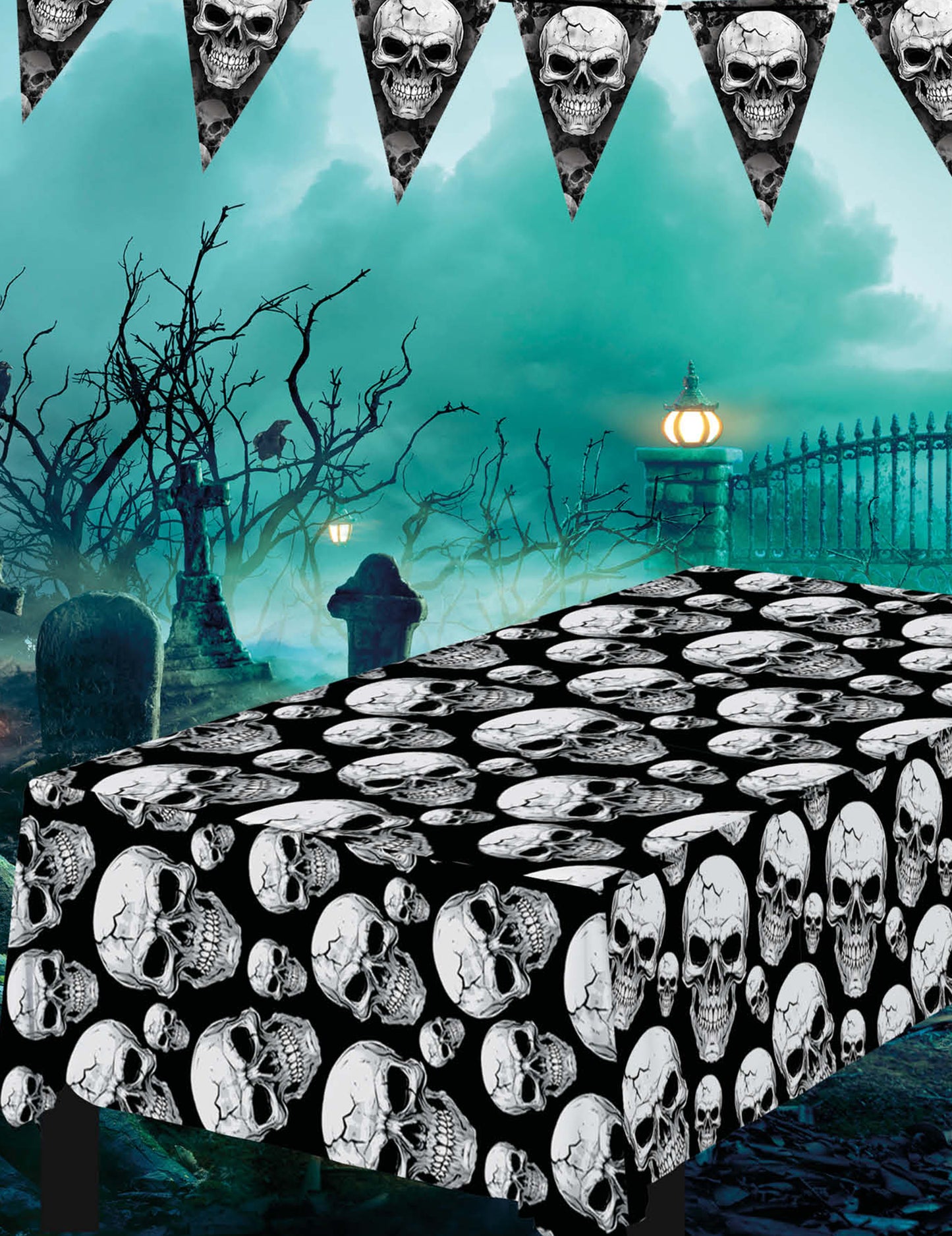 Tento obrus meria približne 137 x 274 cm. Je zdobený lebkami na čiernom pozadí. Jeho zloženie PVC uľahčuje jeho čistenie. Ideálne na to, aby ste svojej dekorácii dodali atmosféru strašidelnej strany, je ideálna na vytvorenie podmanivého dekorácie večierkov pre Halloween!
