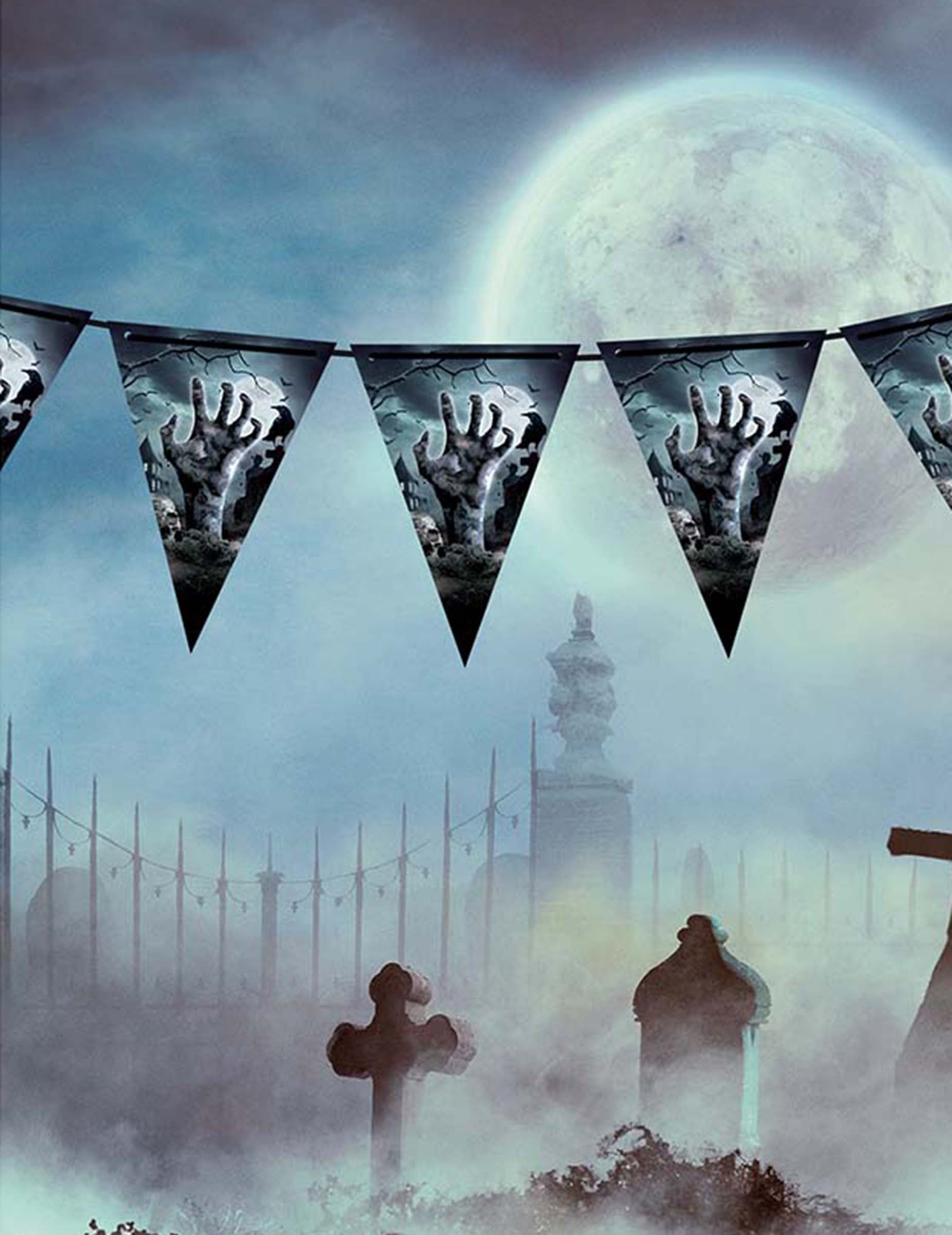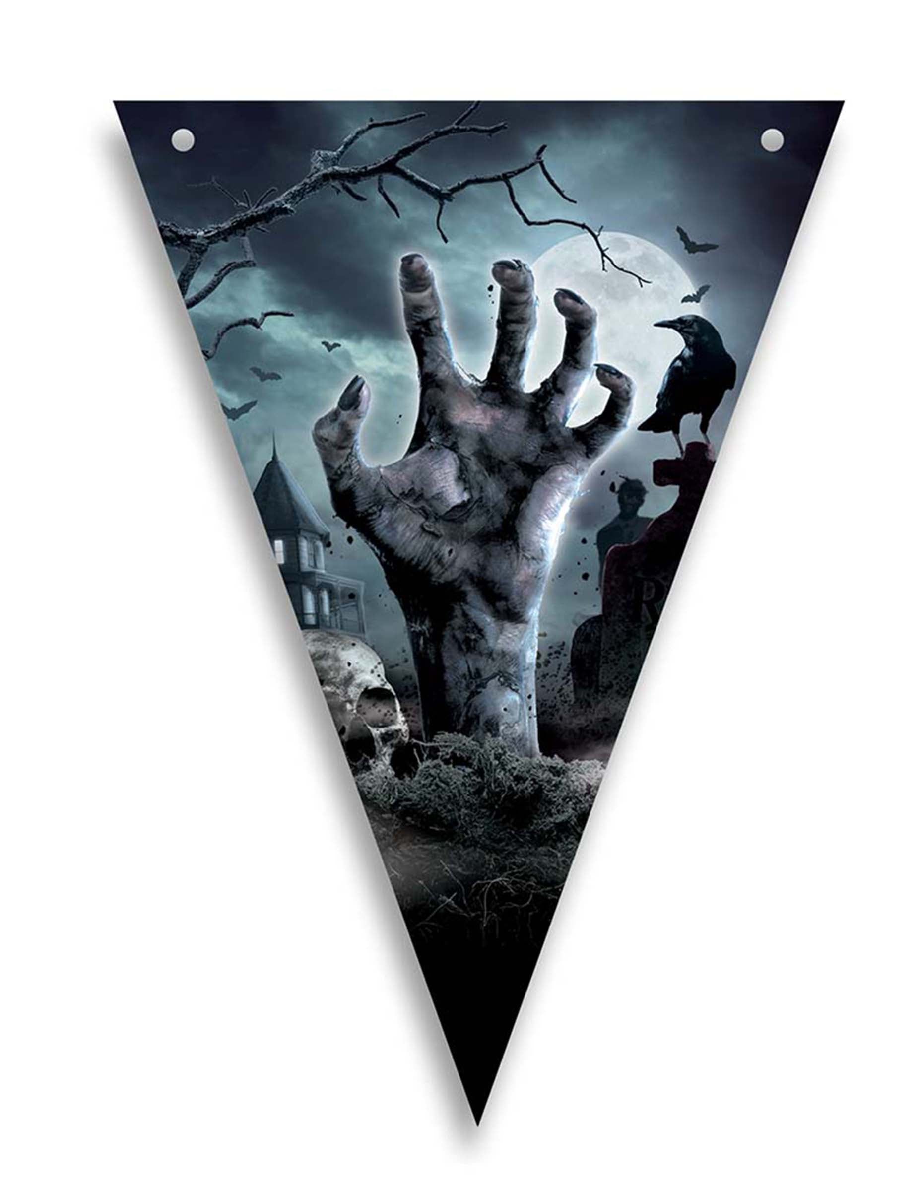 Tento cintorín zombie meria približne 300 cm. Každá vlajka meria približne 20 x 30 cm a predstavuje zombie ruku, ktorá vychádza zo Zeme. Girland je vyrobený z PVC, takže sa dá použiť zvnútra aj zvonka. Bude to perfektná dekorácia na strašidelnú Halloweenskú párty!