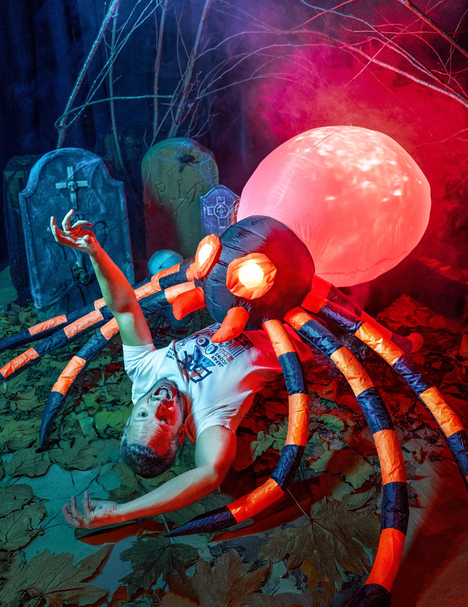 Táto svetlo a nafukovacia dekorácia predstavuje oranžový pavúk a meria približne 180 x 120 cm. Po zapálení pavúk napučia a jeho oči sa rozsvietia na strašidelné vykreslenie! Funguje s odvetvím. Táto jasná obrie dekorácia bude ideálna na vystrašenie vašich priateľov a na dokončenie dekorácie Halloweenu!