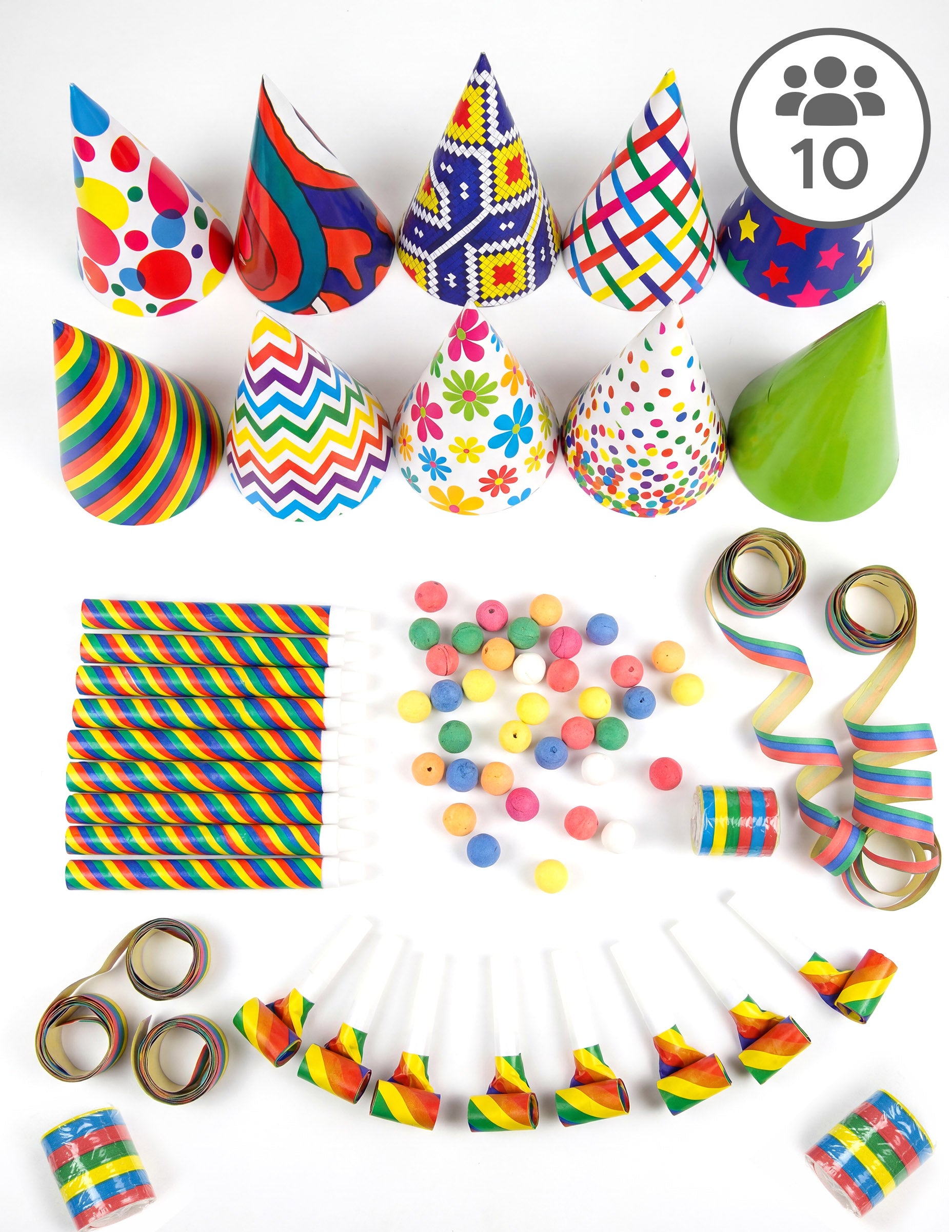 Toto balíček farebných párty darčekov obsahuje 10 klobúkov, 10 fúkačiek so 100 loptičkami, 10 párty dúchadiel a 30 stočených stužiek.