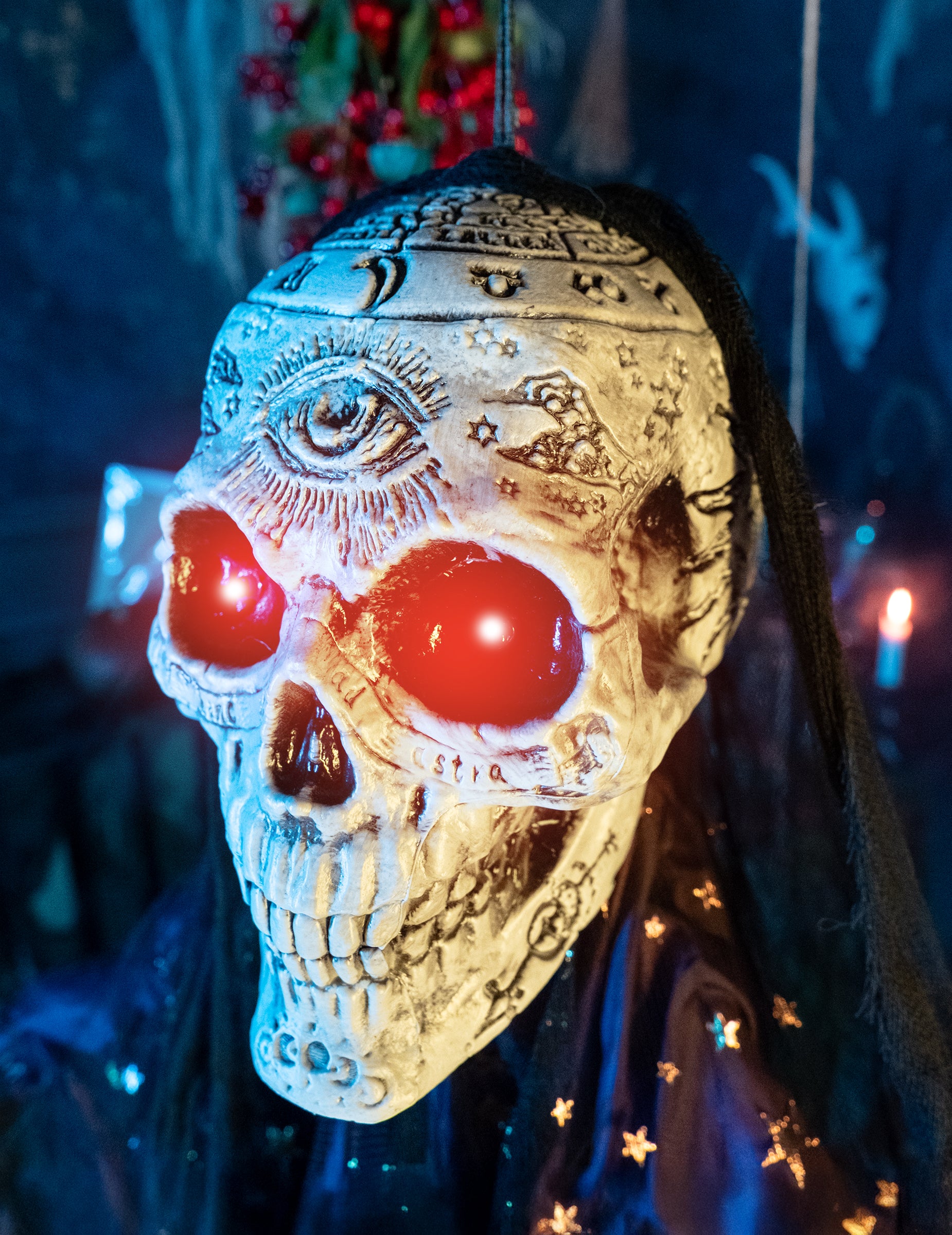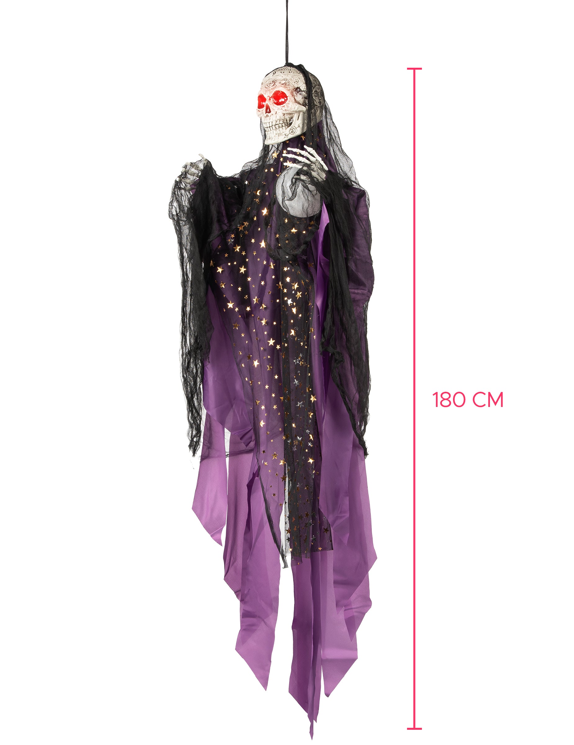 Táto kostra jasnej a zvukovej jasnanej jasnovidce je vysoká 180 cm. Táto zavesená dekorácia predstavuje kostru jasnovidce, zahalenú čiernym a fialovým závojom zdobeným hviezdnymi vzormi. Jeho lebka je vyrytá tajomnými symbolmi, ktoré vyvolávajú kúzla schopné zamrznúť vašu krv. Ak chcete rozsvietiť kostru, jednoducho prepnite spínač a ožije pri najmenšom hluku. Hlistôt sa uškrnul, jej oči sa rozsvietia červenou farbou a blesk, zatiaľ čo jej krištáľová guľa bude žiariť, aby odhalila vašu budúcnosť. Funguje s 3 batériami AAA (batérie nie sú zahrnuté). Táto dekorácia bude ideálna pre terorizujúcich okoloidúcich -počas večera Halloween.