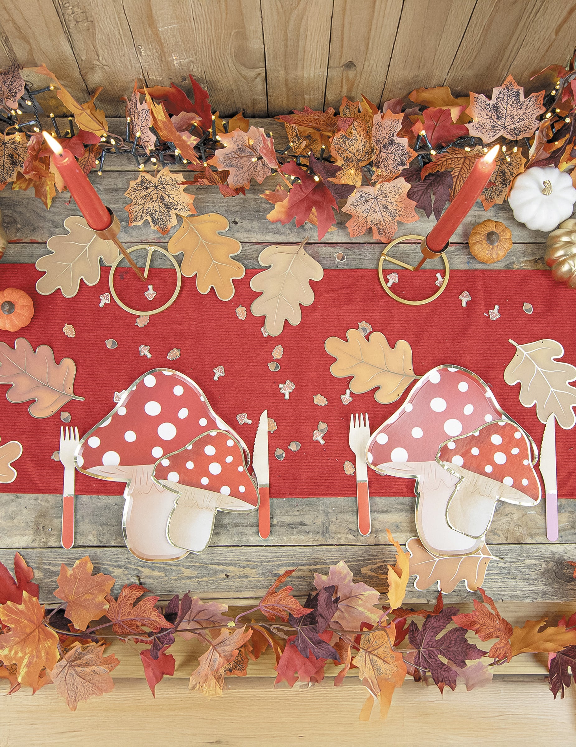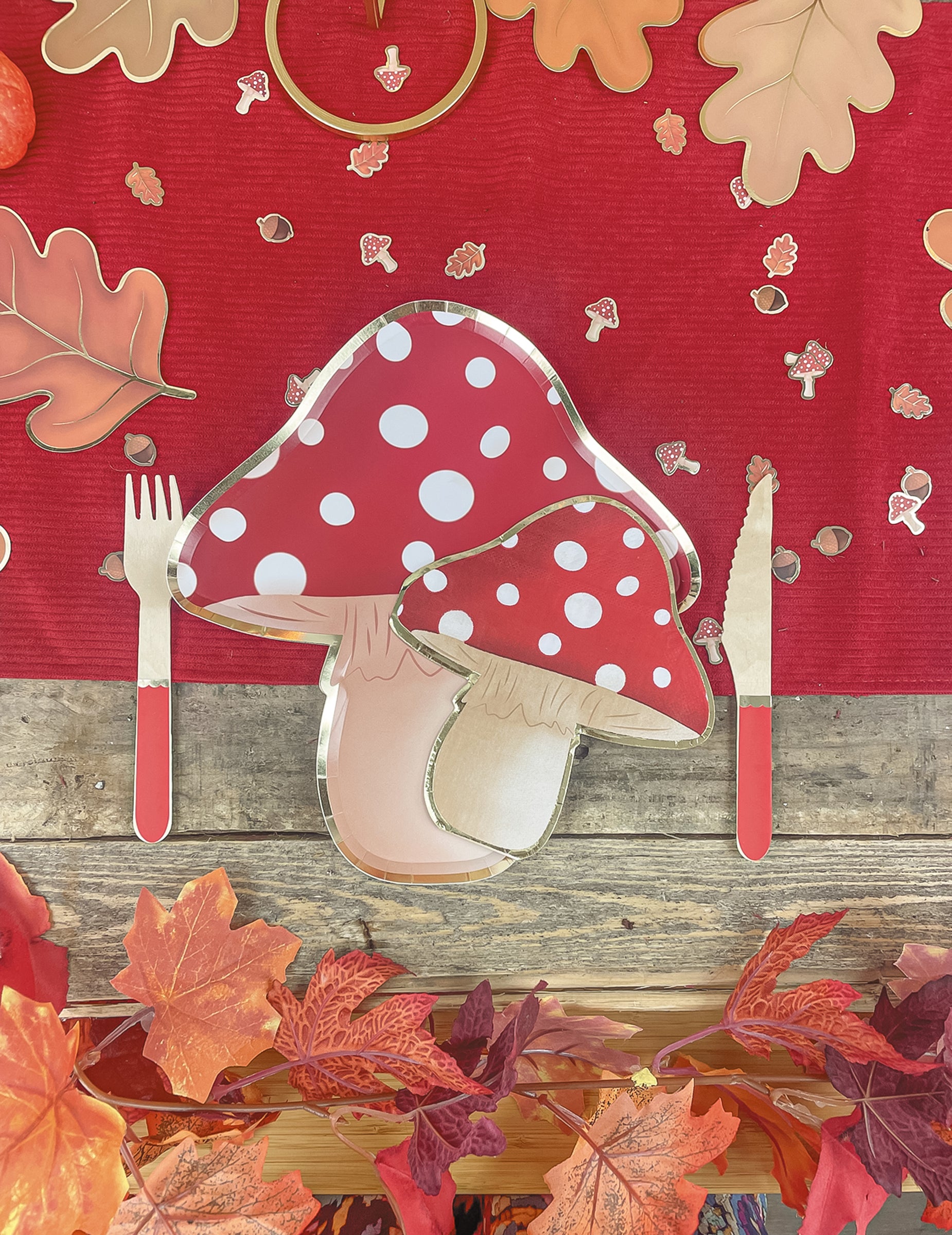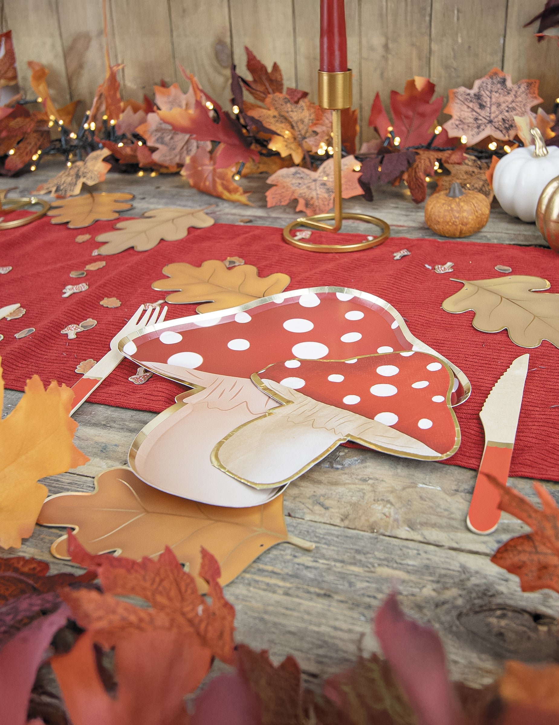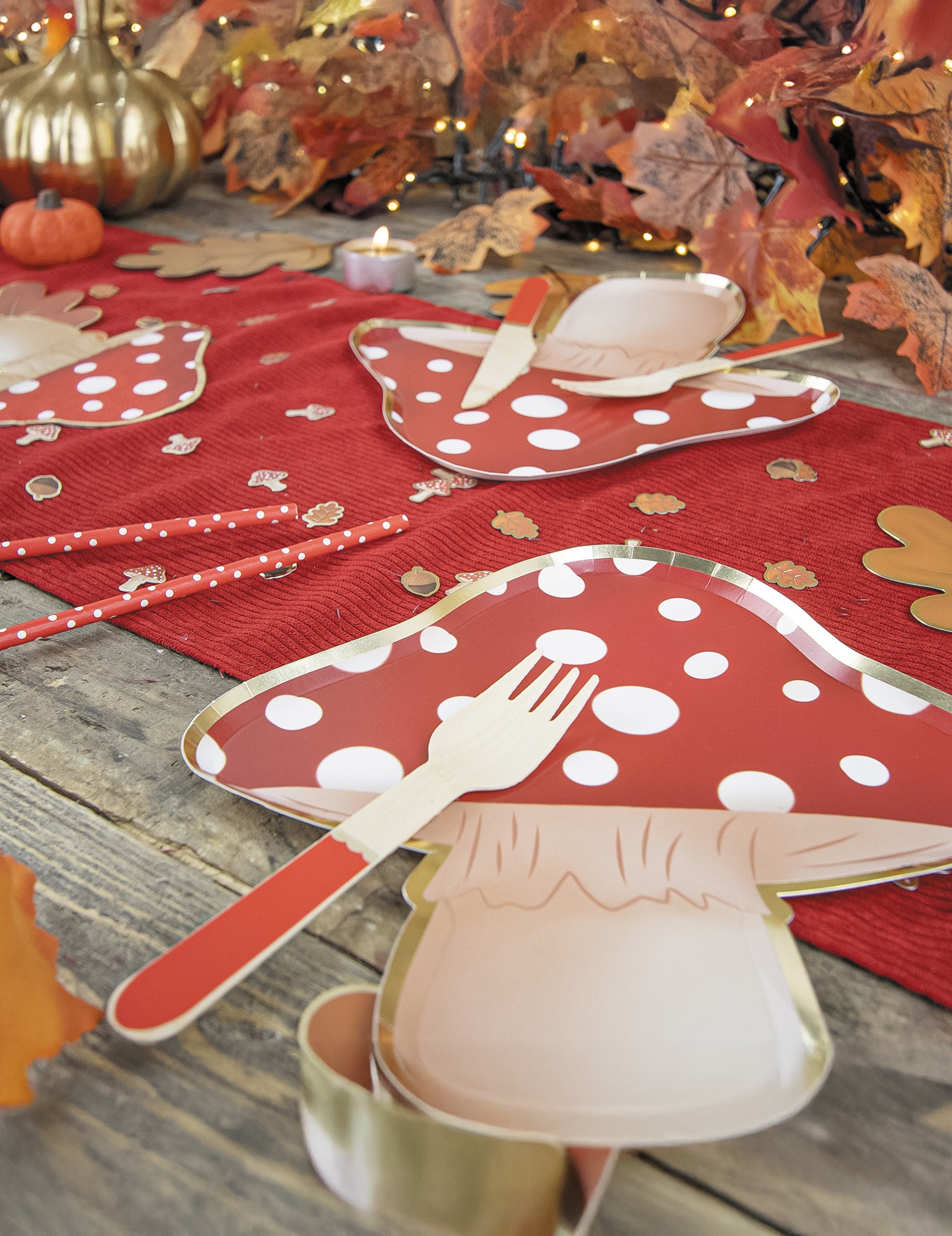 Prineste si na stôl magickú atmosféru s touto sadou 8 kusov kartónové taniere tvarovaný hrachová hubaMeranie 23 cm, Vyznačujú sa elegantným zlatým lemom, ktorý zvýrazňuje ich dizajn. taniere s hubami sú ideálne pre dekorácia na tému lesz jeseň alebo osláviť narodeniny a Vianoce s originalitou.