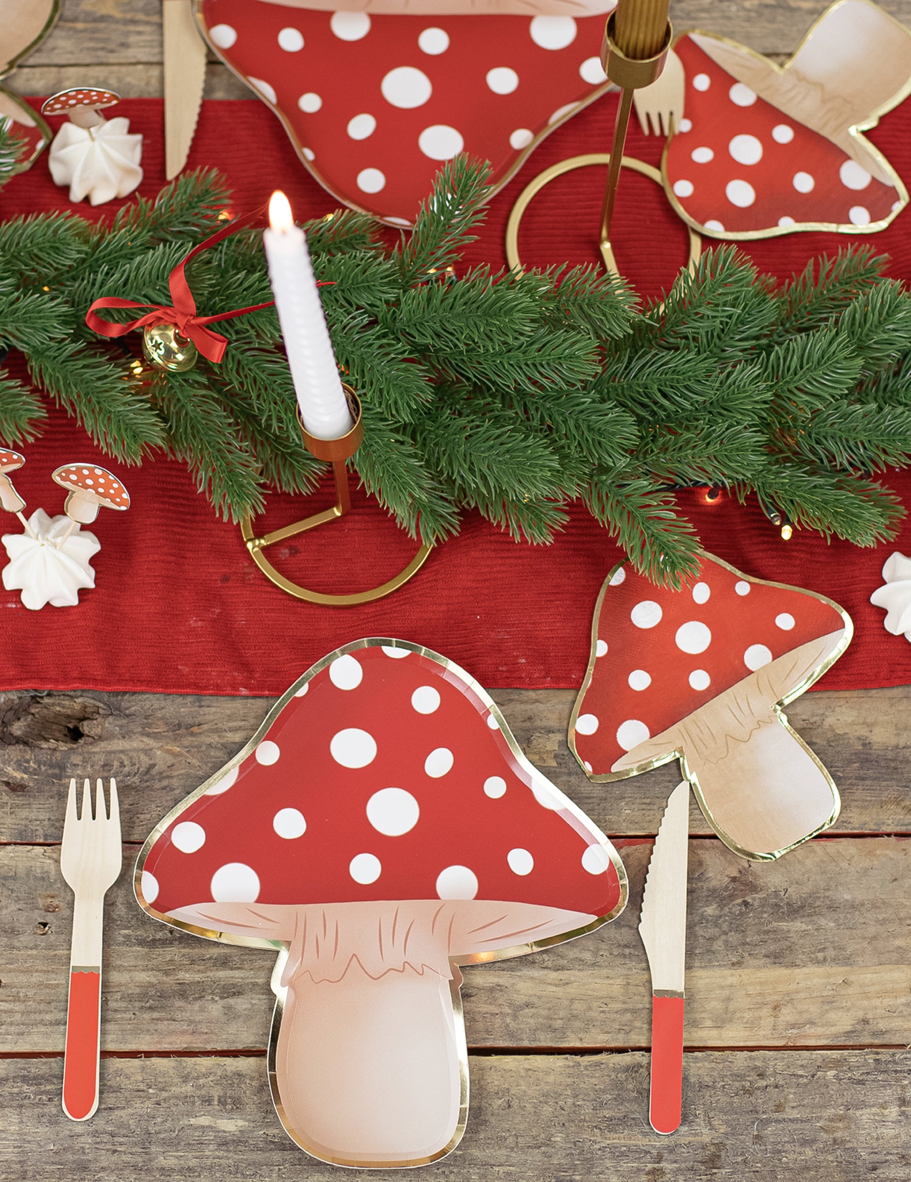 8 červených a bielych kartónových tanierov v tvare húb 23 cm bodky
