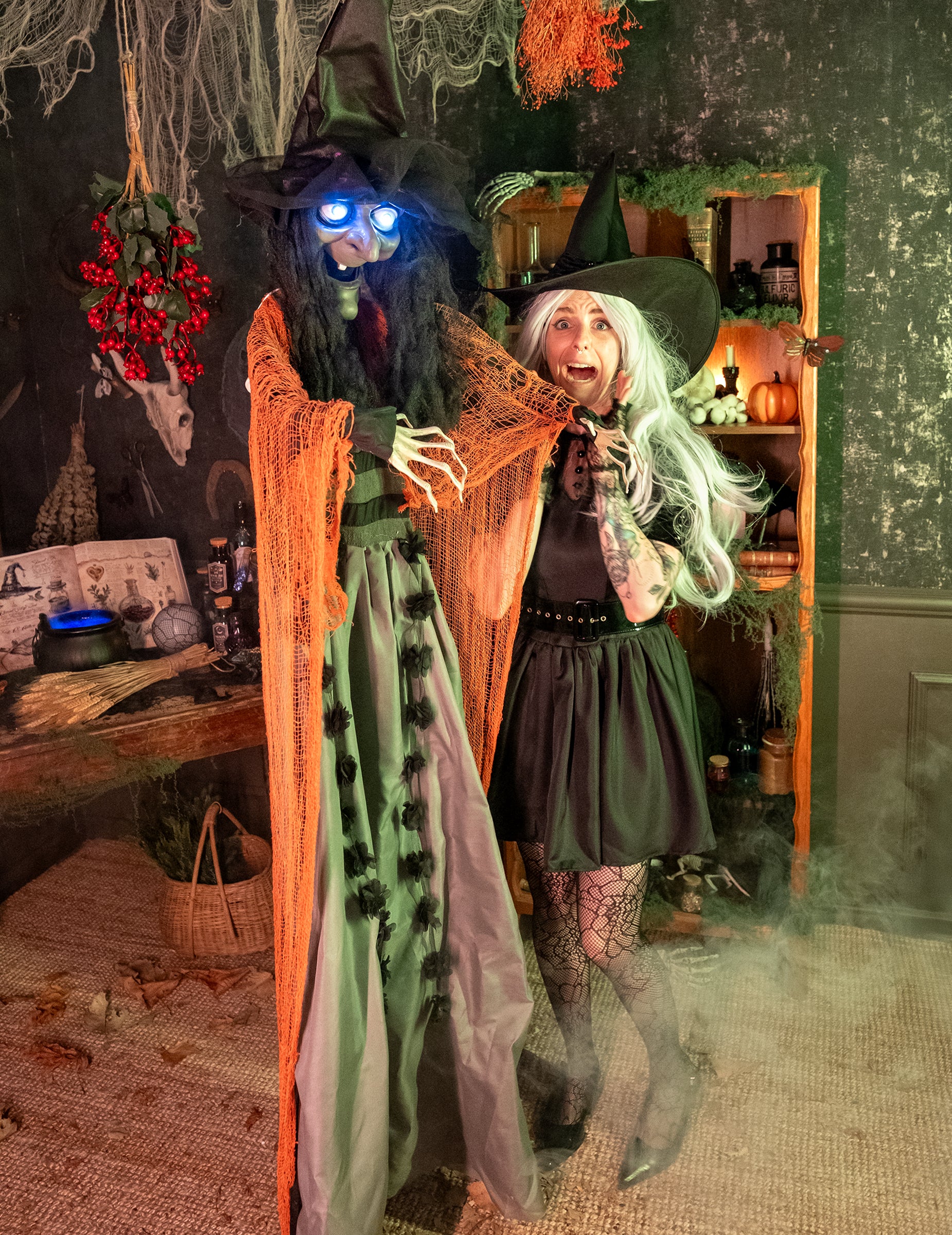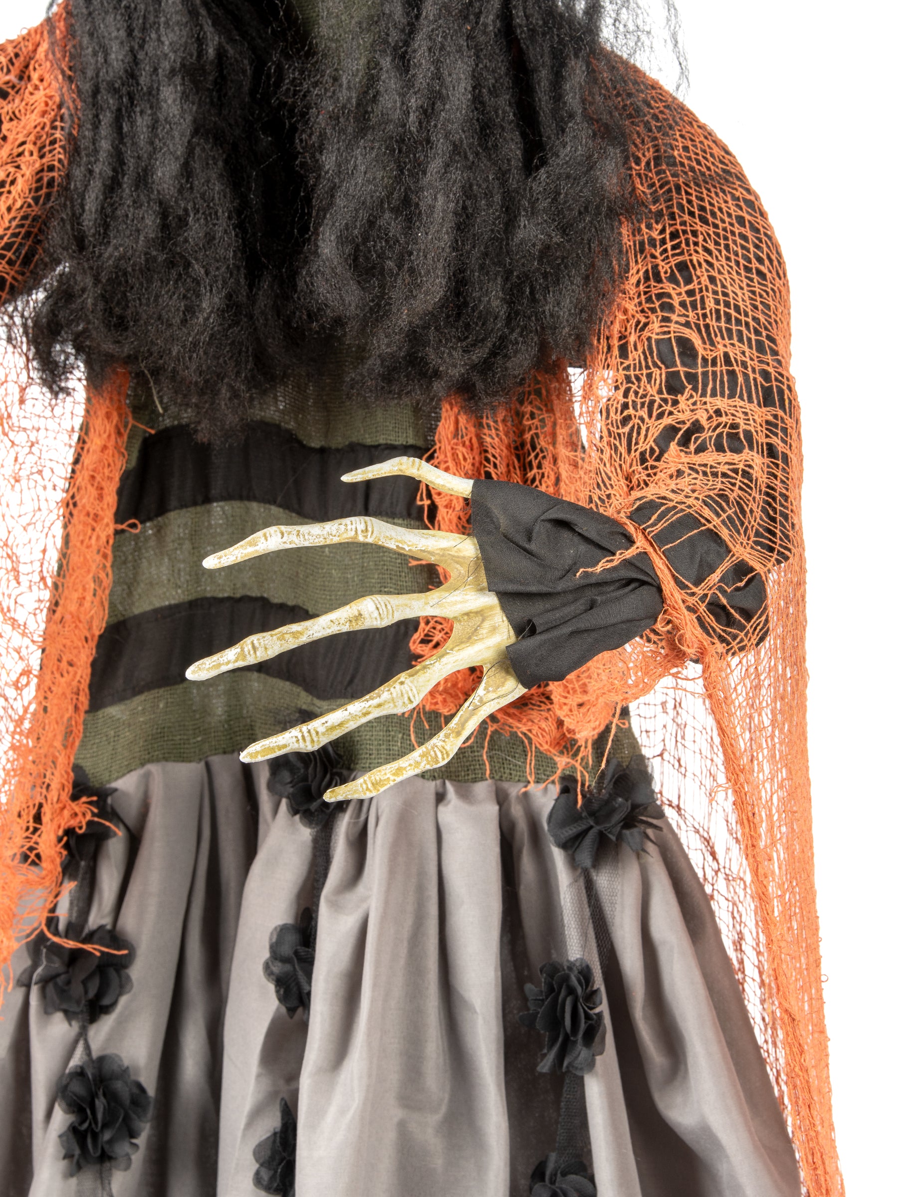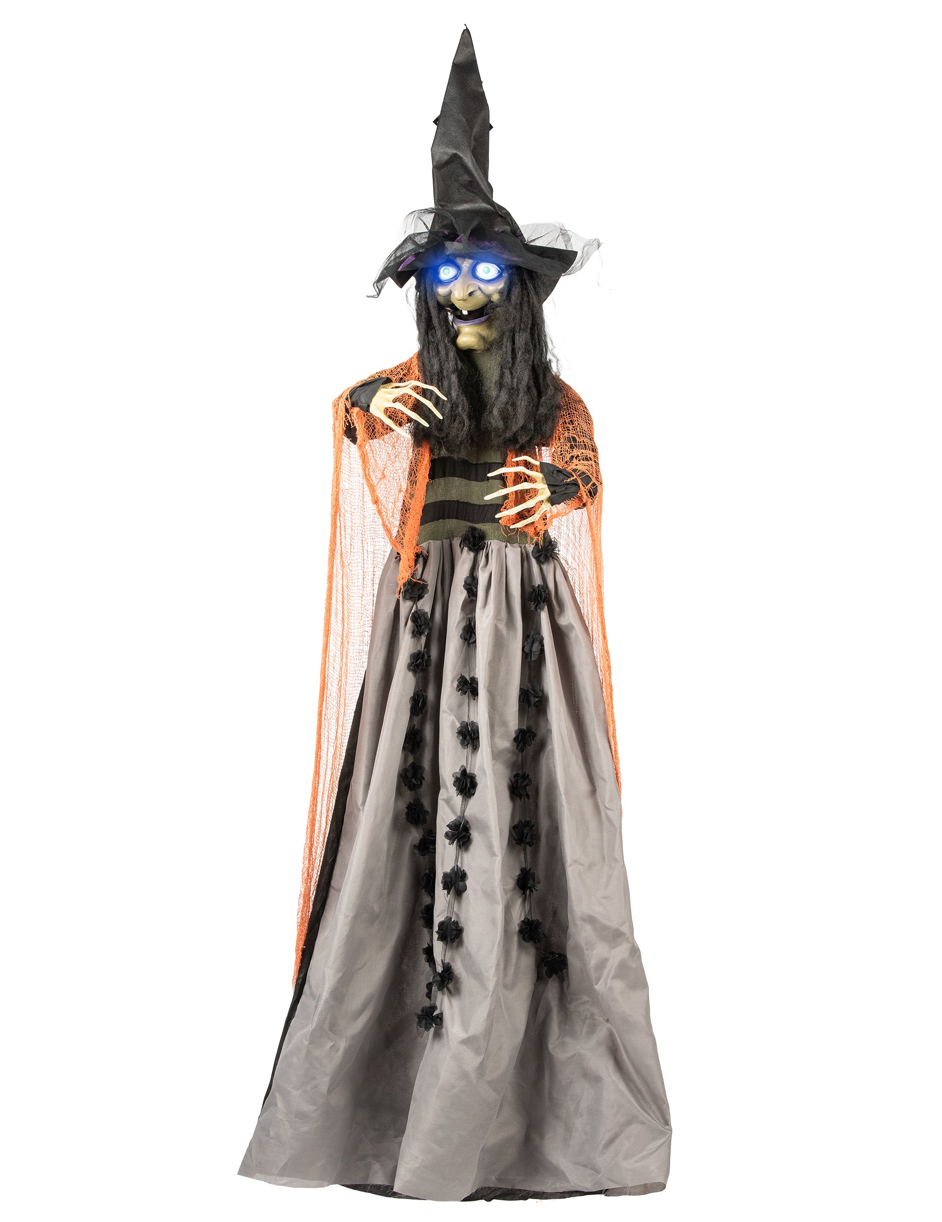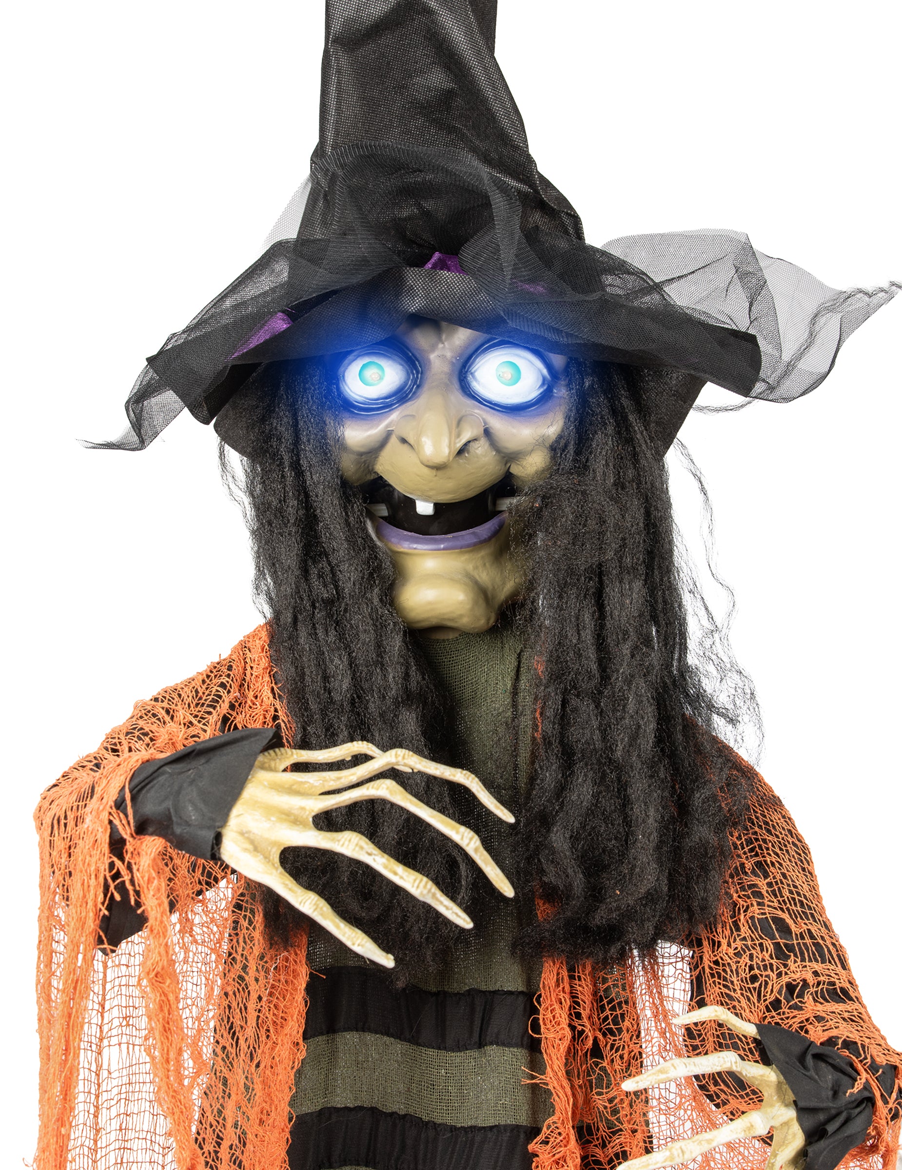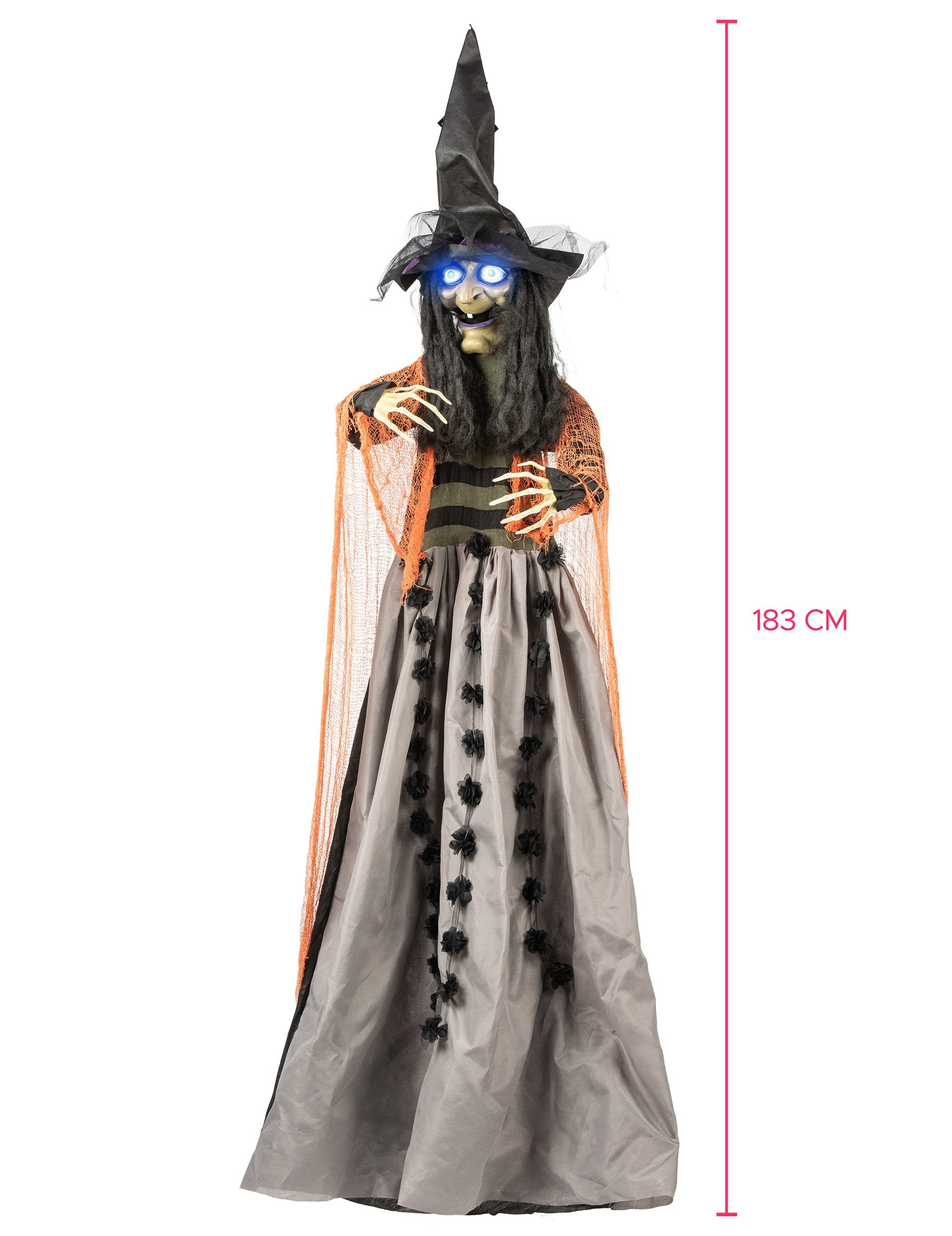 Táto 1,8 metra vysoká animovaná zvukovo-svetelná dekorácia zobrazuje strašidelnú visiacu čarodejnicu, ideálna na Halloween alebo hororovú párty. Vďaka svojej svietiacej tvári a žiariacim očami vytvára strašidelnú atmosféru. Animované pohyby a desivé zvukové efekty oživujú túto čarodejnicu a dodávajú vašej výzdobe interaktívny a strašidelný nádych. Jej čierny outfit, pozostávajúci zo špicatého klobúka, zlovestných šiat a roztrhaného závoja, umocňuje jej hrozivý vzhľad. Je ideálna na prekvapenie vašich hostí a vylepšenie halloweenskej atmosféry, ľahko sa zavesí a vytvorí výrazný efekt. Táto animovaná visiaca čarodejnica je perfektnou voľbou pre úspešnú halloweensku dekoráciu. Umiestnite ju pri vchode alebo do tmavého rohu, aby ste svojim návštevníkom zabezpečili zimomriavky! Vyžaduje 3 batérie typu AAA (nie sú súčasťou balenia).