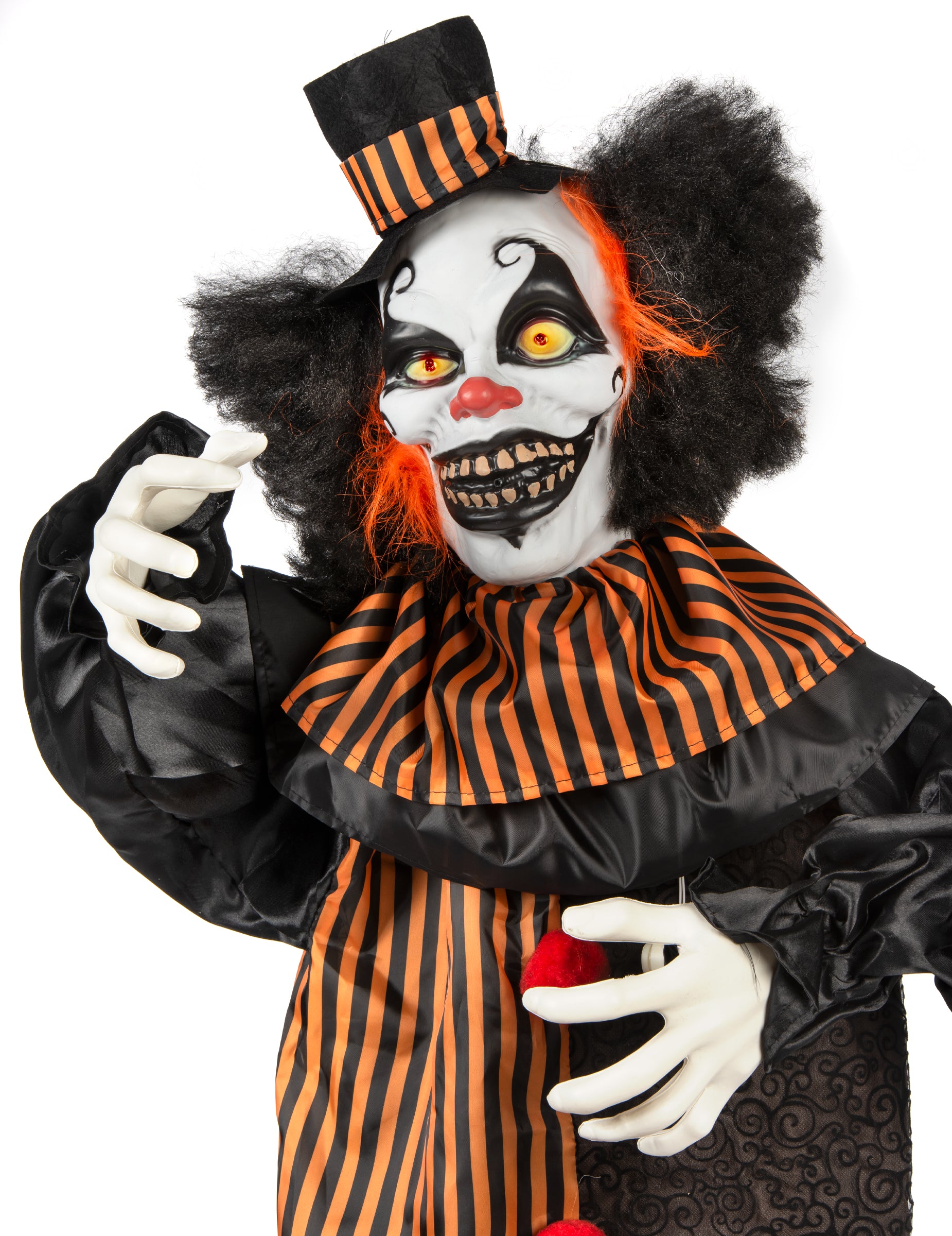 So svojimi 170 cm Tento animovaný klaun svojou znepokojujúcou prítomnosťou púta pozornosť. Jeho zlovestný mejkap, ostré zuby a tmavo pruhovaný odev z neho robia desivého tvora. Aktivuje sa zvukom: pohybujú sa mu ruky, otáča sa hlava, rozsvietia sa mu červené oči a miestnosťou sa ozýva prenikavý výkrik. Vyžaduje 3 batérie typu AA (súčasťou balenia). Ideálne na vytvorenie strašidelnej atmosféry vo vašich halloweenskych dekoráciách.