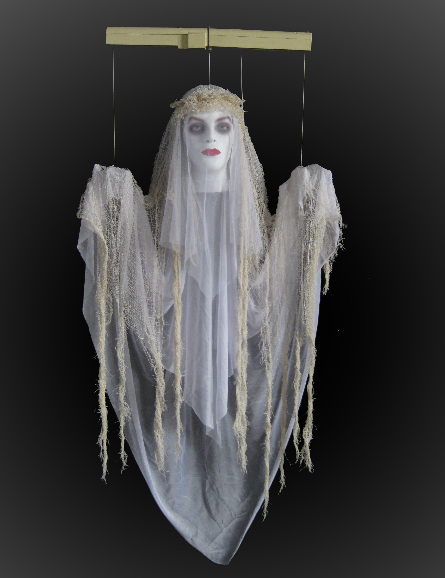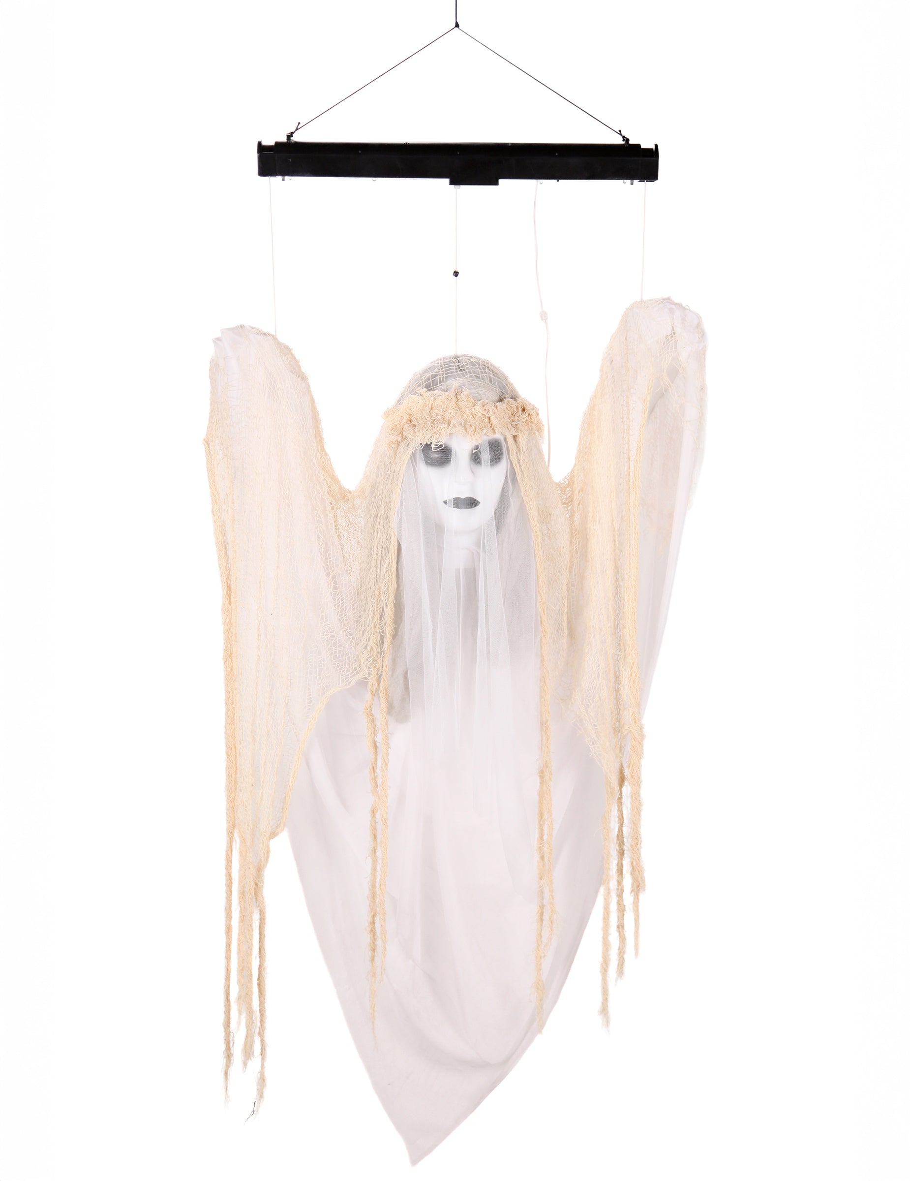 Ce fantôme suspendu animé descend et remonte lentement dans les airs, donnant l’impression de flotter entre deux mondes. Son drapé blanc vieilli, ses cheveux en lambeaux et son regard vide renforcent sa dimension effrayante. Il mesure environ 120 x 65 cm. Dès qu’un son est détecté, son corps se met à bouger verticalement, accompagné d’un cri spectral qui résonne dans la pièce. Fonctionne avec 4 piles AA (non incluses). Idéal pour créer une ambiance surnaturelle digne des maisons les plus hantées.
