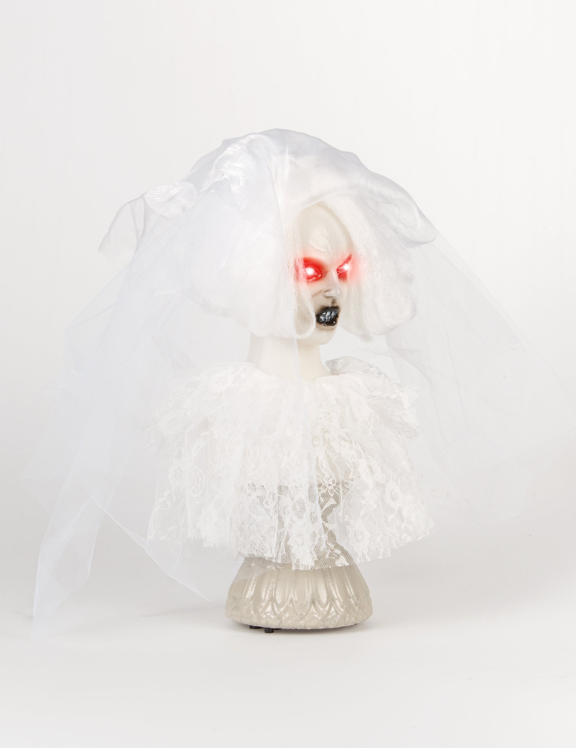 S bielymi závojmi a bledou tvárou, táto prízračná nevesta pri stole 40 cm Zdá sa, že zamrzne medzi dvoma svetmi. Jeho žiarivé červené oči prerážajú tmu pri najmenšom zvuku, sprevádzané mrazivým výkrikom. Umiestnený na príborníku alebo konzolovom stolíku ponúka zaručený chladivý efekt v malej veľkosti, ktorá sa ľahko integruje do vášho interiéru. Vyžaduje 3 batérie AAA (súčasťou balenia). Perfektná voľba na vytvorenie makabróznej atmosféry v interiéri.
