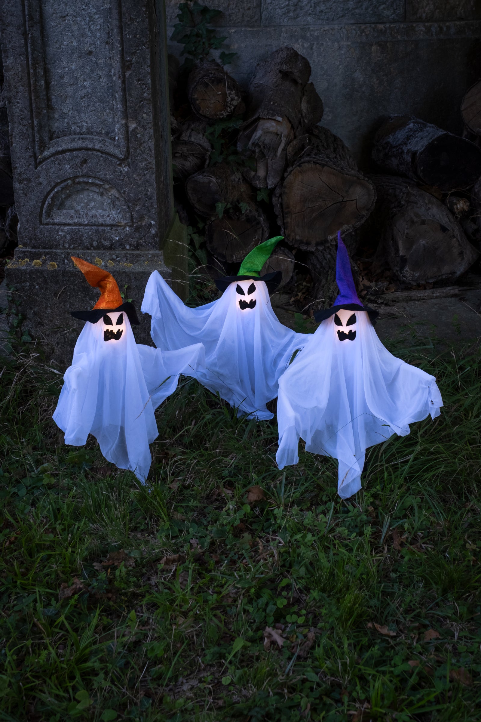 Vďaka svojim leteckým tvarom priťahujú všetky oči títo 3 duchovia na vkladoch. Každá postava nosí farebný špicatý klobúk a odhaľuje osvetlenú tvár, pre magický efekt, keď spadne noc. Jednoduchý stlačte spínač stačí na to, aby ich hlavy žiarili a vytvorili perfektnú atmosféru pre vaše večery Halloween. Usporiadajte po príjazdovej ceste alebo pred dverami, aby ste privítali, ktoré je také zábavné, ako je desivé. Pracuje na 3 batériách AA (nie je súčasťou). Jednoduchá a efektívna voľba pre úspešnú exteriérovú dekoráciu.