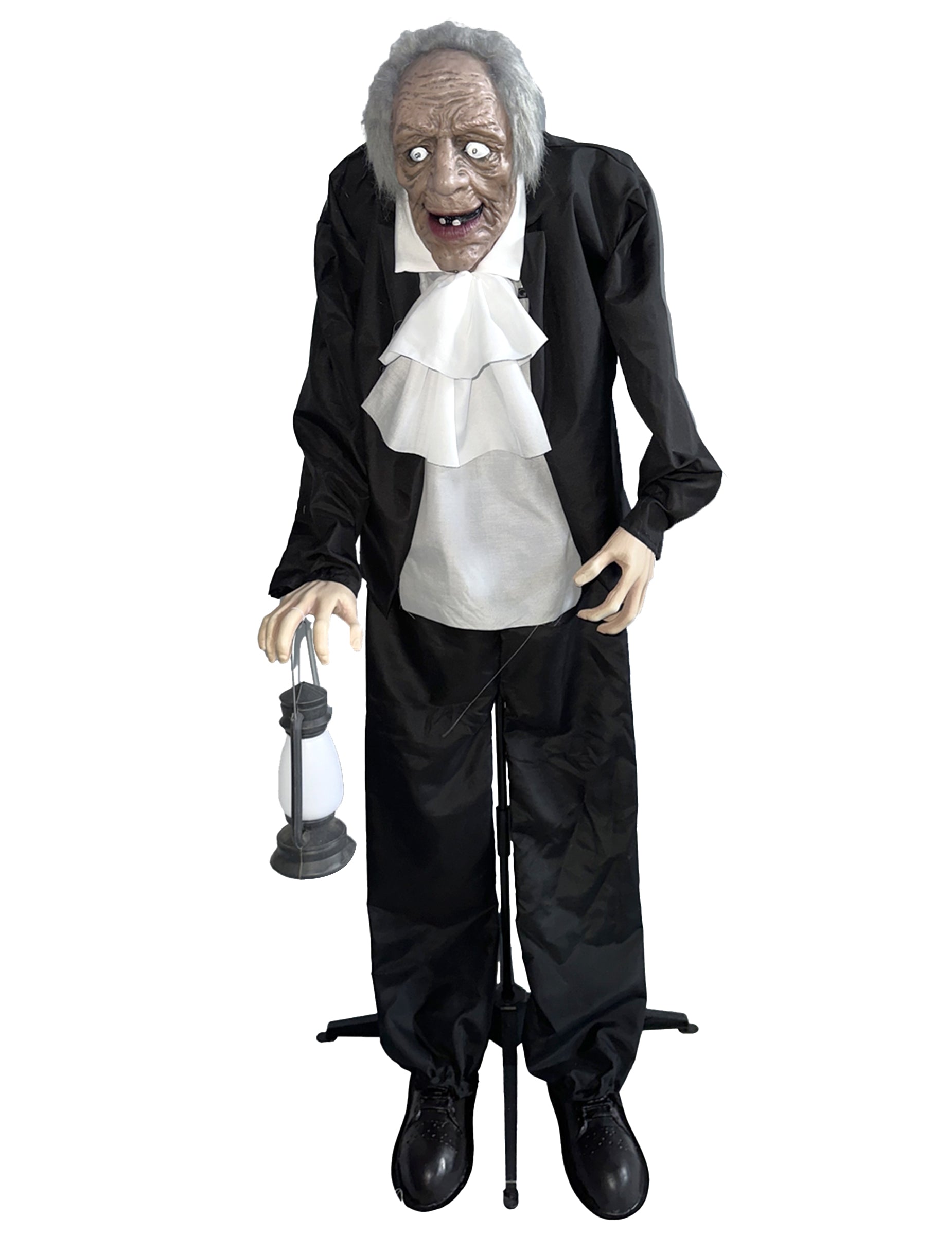 Ce Gardien Maudit avec Lanterne, de 158 x 120 cm, donne l’étrange sensation de veiller sur un lieu abandonné. Son visage inquiétant, ses traits fatigués et sa silhouette voûtée inspirent aussitôt la méfiance. Revêtu d’un habit sombre contrasté par une chemise à volants, il brandit une lanterne lugubre prête à s’illuminer. Lorsqu’un bruit se fait entendre, un cri sinistre se déclenche, comme si une malédiction venait de s’éveiller. Il suffit de 5 piles AA (non incluses) pour activer cette présence macabre, idéale pour une mise en scène immersive et terrifiante.