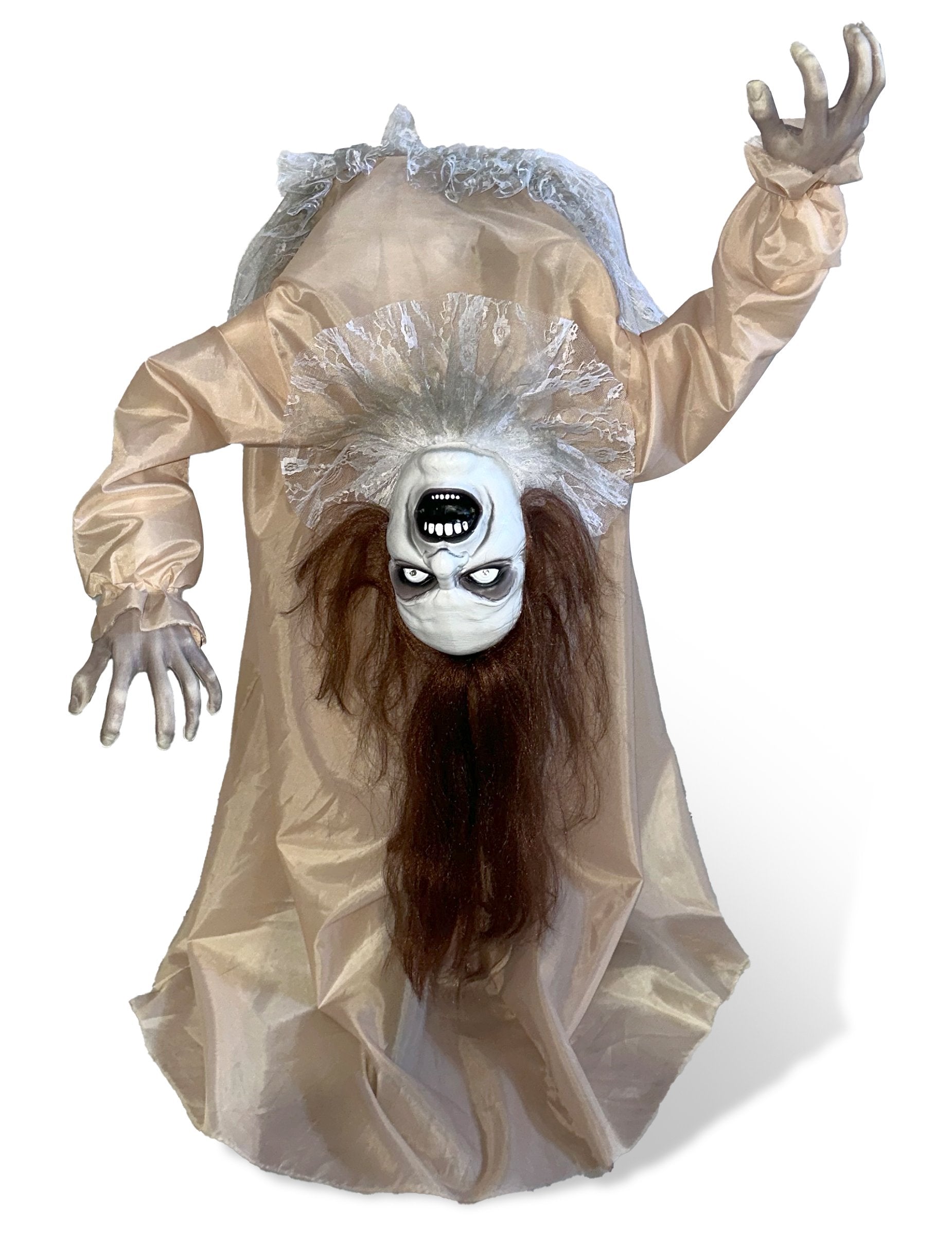 Avec sa posture renversée et sa robe longue et pâle, cette Dame Maudite animée offre une scène saisissante. Elle mesure 130 cm x 70 cm. Son visage figé dans une expression macabre, ses yeux lumineux et sa chevelure en désordre évoquent un esprit vengeur en pleine manifestation. Dès qu’un bruit se fait entendre, elle s’agite lentement dans un mouvement inquiétant, tandis qu’un cri sinistre résonne dans l’air. La décoration fonctionne avec 4 piles AA non incluses Un élément décoratif idéal pour créer une ambiance sinistre lors d’une fête costumée ou pour effrayer vos visiteurs le soir d’Halloween.