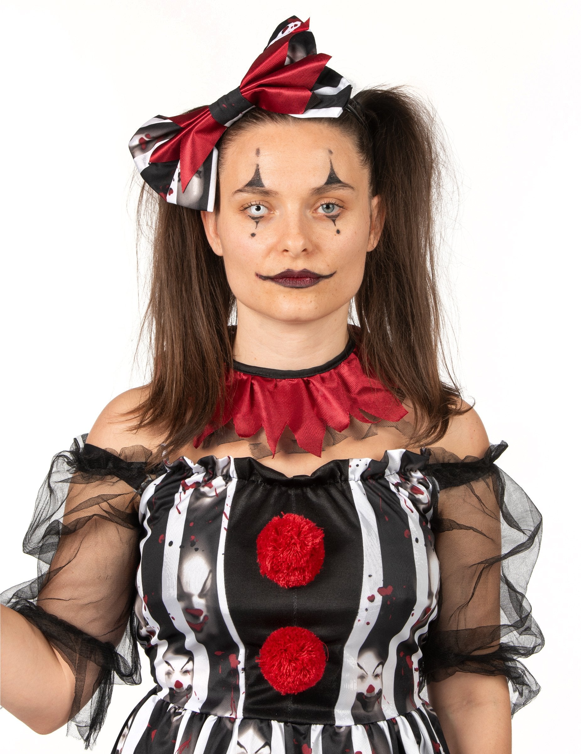 Tento šialený kostým pre ženy v luxusnej verzii obsahuje šaty, golier, spodničku a čelenku luku. Krátke, namontované šaty, zdobené čiernymi a bielymi pruhmi a rušivými klaunskými motívmi, sú zvýraznené čiernymi rukávmi tylu, ktoré dodávajú eleganciu. Červené pompomy na poprsie spomínajú na tradičný štýl klauna. Zodpovedajúci golier elegantne zdôrazňuje krk, zatiaľ čo spodnička dáva úľavu oblečeniu pre desivý účinok. Čelenka s veľkým lukom prináša do tohto strašidelného kostýmu posledný nádych šialenstva. Ideálna voľba pre Halloween, luxusné šaty alebo zasievanie teroru s nočným morom klaunového vzhľadu!