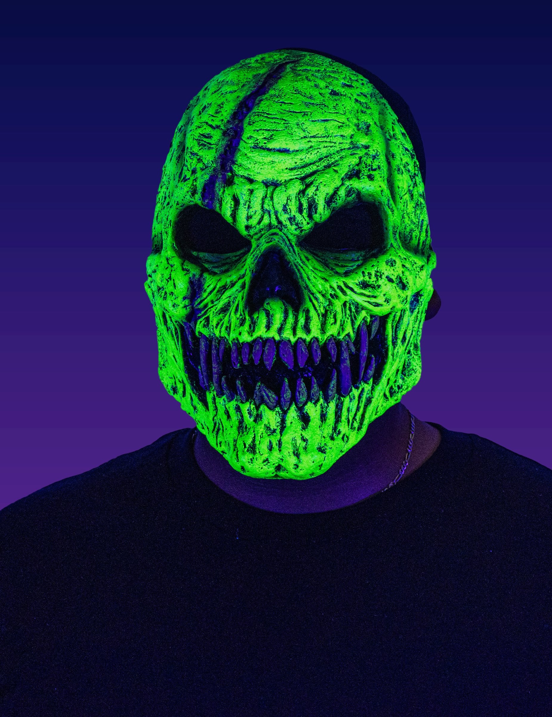 Táto zelená démonická kostra napoly maska ​​ponúka desivý vzhľad so tvarovaným kostným efektom, ghoulishom a fialovými detailmi označenými hlbokými jazvami. Jeho dutý nos a duté oči posilňujú jeho zlovestný vzhľad. Strašidelná funkcia: Táto maska ​​reaguje na čierne svetlo a rozsvieti sa s neónovou zelenou žiarením, ktorá je ideálna pre ešte intenzívnejšiu atmosféru v tme! Táto ľahká maska ​​sa ľahko nosí, pripevňuje sa k zadnej časti hlavy a necháva ústa pre optimálne pohodlie. Ideálne pre Halloween alebo na párty s hrôzou, zaručuje výrazný efekt deň alebo noc!