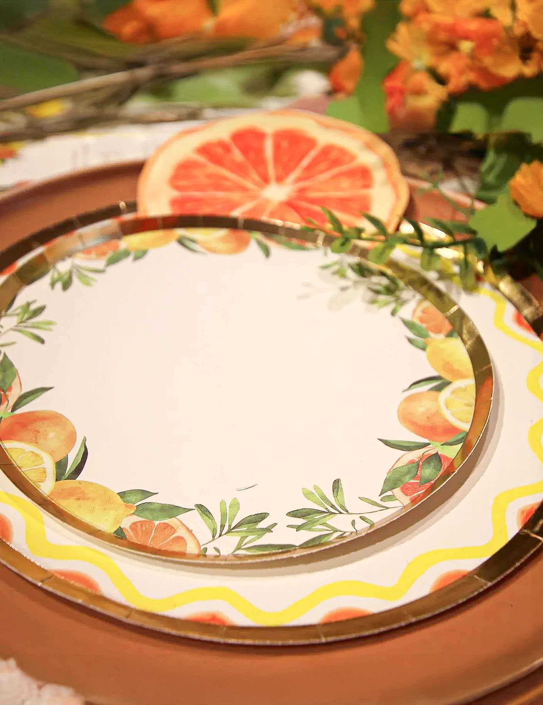 8 malých citrusových kartónových tanierov Fizz, krémové, oranžové, žlté a zlaté, 18 cm, ovocná dekorácia
