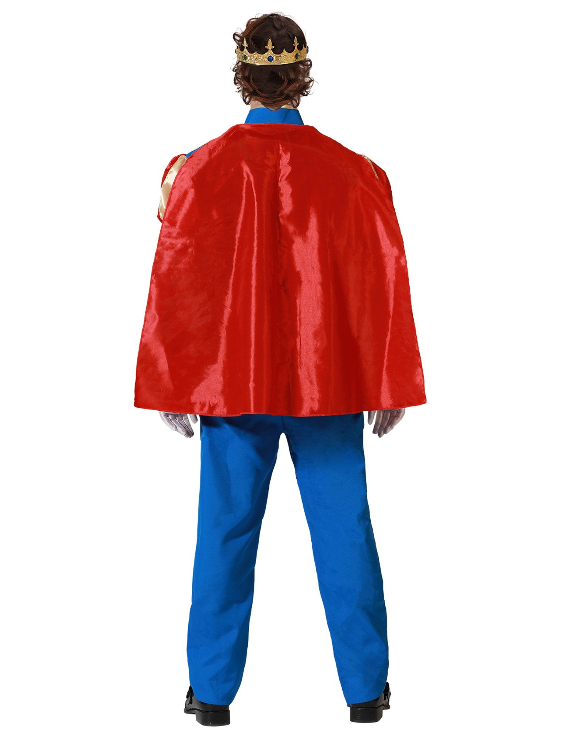 Tento kostým kráľovského princa pre dospelých obsahuje štruktúrovaný vrchol, zodpovedajúce nohavice, čierny pás a Regal Red Cape. Modrý vrchol s dlhým rukávom je zdobený zlatými detailmi a dekoratívnymi epaletami pripomínajúcimi uniformu ušľachtilých dôstojníkov. Červené a biele pásy vylepšujú rukávy a dodávajú dotyk kráľovskej prítomnosti. Dokonale koordinované nohavice zaisťujú elegantnú siluetu. Pás so zlatou prackou zvýrazňuje pás a dodáva dokončovaciu dotyk ceremoniálnej uniforme. Nakoniec saténový červený mys pripojený k ramenom poskytuje impozantný a divadelný pohľad na celok. Ideálne na vládnutie na dráhe počas karnevalu, tematického večera alebo kostýmu.