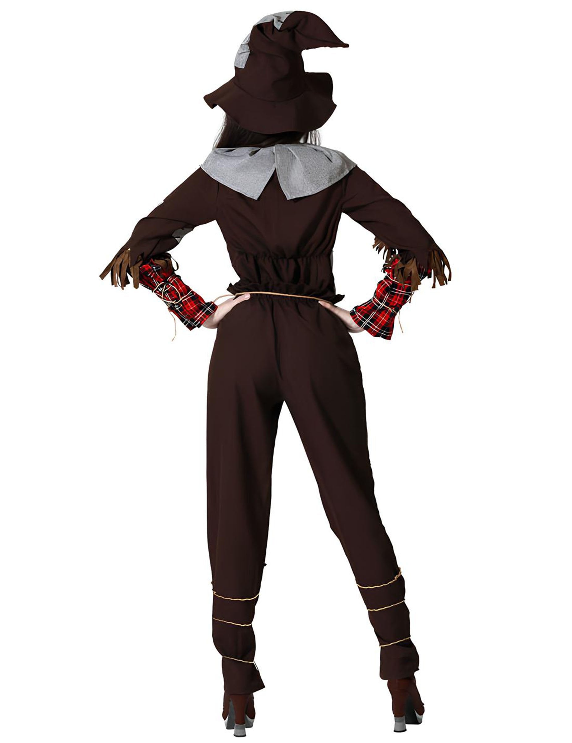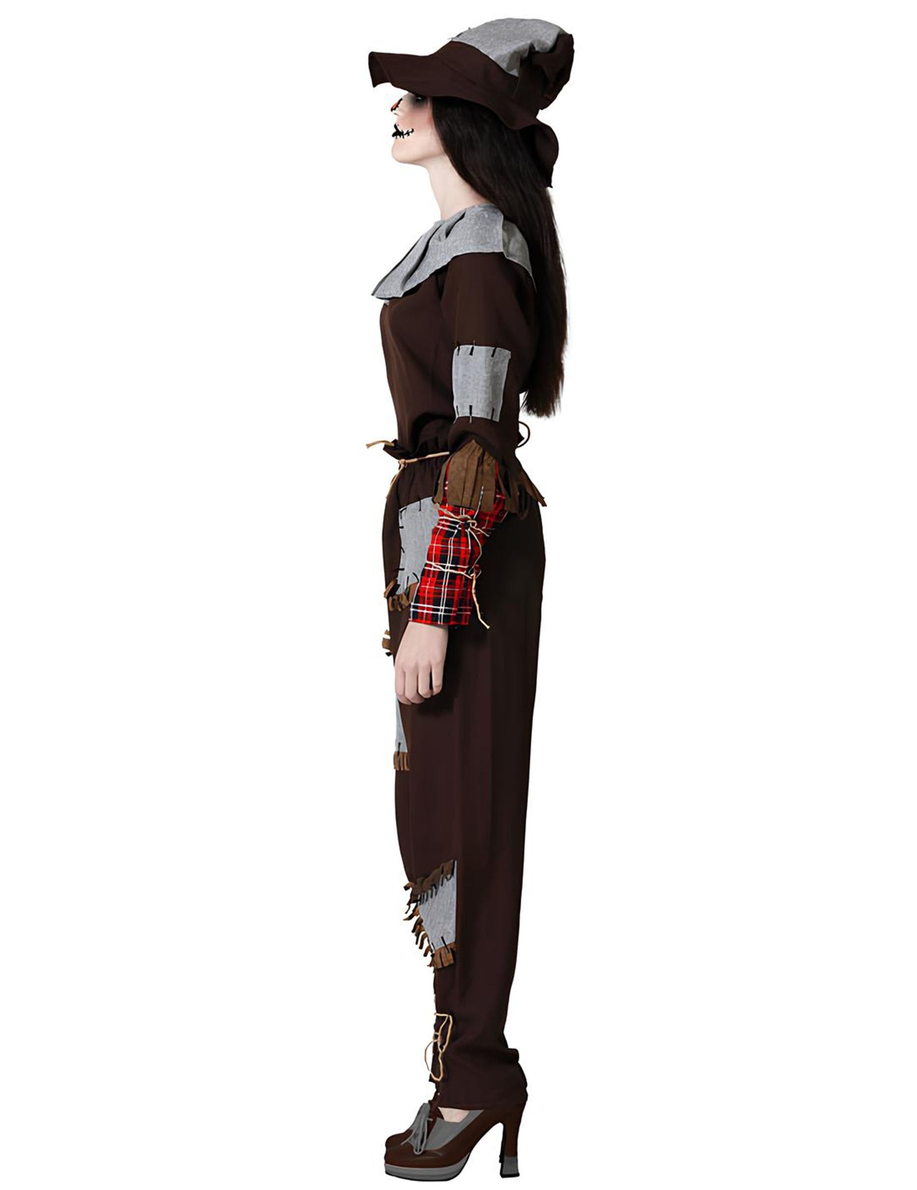 Ce déguisement d’épouvantail pour femme comprend un haut effet patchwork, un pantalon assorti, une ceinture à nouer et un chapeau pointu. Le haut marron est orné de motifs écossais aux manches et de fausses pièces cousues, pour un rendu déchiré et vieilli. Il est composé d'un col large de couleur grise. Le pantalon reappelle le haut, avec des empiècements gris, pour un look coordonné jusque dans les moindres détails. La ceinture permet de souligner la taille et de structurer la silhouette. Le chapeau, souple et tordu, complète à merveille cette tenue de créature des champs. Idéal pour Halloween, une soirée à thème ou le Carnaval, ce costume vous transformera en un épouvantail aussi mystérieux que stylé.
