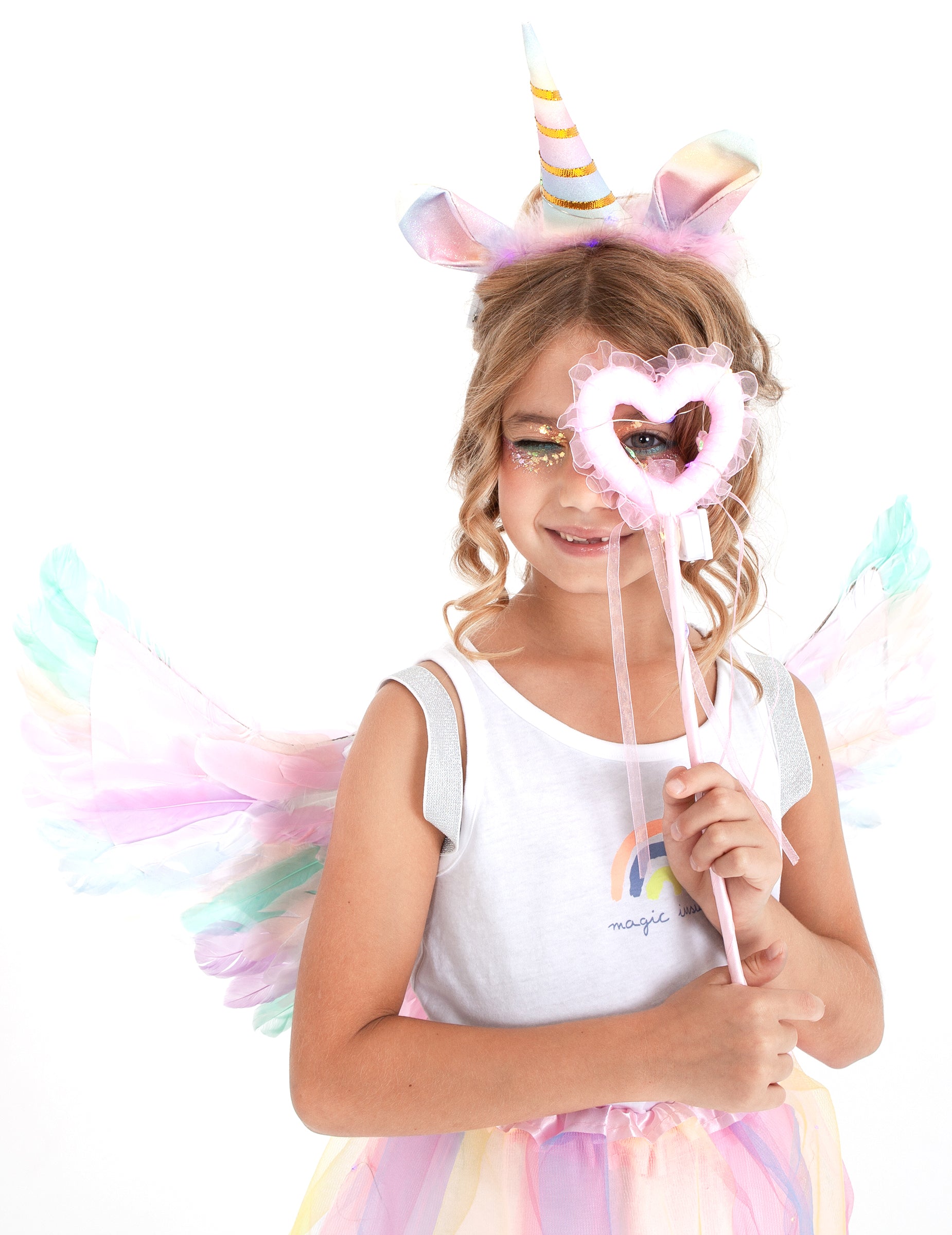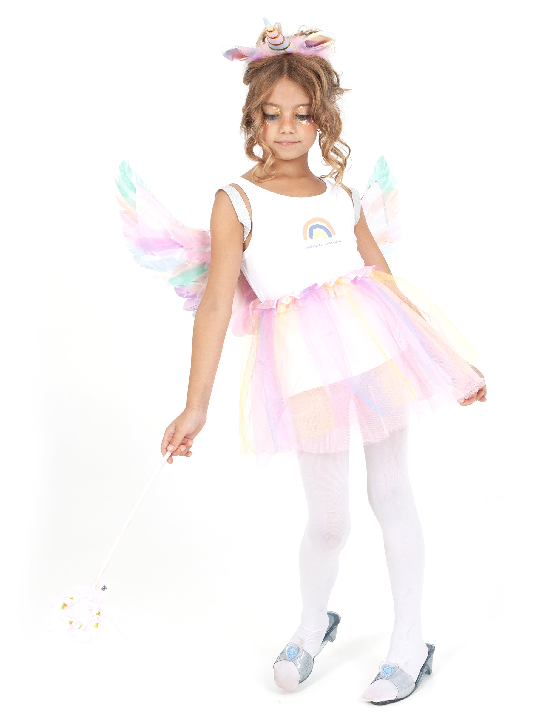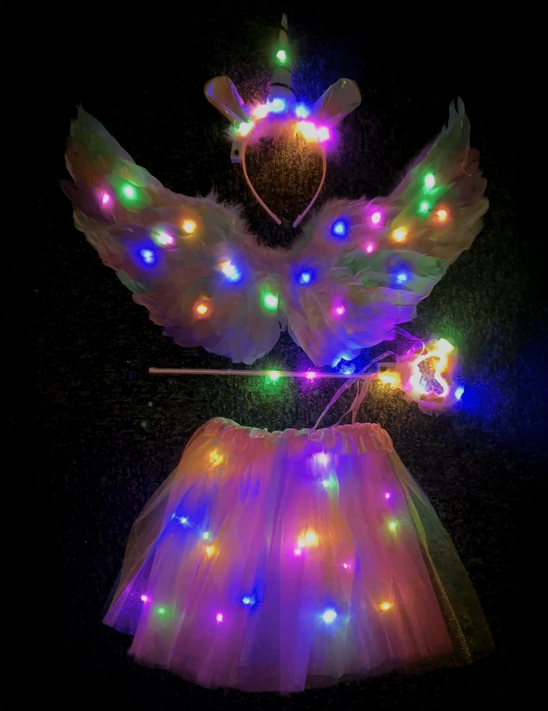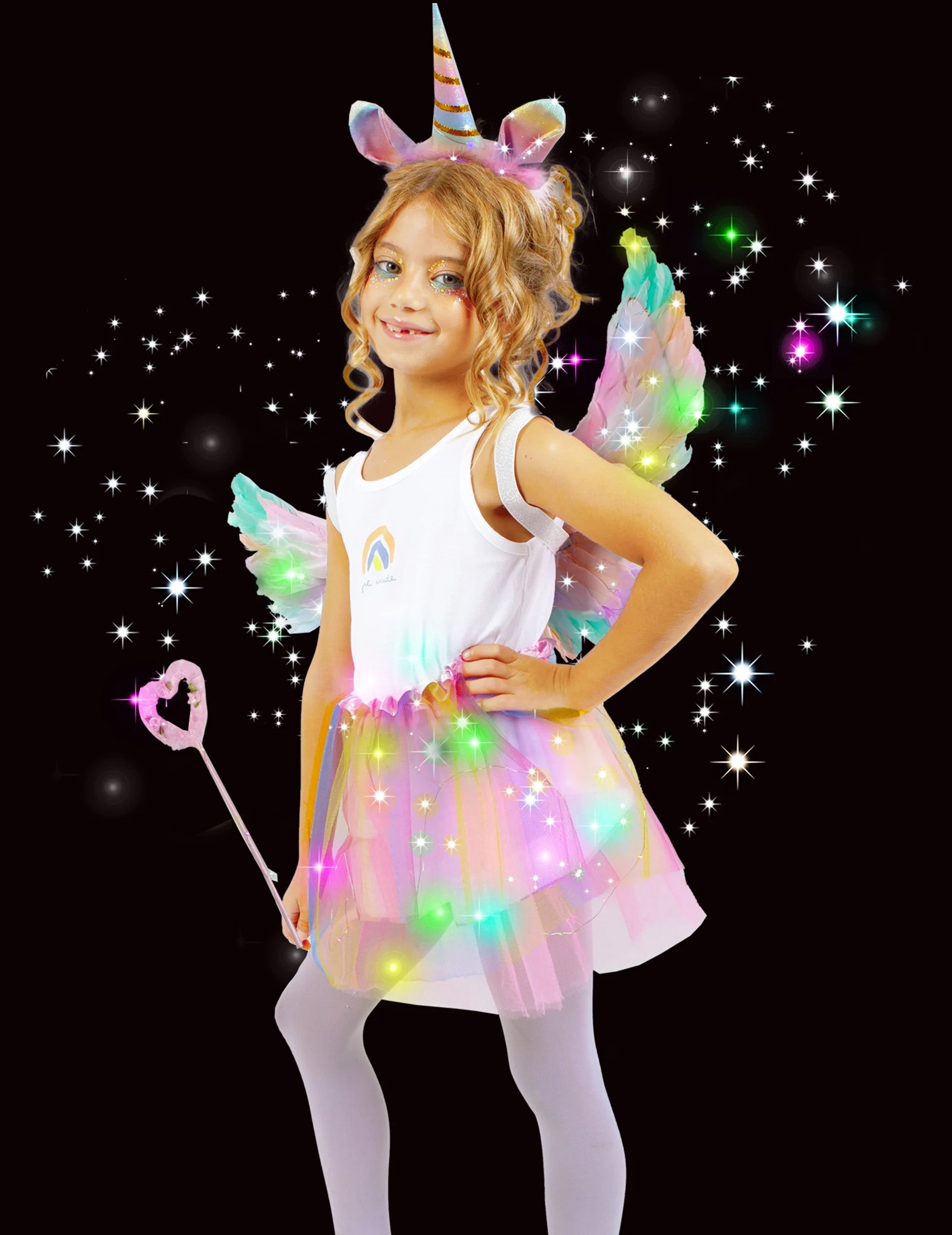 Ce kit de déguisement licorne lumineux pour fille est une véritable invitation à l'enchantement. Il se compose d’un tutu multicolore, de magnifiques ailes irisées, d’un serre-tête licorne orné d’une corne scintillante et d’une baguette féerique à cœur. Le système lumineux intègre des LEDs multicolores pour un effet féerique à chaque mouvement. L’activation des lumières se fait facilement grâce à un petit bouton ON/OFF discret placé sur chaque élément. Trois modes d’éclairage sont disponibles : clignotement rapide, lent ou lumière continue, pour adapter la magie à toutes les envies ! Le kit fonctionne avec 12 piles LR44 (incluses), pour un effet lumineux immédiat dès l’ouverture. Un costume idéal pour briller de mille feux lors d’un anniversaire, d’un carnaval ou d’une fête sur le thème des contes de fées.