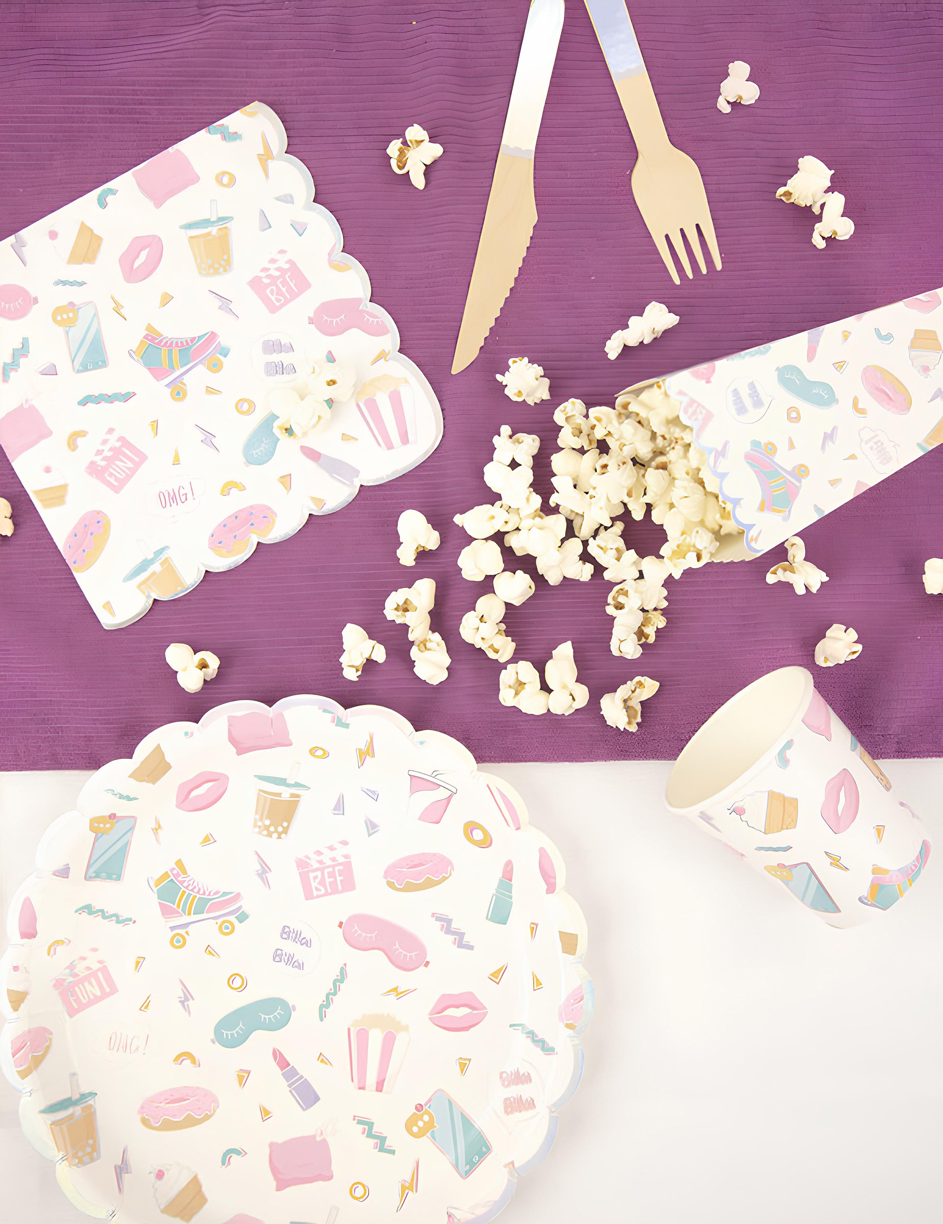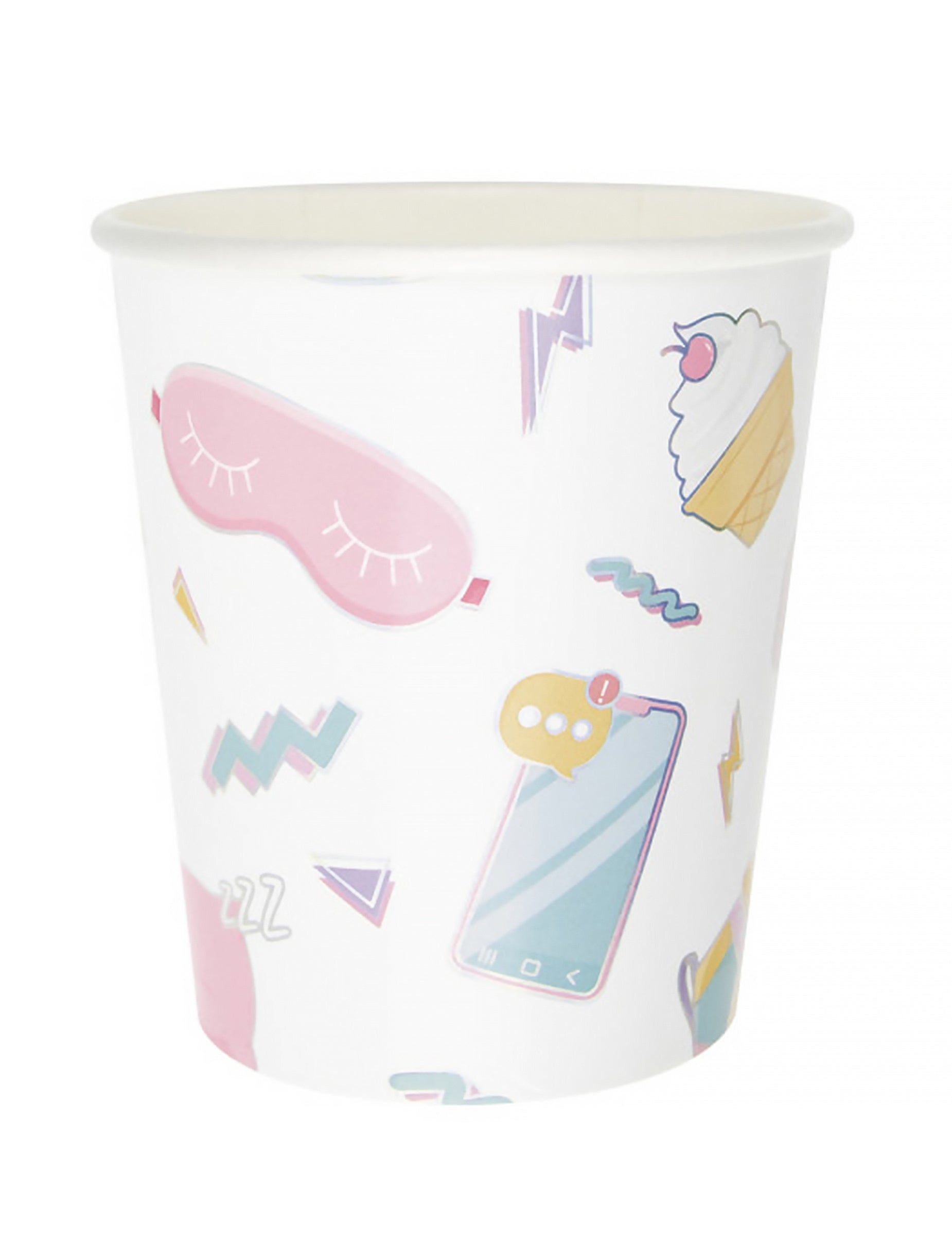 Dodajte svojej udalosti nádych zábavy s touto sadou 8 pyžamových párty pohárov s objemom 200 mlIdeálne na stretnutie s priateľmi. Ozdobené trendy motívmi, ako sú masky na spanie, koláčiky alebo smartfóny, dodajú vášmu stolu živý nádych. Tieto nádoby sú ideálne na servírovanie džúsov, sódy alebo nápojov na báze mlieka vo veselej atmosfére. Sú nevyhnutným doplnkom pre úspešnú výzdobu párty. narodeniny alebo a pyžamová párty nezabudnuteľné.