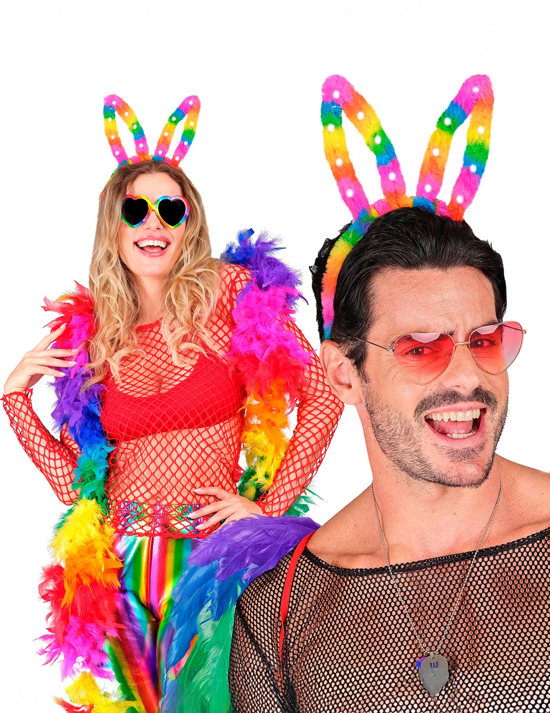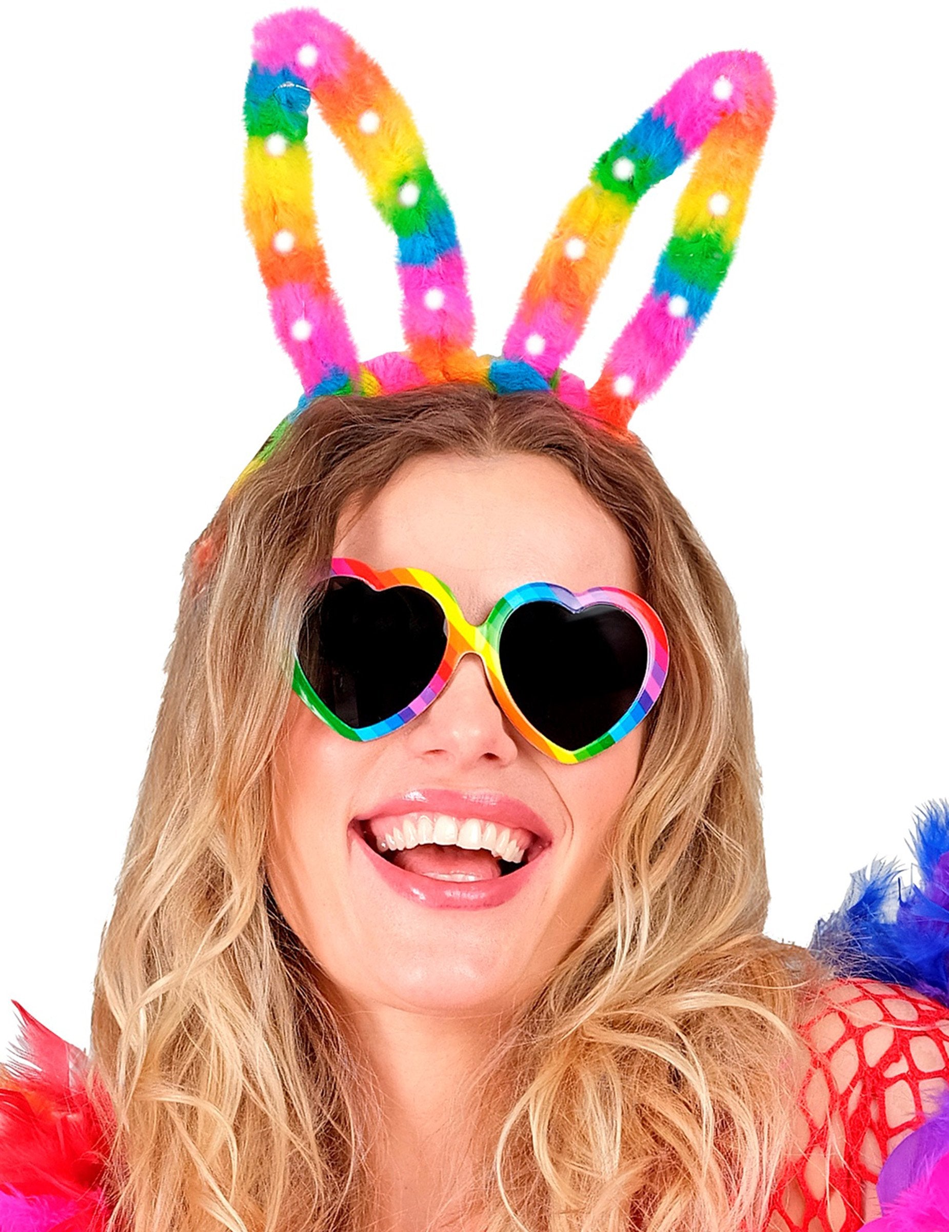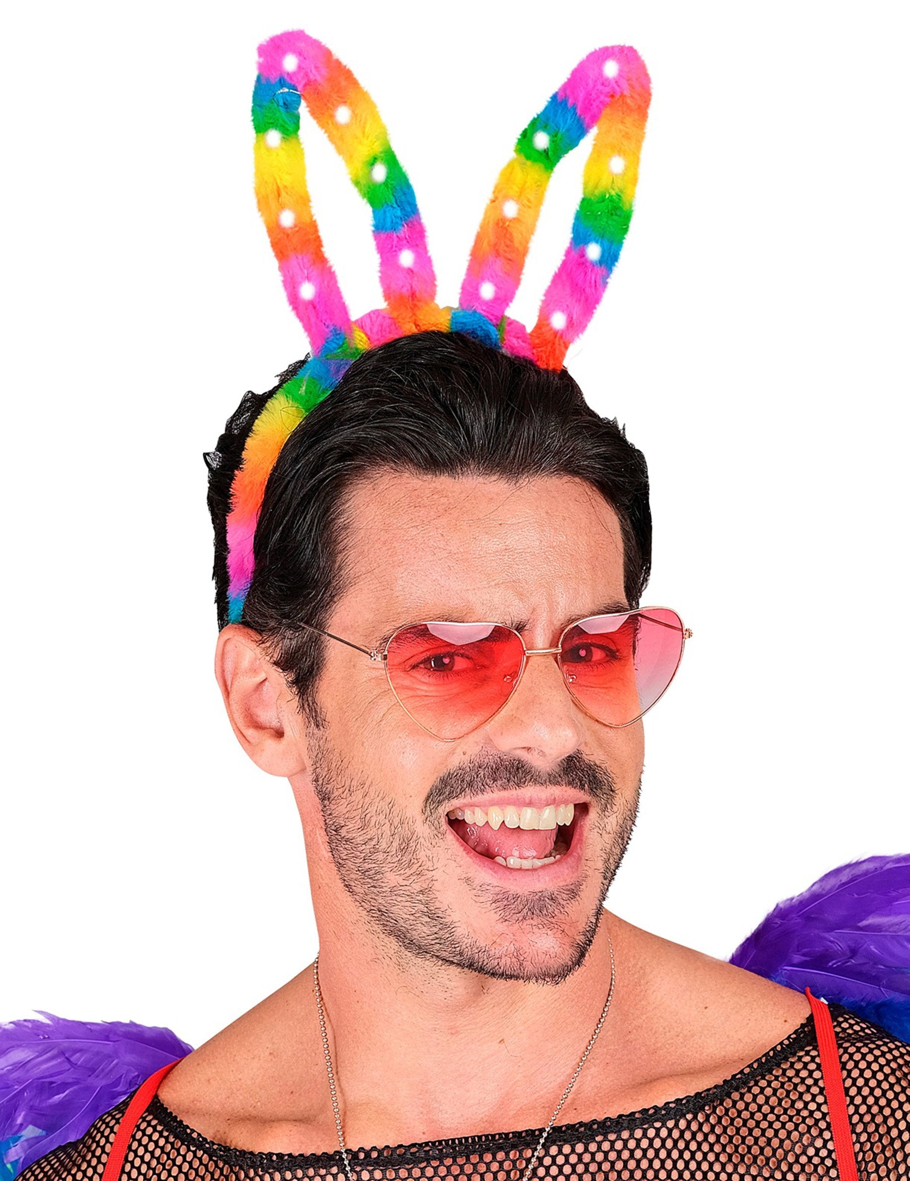 Tieto uši zajačiky sú dodávané vo forme plyšovej čelenky dúhy zdobenej veľkými vzpriamenými ušami. Čelenka je vybavená svetelným systémom s tromi režimami: stabilné svetlo, pomalé blikanie a rýchle blikanie, aktivované jednoduchým tlačidlom. Toto príslušenstvo pracuje s 2 batériami L1154 (nie je súčasťou). Bude perfektné dokončiť farebné a slávnostné maskovanie počas karnevalu alebo ozdobnej šiat.