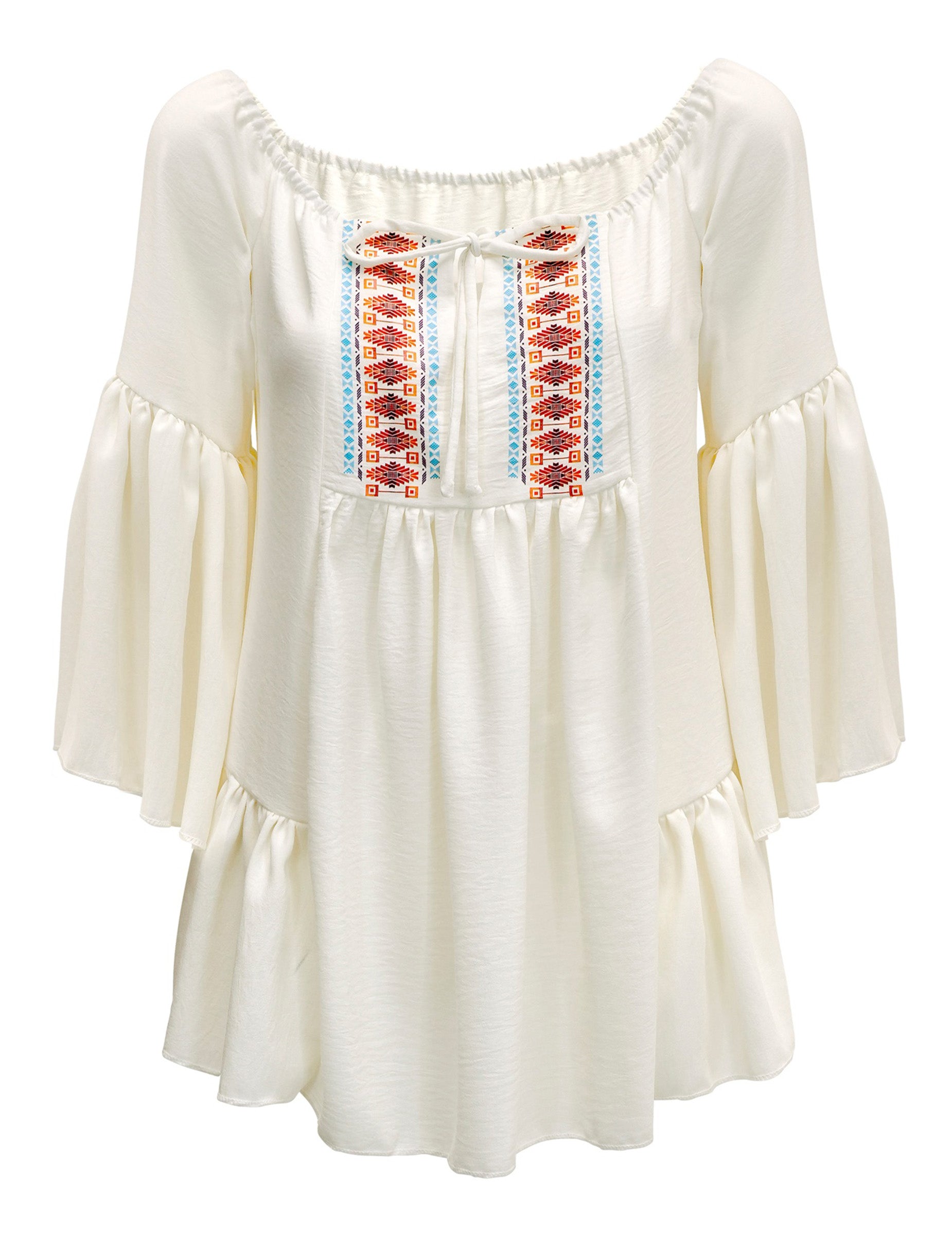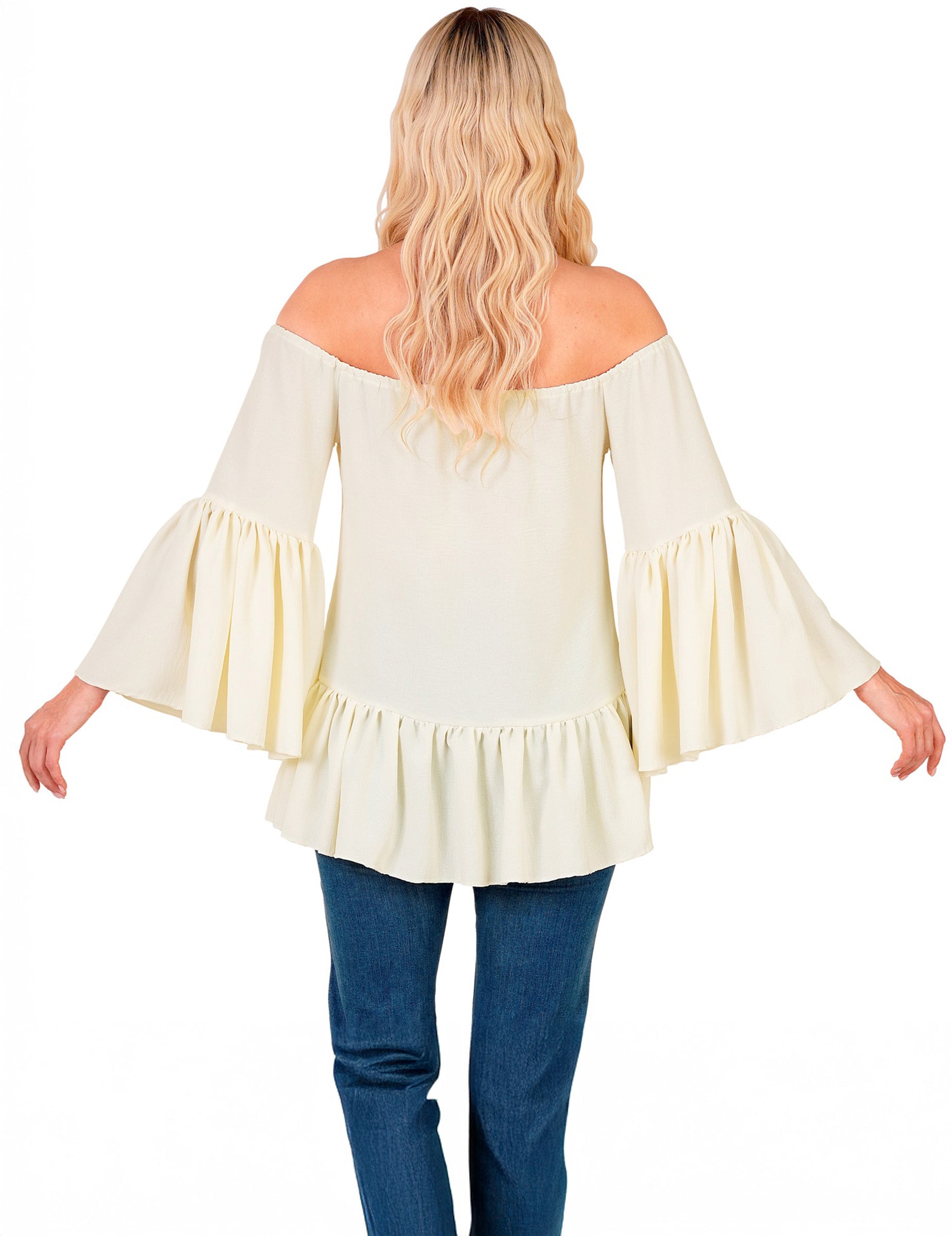 Táto hippie košeľa pre ženy pozostáva z blúzky mimo ramena s tekutým rezom, zdobenou kravatou na prednej časti a farebnými vzormi v etnickom duchu. Dlhé rozšírené rukávy a mierne zhromaždené lem si spomínajú na ikonický vzhľad 60. rokov, pre český a uvoľnený vzhľad. Vďaka svojmu ľahkému materiálu a vintage štýlu je ideálny kúsok na dokončenie hippie vzhľadu na karneval alebo párty s tematikou šesťdesiatych rokov.