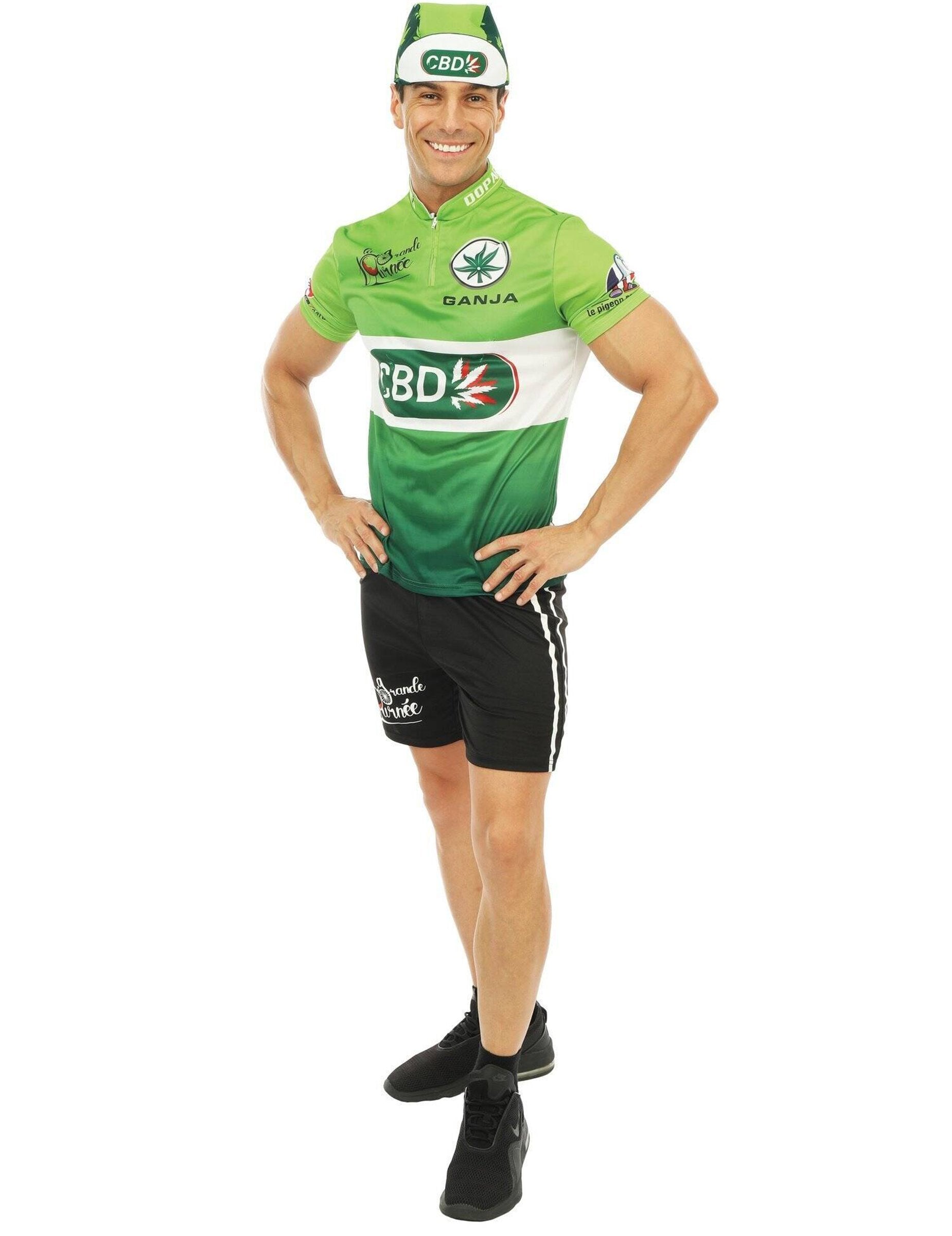 Toto pánsky cyklistický kostým obsahuje zelený dres, čierne šortky a zodpovedajúcu šiltovku.