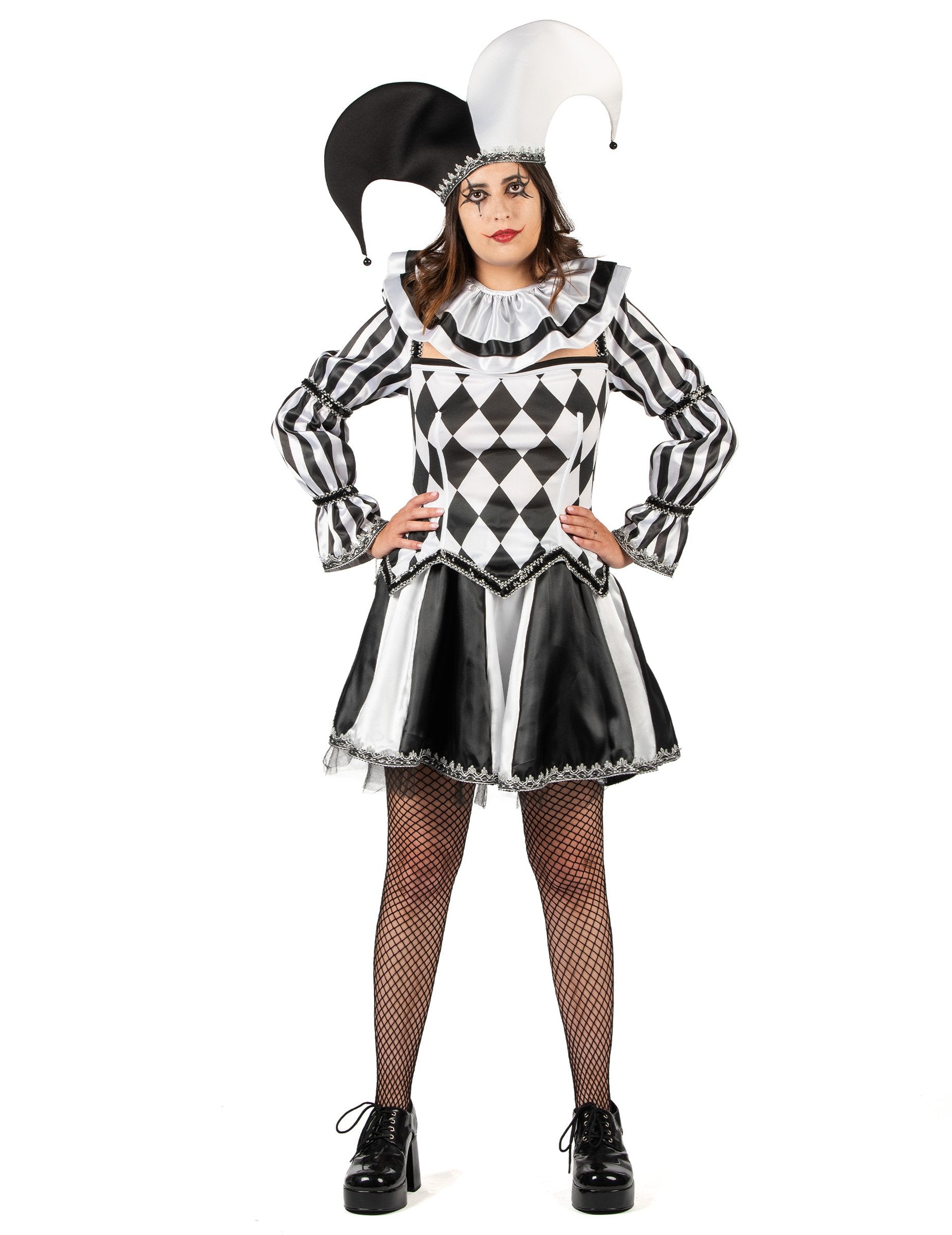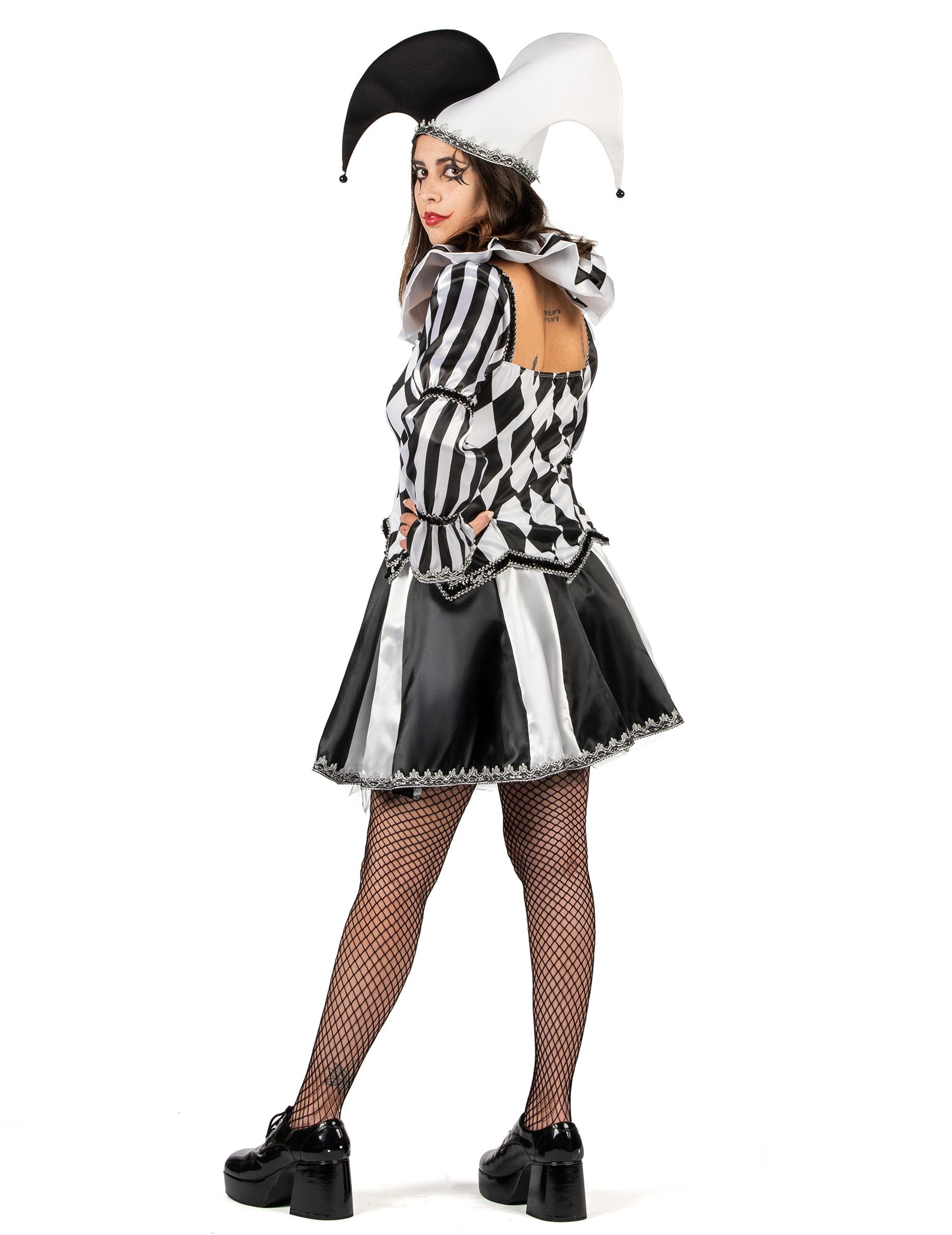 Tento čiernobiely dámsky kostým diabolského šaša upúta všetky pohľady svojou kombináciou grafických vzorov a saténových materiálov. Priliehavý vrch, zdobený kosoštvorcami a zvislými pruhmi, zvýrazňuje siluetu a zároveň dodáva výstredný nádych elegancie. Mierne naberané dlhé rukávy, zvýraznené lesklými lemami, prinášajú objem a charakter. Krátka sukňa z čiernej a bielej splývavej látky je podšitá čiernou tylovou spodničkou, ktorá jej dodáva tvar a zvýrazňuje nadýchaný efekt. Plisovaný golier štýlovo rámuje hornú časť poprsia, zatiaľ čo čiapka ozdobená rolničkami dotvára výbavu postavy, ktorá je rovnako šibalská ako záhadná. Tento kostým je ideálny na vytvorenie výnimočného a znepokojujúceho vzhľadu na Halloween.