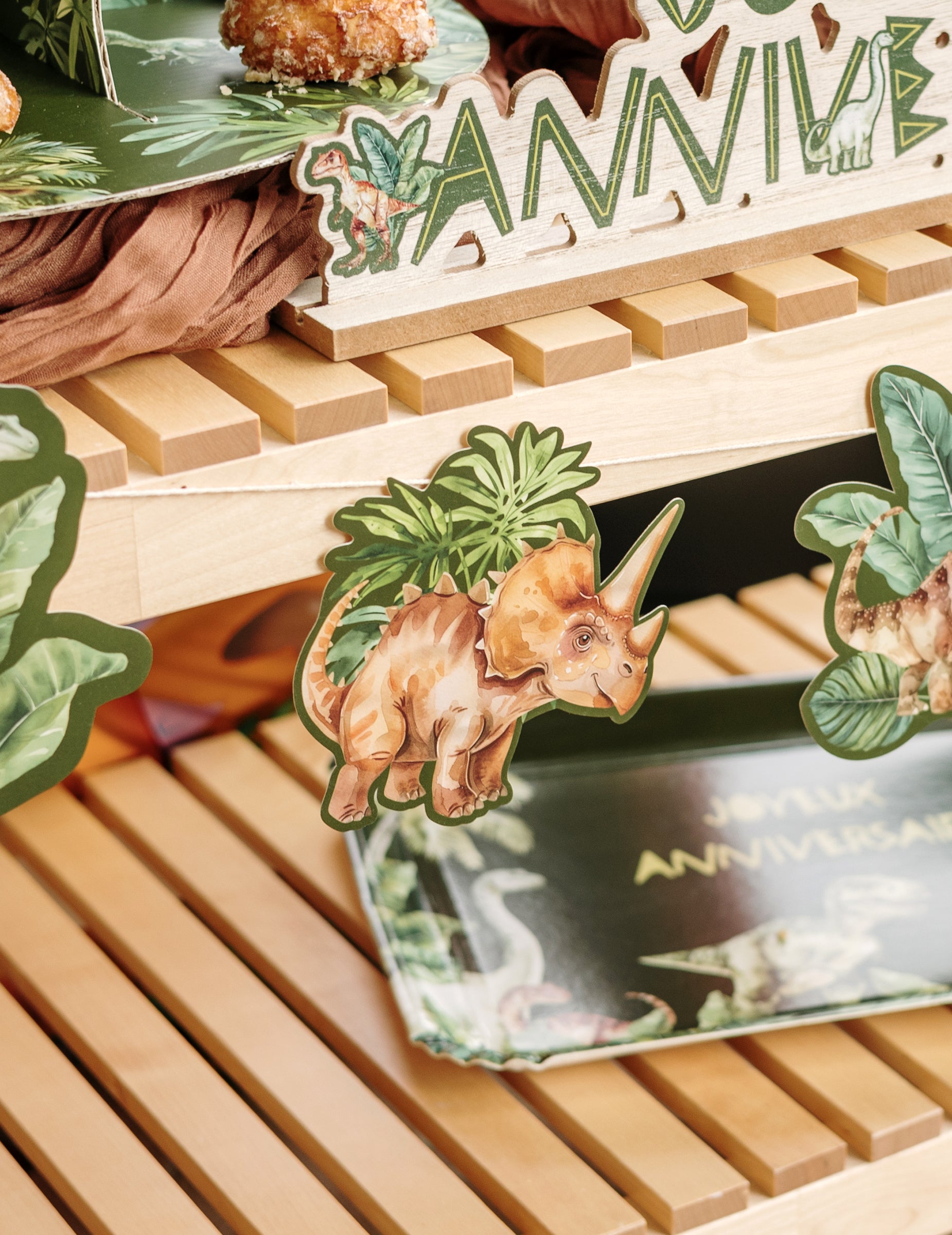 Každý dielik je vyrobený z pevného kartónu a má pastelové tóny a úhľadné vzory: triceratops, stegosaurus, sopka a tropické listy ho dopĺňajú. veniec Originálny. Veľmi jednoduchá inštalácia, ozdobí vaše steny alebo príborníky raz-dva.