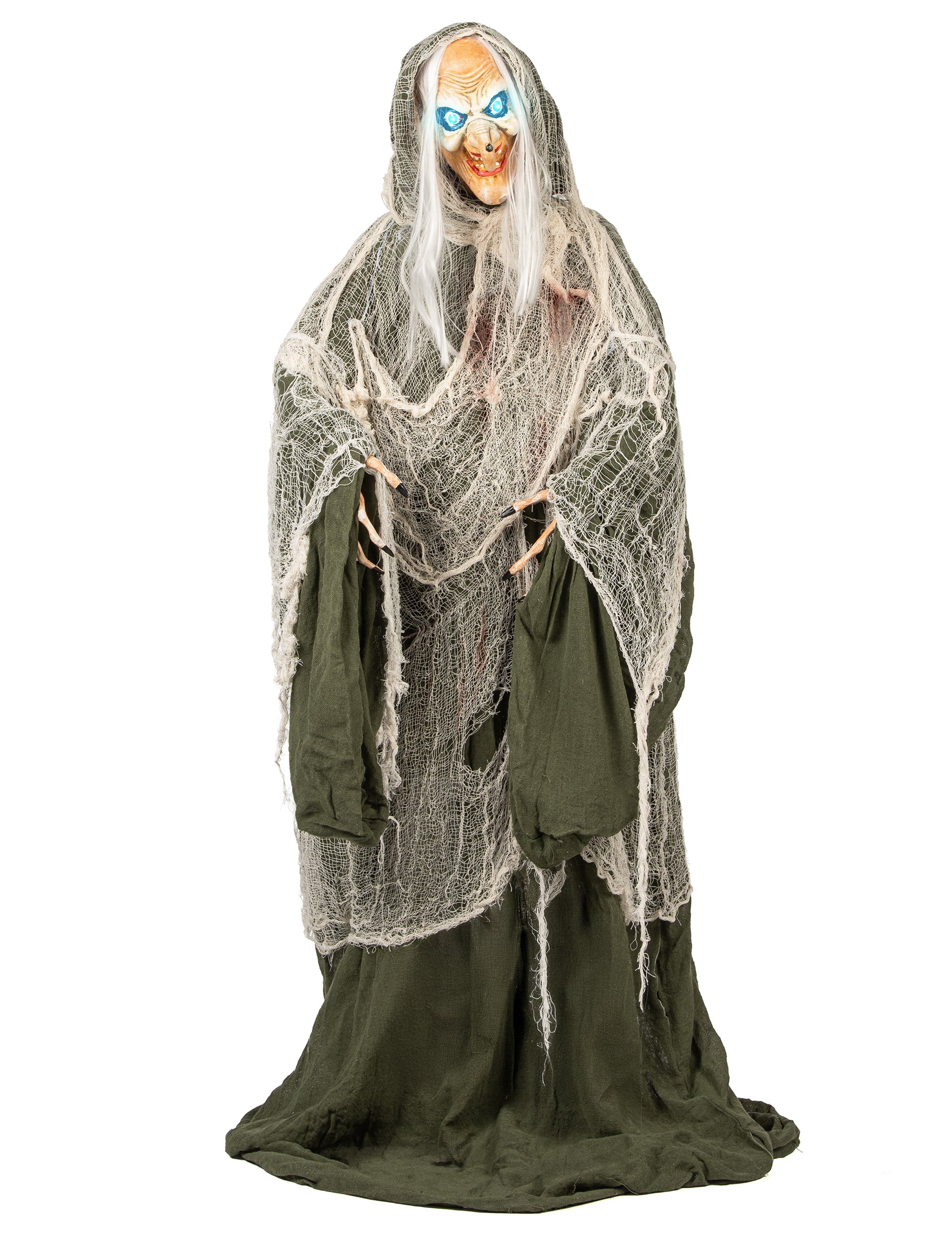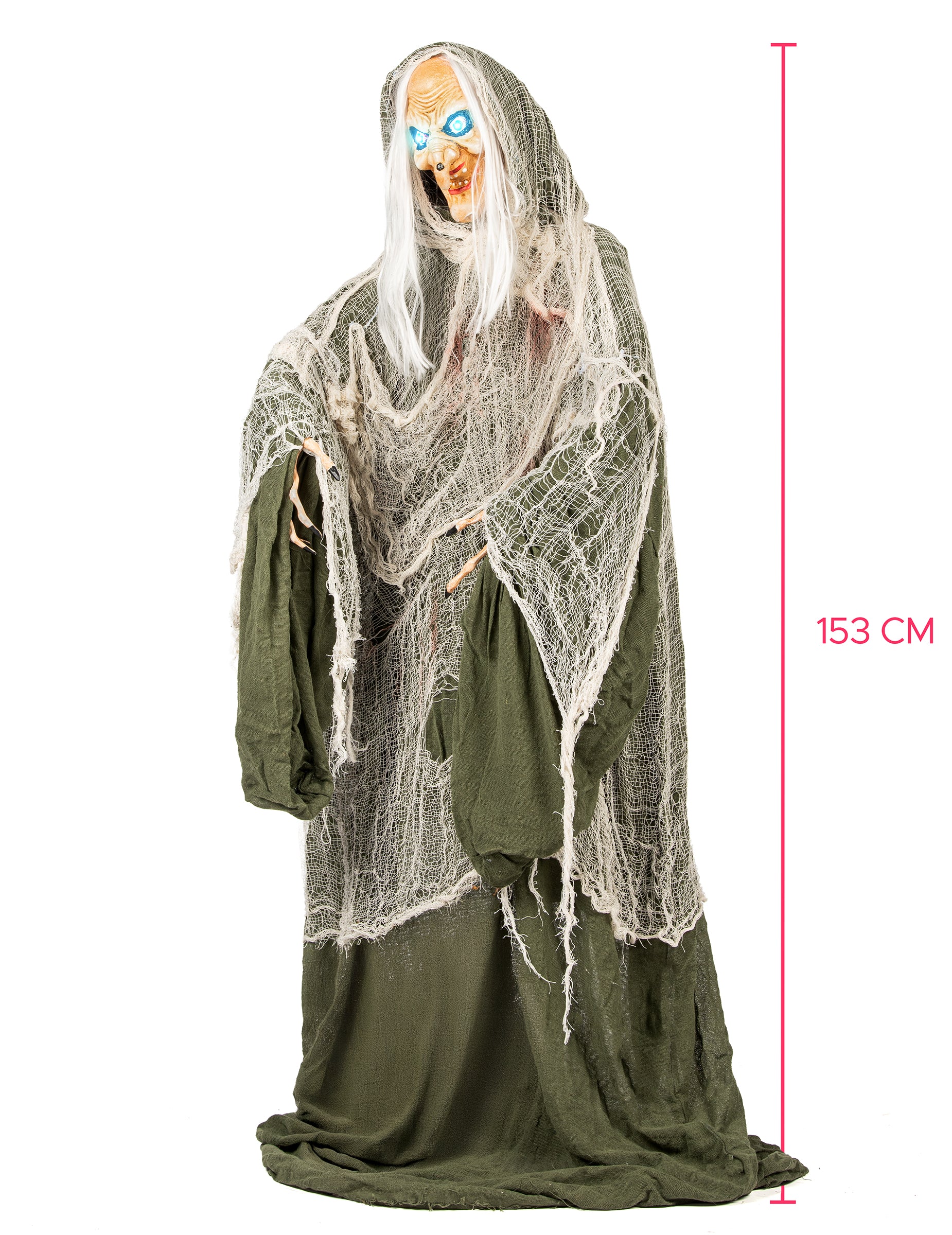 Táto animovaná čarodejnica z 153 cm Približne reaguje na meno Andromeda, znepokojujúcu postavu oblečenú v dlhých, vyblednutých zelených šatách a rozstrapkaný, starodávne vyzerajúci šál. Jeho tvár vyznačená časom, zakončená svetelnými modrými očami, ožije hneď po zistení hluku. Vďaka svojmu zvukovému senzora sa náhle aktivuje. Jeho pomalé a znepokojujúce pohyby, znepokojujúce výbuchy zvuku a jeho žiariace oči vytvárajú očarujúcu atmosféru. Dekorácia funguje s 3 batériami AA (nie je v cene) a kombinuje svetlo, zvuk a animáciu pre úplné ponorenie. Táto čarodejnica Andromeda, ktorá je ideálna pre Halloween, tematický displej okna, tmavý roh strašidelného domu alebo udalosť okolo Čiernej mágie, prinesie do vášho prostredia vzrušenie tajomstva a čarodejníctva.