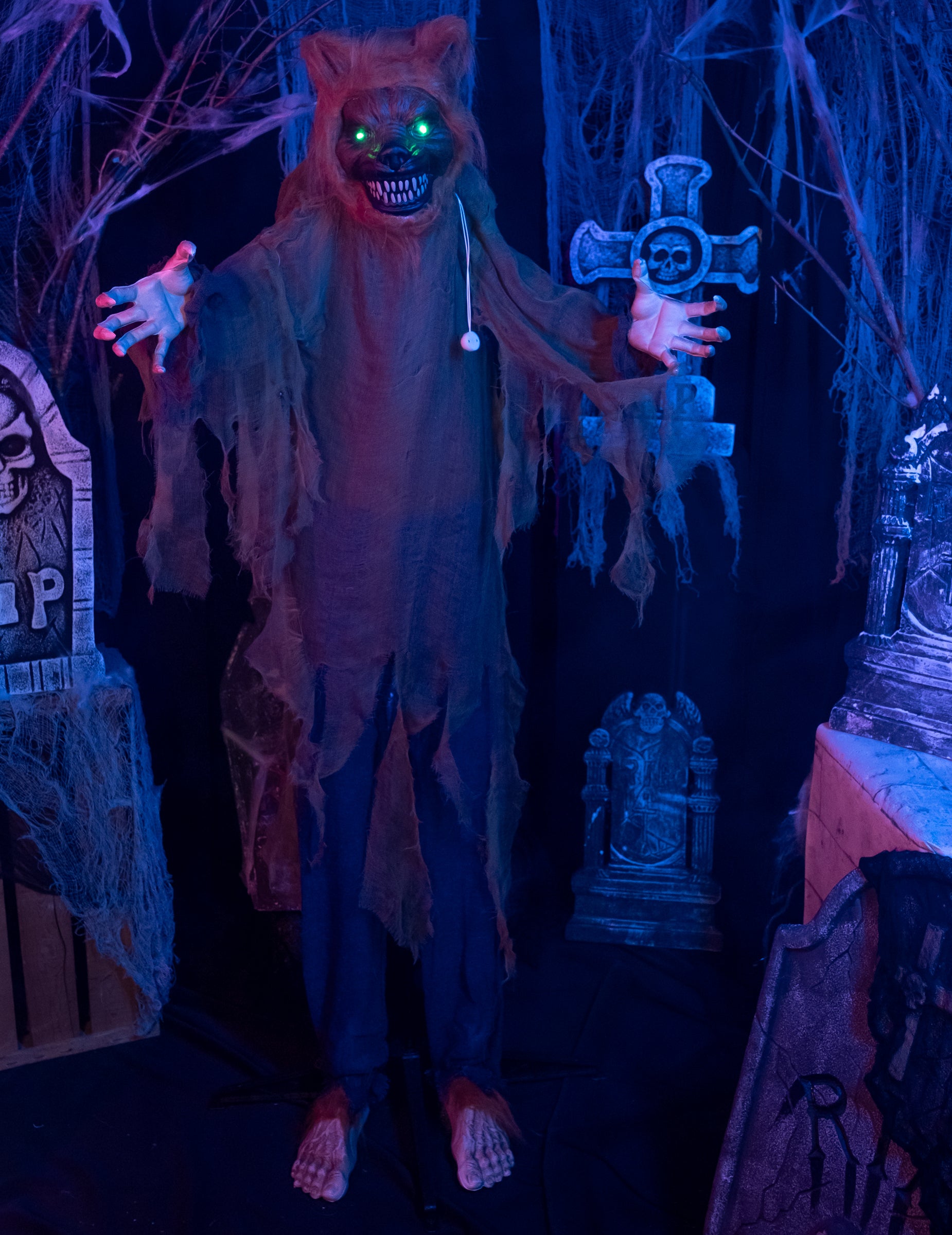 Prineste strach do svojej dekorácie s týmto 160-palcovým animovaným gigantom vlkom cm Približne, divoké stvorenie s hrozivým pohľadom a znepokojujúcou prítomnosťou. Vďaka jeho červenej kožušine, roztrhaným oblečením a zúrivým ústam z neho robí nočnú moru v životnej veľkosti. Hneď ako sa zistí zvuk, jeho senzor ho automaticky aktivuje. Jeho zelené oči sa rozsvietia, jeho náhle pohyby začínajú a vystrašujúce vytie. Celá vec vytvára strašidelnú atmosféru, ktorá je ideálna na prekvapenie vašich hostí. Dekorácia pracuje s 3 batériami AA, ktoré nie sú zahrnuté. Tento animovaný vlk, ktorý je ideálny pre Halloween, strašidelný les alebo pohlcujúcu strašidelnú domovú scénu, sa stane jedným z najobávanejších prvkov vášho prostredia.