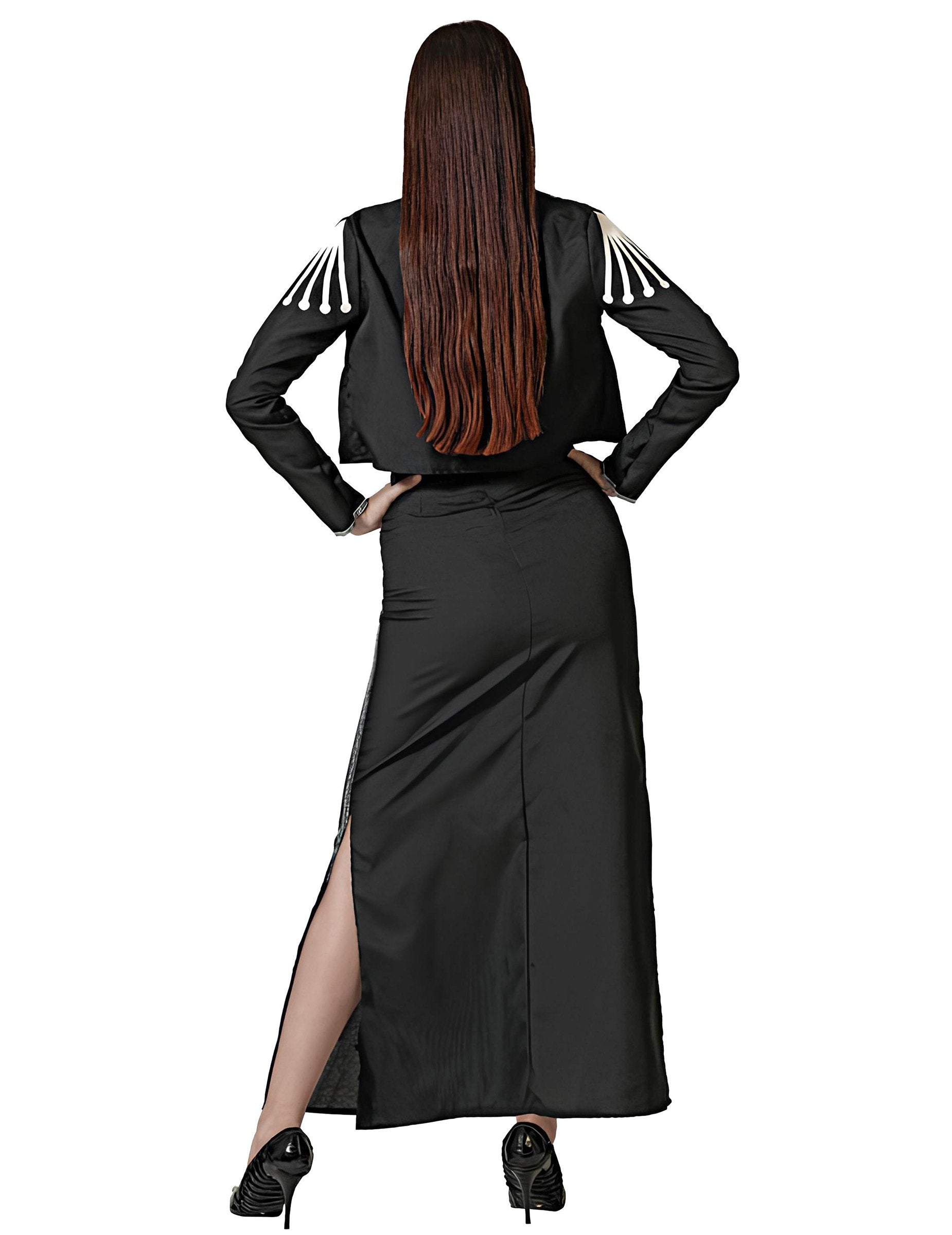 Ce déguisement Dia de los Muertos pour femme rend hommage à la célèbre fête mexicaine avec un look à la fois élégant et symbolique. Il est parfait pour afficher un style mystérieux et raffiné lors de vos soirées costumées. L’ensemble comprend un t-shirt noir orné d’un squelette imprimé blanc, une veste courte assortie avec détails dorés et épaulettes décoratives, une ceinture noire large avec boucle argentée, et une longue jupe noire fendue sur le côté pour un effet à la fois chic et audacieux. Le tout est sublimé par une lavallière rouge au niveau du col pour une touche de couleur vive. Le maquillage et le grand chapeau mexicain peuvent être ajoutés pour compléter ce look spectaculaire (non inclus). Parfait pour célébrer Halloween, une soirée sur le thème des morts, un bal costumé ou un événement inspiré de la culture mexicaine, ce déguisement vous garantit une allure inoubliable et pleine de caractère !