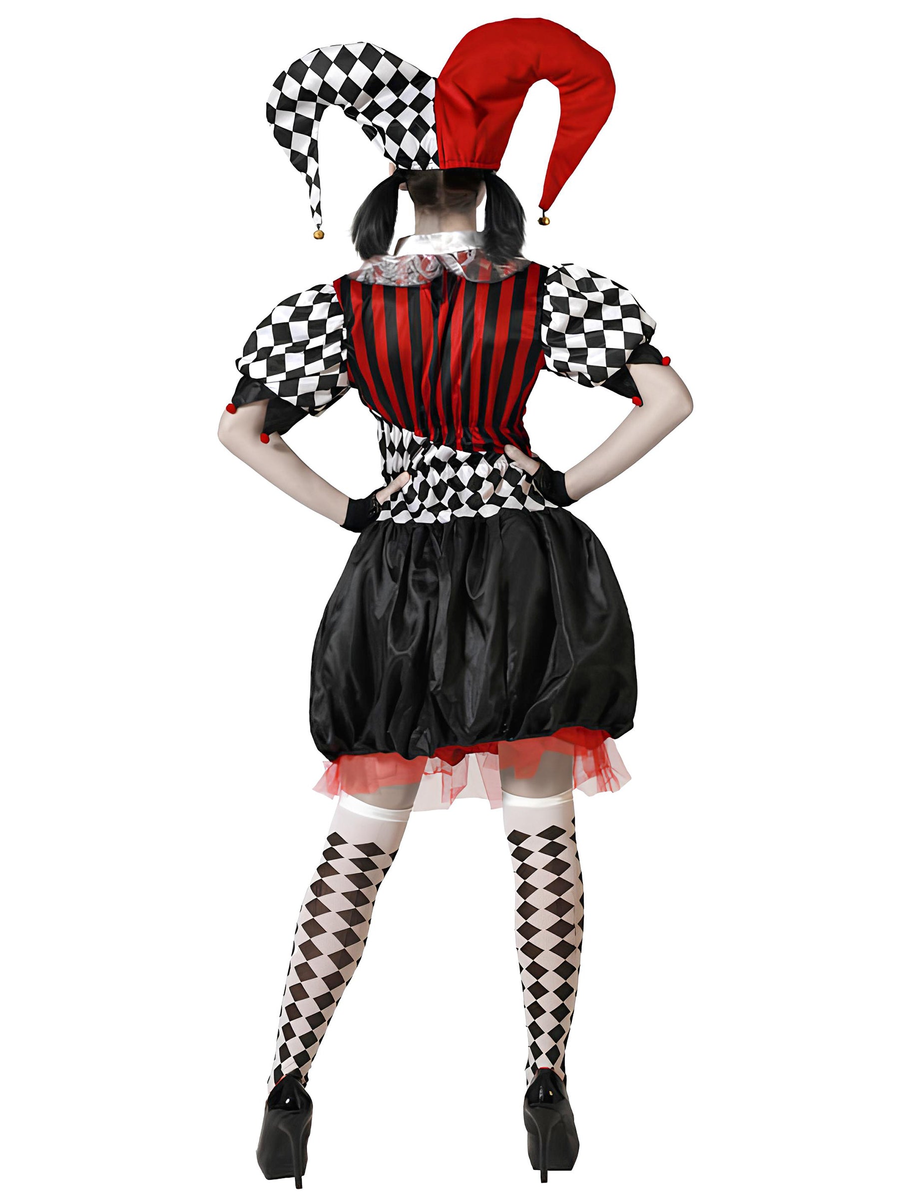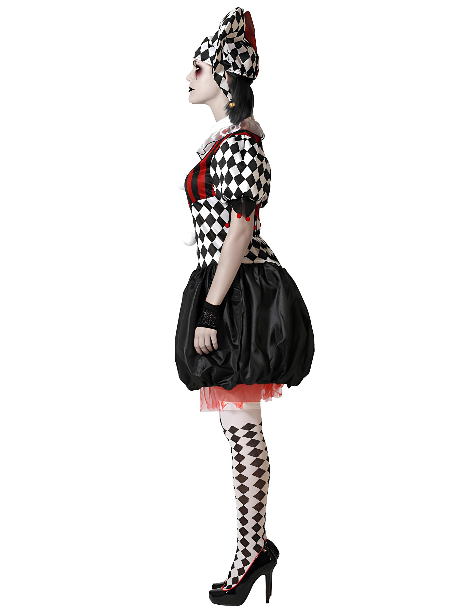 Apportez une touche terrifiante et originale à vos soirées costumées avec ce déguisement d’arlequin effrayant spécialement conçu pour les femmes grande taille. Un look saisissant qui mêle l’univers du cirque à celui de l’horreur, parfait pour se démarquer ! Ce costume se compose d’une robe à manches bouffantes mêlant motifs losanges noirs et blancs et rayures rouges, avec une jupe bouffante noire et un jupon rouge en tulle apparent. Le col est orné d’un petit volant blanc pour une touche classique. Le chapeau d’arlequin assorti, avec ses pointes rouge et noire en tissu rembourré, complète idéalement cette tenue au look déjanté. Idéal pour Halloween, une soirée à thème horreur ou un carnaval, ce déguisement d’arlequin inquiétant fera sensation auprès de tous les invités !