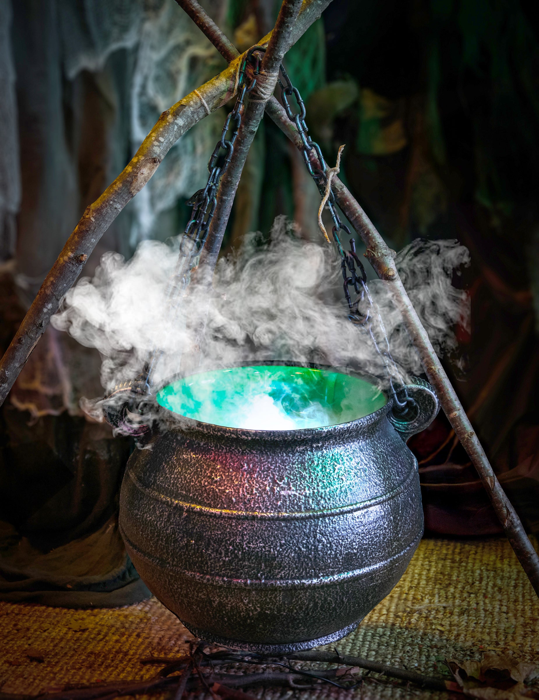 Táto čarodejnícka kanvica s rozprašovačom 45 cm Toto je perfektný doplnok na vytvorenie nadprirodzenej atmosféry vo vašej halloweenskej výzdobe. Vďaka dymovému efektu a strašidelnej zelenej žiare vyzerá tento textúrovaný čierny kotol, akoby priamo vyšiel z brlohu čarodejnice. Vstavaný rozprašovač vytvára hustú, chladnú hmlu, ktorá stúpa z kotla, zatiaľ čo vnútorné svetlo vrhá strašidelnú žiaru, ktorá simuluje bublajúci elixír. Ideálny doplnok k scéne s čarodejnicou, knihou kúziel alebo metlou. Jednoducho nalejte vodu do zelenej základne. Funguje na striedavej sieti 220 – 240 V pre nepretržité a nerušené rozptyľovanie hmly.