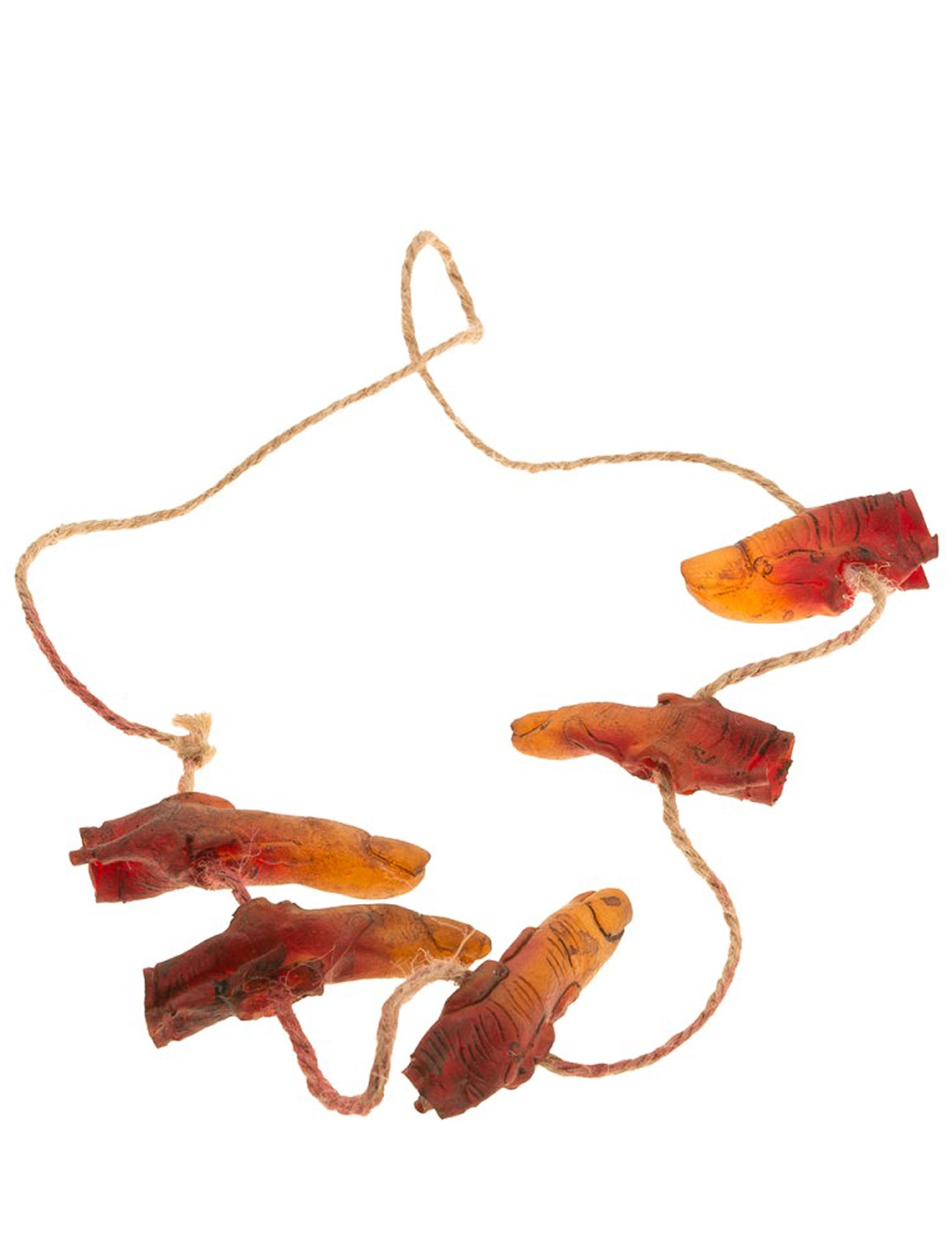 Táto sada 5 latexových prstov s meraním 7 x 2 x 2 cm je spojený závesným reťazcom a vytvára šokujúci a zlovestný vizuálny efekt. Intenzívna červená farba a tvarované detaily vylepšujú realizmus úchvatnej hororovej scény. Táto strašidelná dekorácia zavesí vysoko alebo na kus nábytku, dokonale zapadá do krvavého halloweenského dekoru.