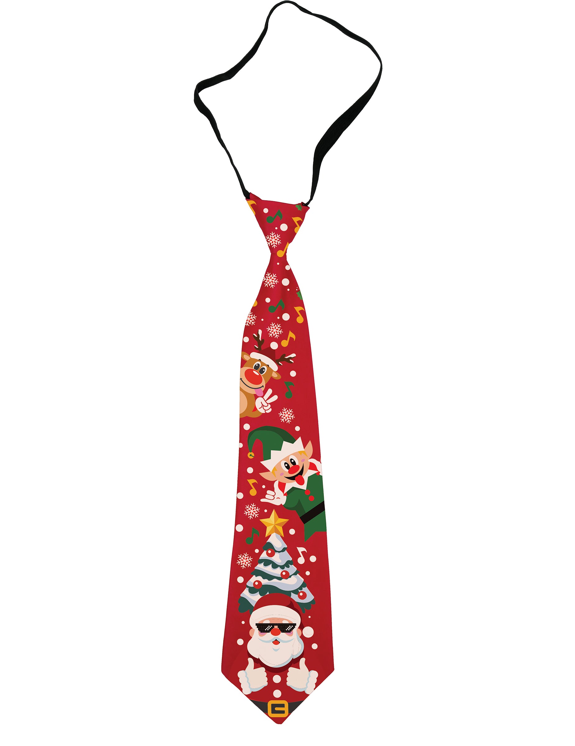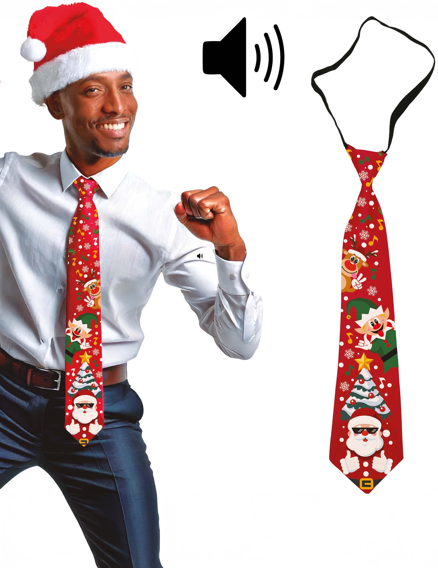 Dodajte svojmu outfitu slávnostný nádych s touto hudobnou vianočnou kravatou pre dospelých! Zdobená veselými motívmi ako Santa Claus, škriatok a vianočný stromček, sa ľahko zapína pomocou čiernej gumičky. Má gombík, ktorý spúšťa vianočnú melódiu, čo zaručuje prekvapivý efekt. Zábavný doplnok, ktorý vyčarí úsmev na tvári vašim priateľom a rodine a zároveň udrží sviatočnú atmosféru. Funguje na 2 batérie LR41 (súčasťou balenia). Ideálna na vianočné večere, firemné akcie alebo slávnostné večery s priateľmi.