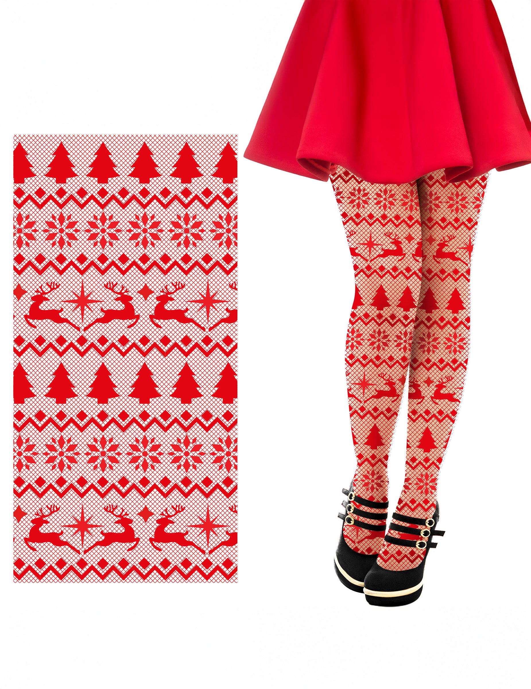Tieto červené sieťované pančuchy s vianočnými vzormi Sú perfektné na dodanie originálneho nádychu spoločenskému outfitu. Sú zdobené zimnými motívmi: snehové vločky, jedle A Rennes, ktoré pripomínajú svetre z Vianoce tradičné.
