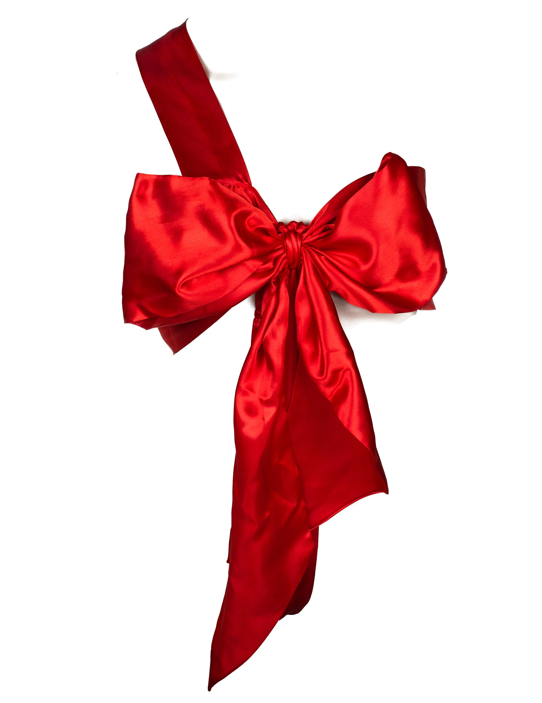 Dizajn má podobu veľkej červenej mašle pripomínajúcej satén so širokými panelmi, ktoré sa tiahnu pozdĺž tela. Jednofarebná červená farba okamžite priťahuje pozornosť a vďaka centrálnemu tvaru mašle štruktúruje siluetu. Celý kúsok sa nosí priamo na tele a stáva sa ústredným bodom outfitu.