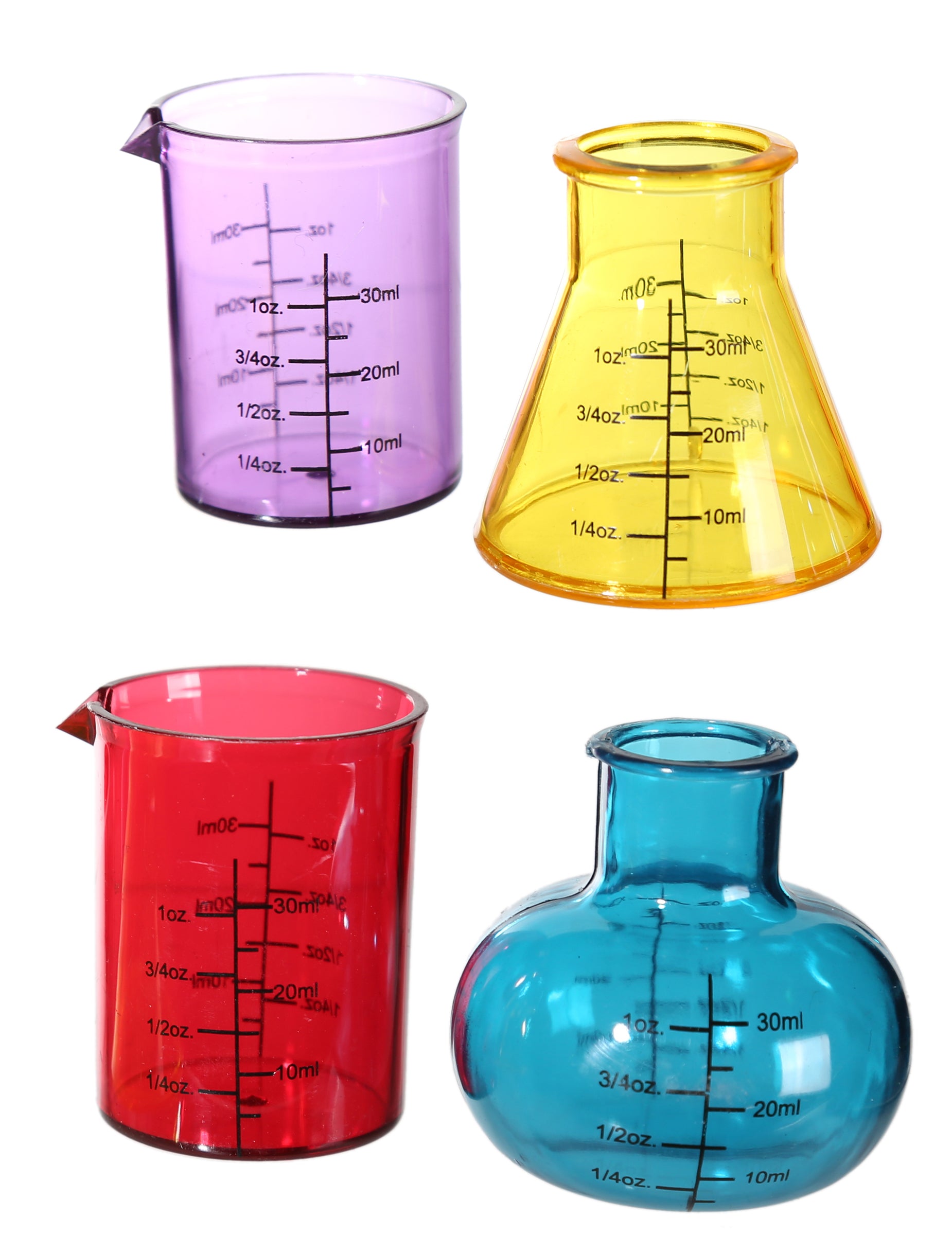 Každý pohár má tvar inšpirovaný laboratórnym sklom s rôznymi siluetami pripomínajúcimi kadičky a banky. Na povrchu sú vytlačené viditeľné stupnice, ktoré umocňujú efekt lekárne. Poháre sú dostupné v rôznych farbách, ako je fialová, žltá, červená a modrá, čo umožňuje rozmanité prestieranie. Vďaka svojej kompaktnej veľkosti sú ideálne na servírovanie štamprlov a degustácie.