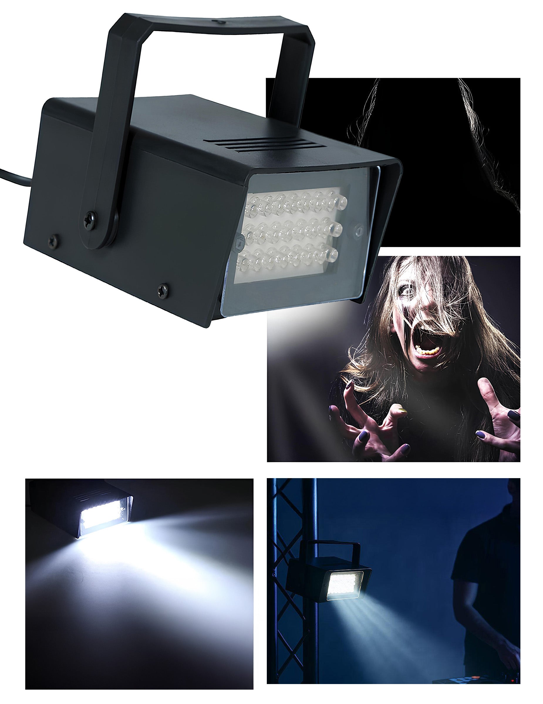 Vytvára rýchla a opakovaná svetelná sekvencia, ideálny na sprevádzanie vašich zvukov, pohybov alebo efektových scén. Vďaka svojmu kompaktná konštrukcia s integrovanou rukoväťou Dá sa ľahko pripevniť na stenu alebo podperu.