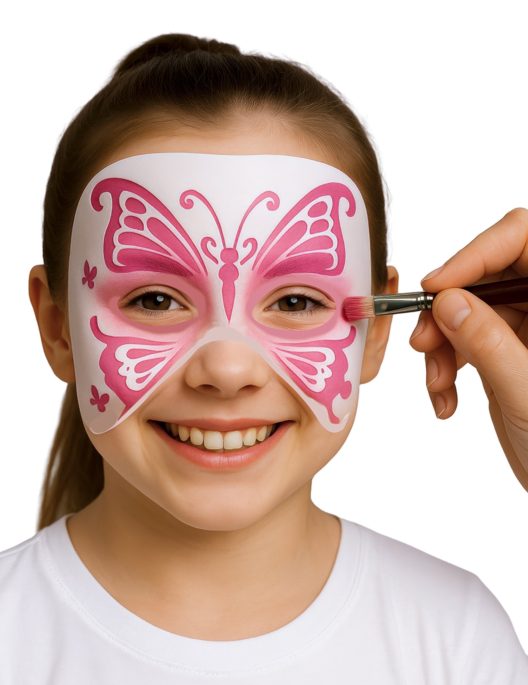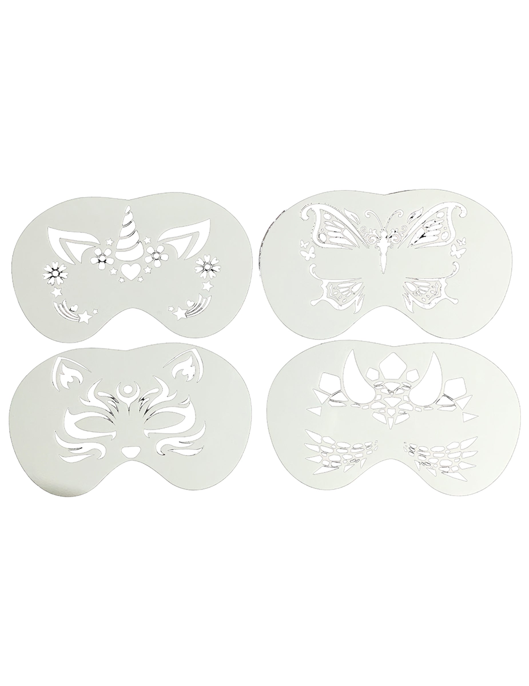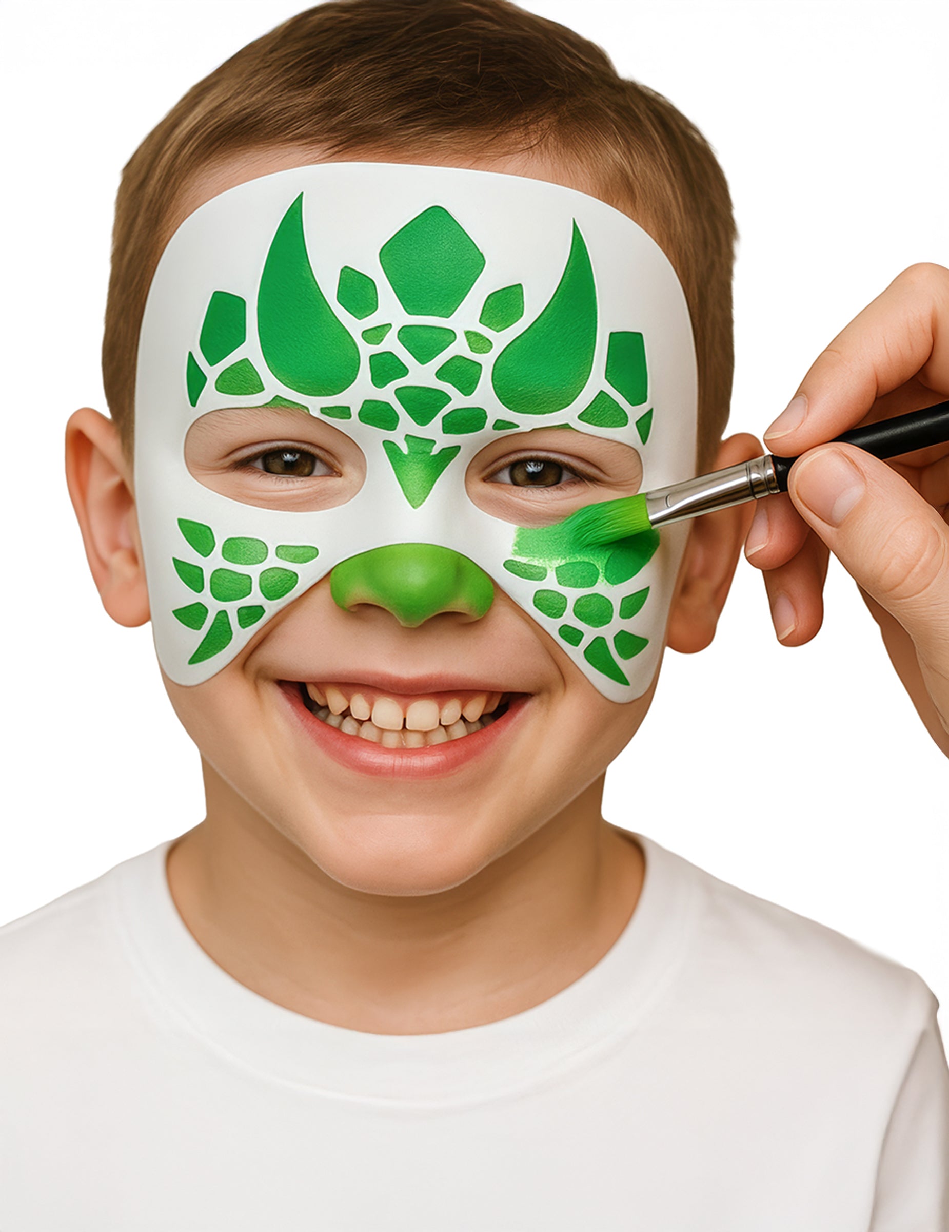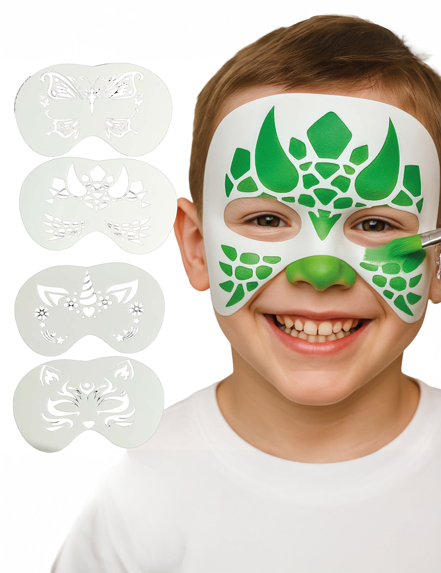 Táto sada obsahuje štyri opakovane použiteľné šablóny špeciálne navrhnuté pre deti. Umožňujú vám rýchlo vytvoriť originálne vzory maľovania na tvár v tvare draka/dinosaura, motýľa, jednorožca a mačky. Vďaka presnému výrezu sa ľahko nanášajú na tvár a zaručujú čistý výsledok aj pre začiatočníkov. Tieto šablóny sú ideálne na narodeniny, karnevaly, školské oslavy alebo Halloween a zabezpečujú zábavné, rýchle a kreatívne maľovanie na tvár.