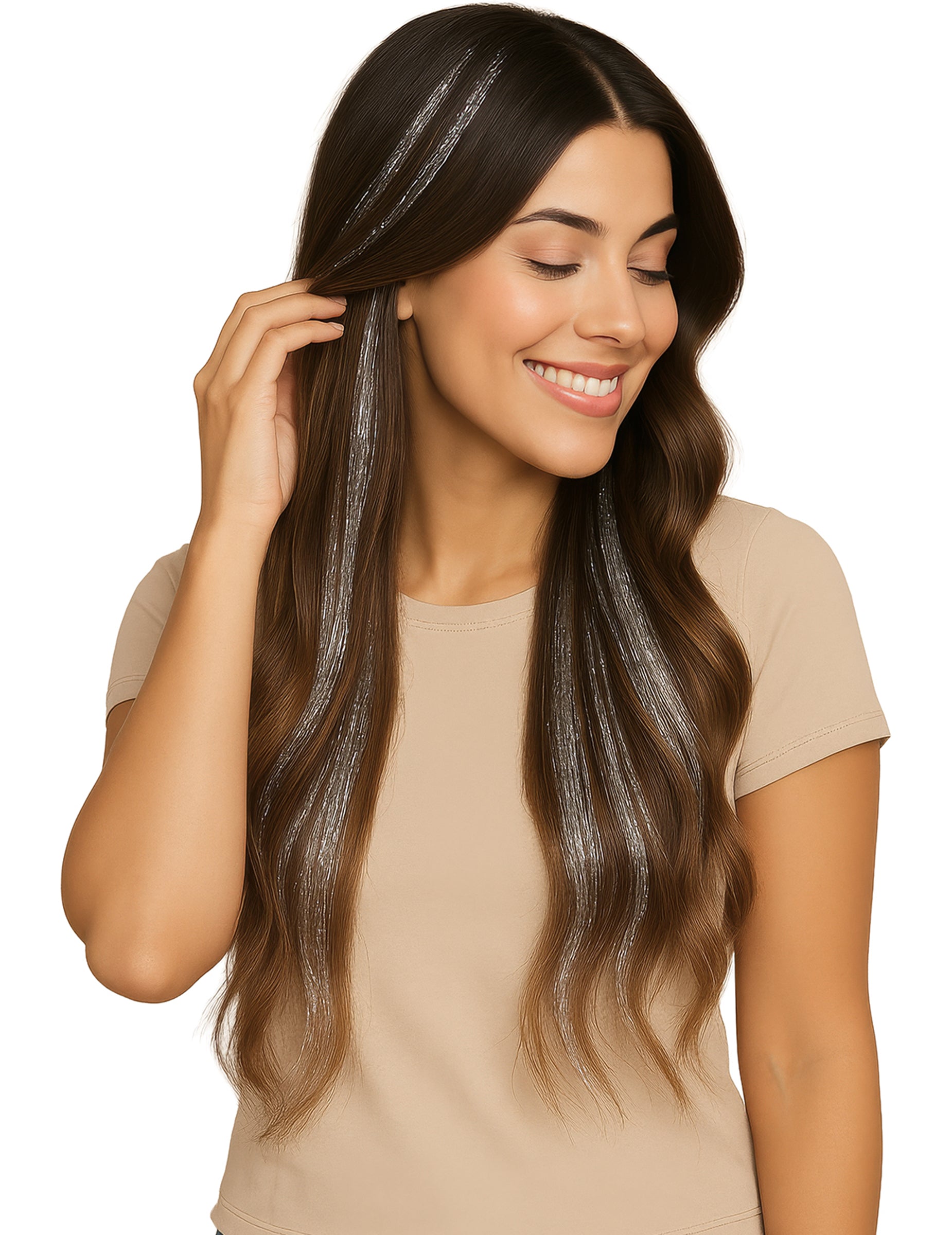 Ajoutez une touche glamour à vos coiffures avec ces 3 mèches brillantes argentées de 50 cm. Faciles à fixer grâce à leur système à clipser, elles apportent immédiatement éclat et originalité à vos cheveux. Idéales pour compléter un déguisement, briller lors d’une soirée, d’un festival ou simplement sublimer votre style, ces mèches scintillantes se marient parfaitement à toutes les tenues festives. Leur effet argenté reflète la lumière pour un rendu spectaculaire et raffiné.