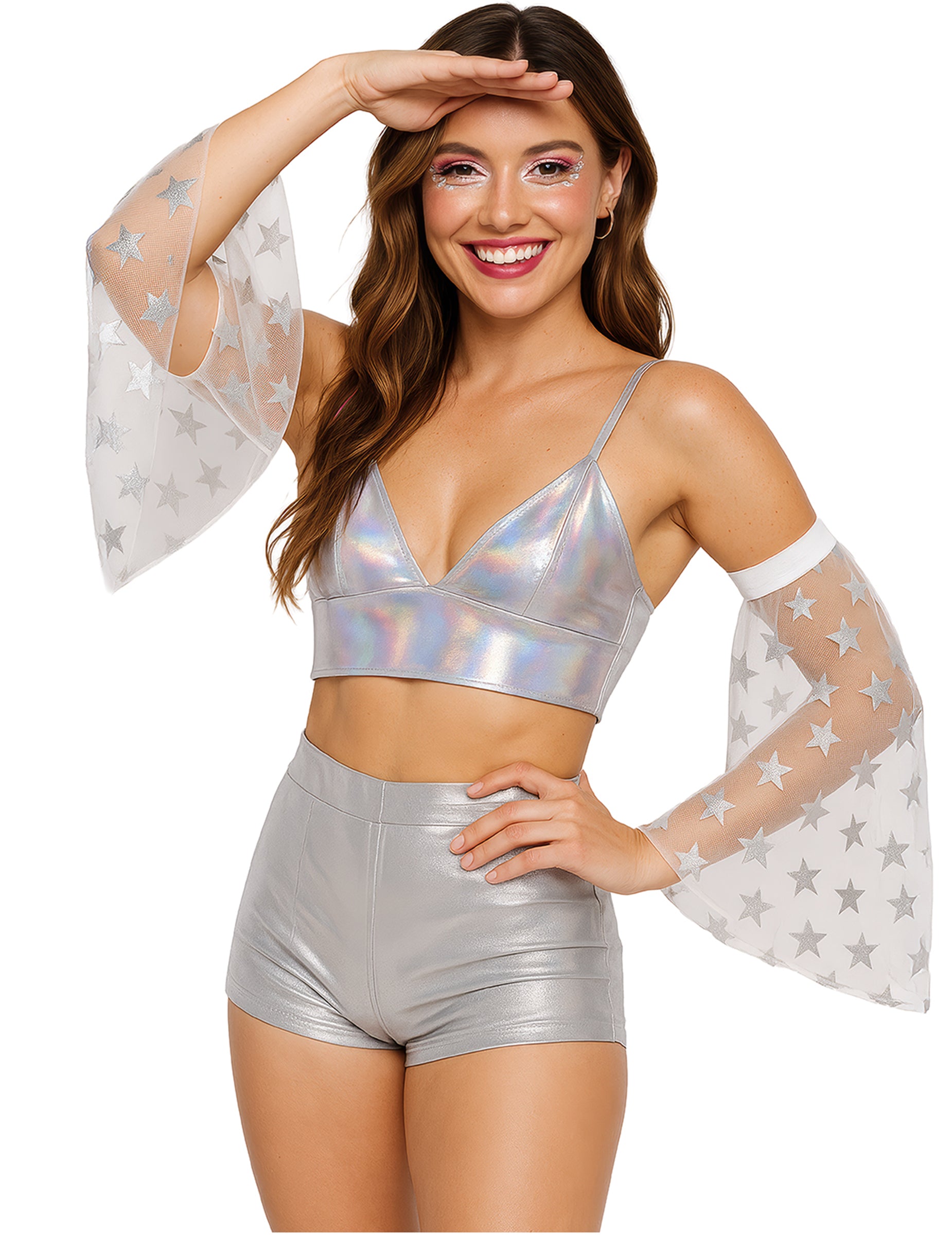 Dodajte svojmu outfitu štipku lesku s týmito strieborné disko manžety zdobené trblietavými hviezdičkamiSú vyrobené z ľahkého priehľadného voálu a vďaka elastickému zápästiu sa ľahko nosia, čo zaručuje pohodlie a oporu počas celého večera.