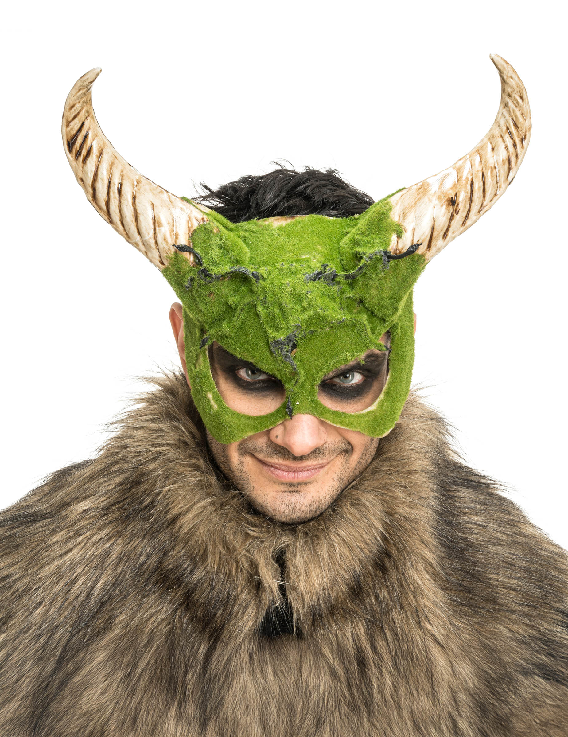 Premeňte sa na mýtickú bytosť vďaka tomuto polomasku rohatého Zvieraťa, zdobenému jedinečným efektom rastlinnej peny. S veľkými vyrezávanými rohmi a rozmermi 34 x 8 x 29 cm dodá vašim kostýmom pôsobivý a realistický vzhľad.
