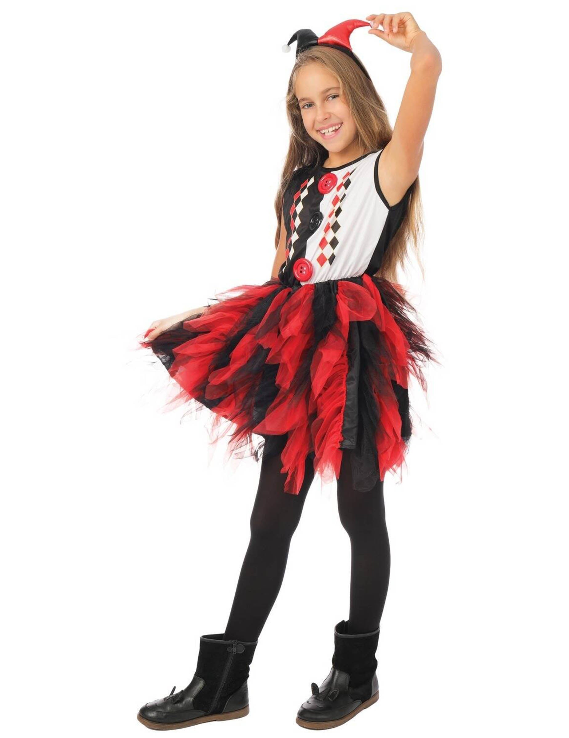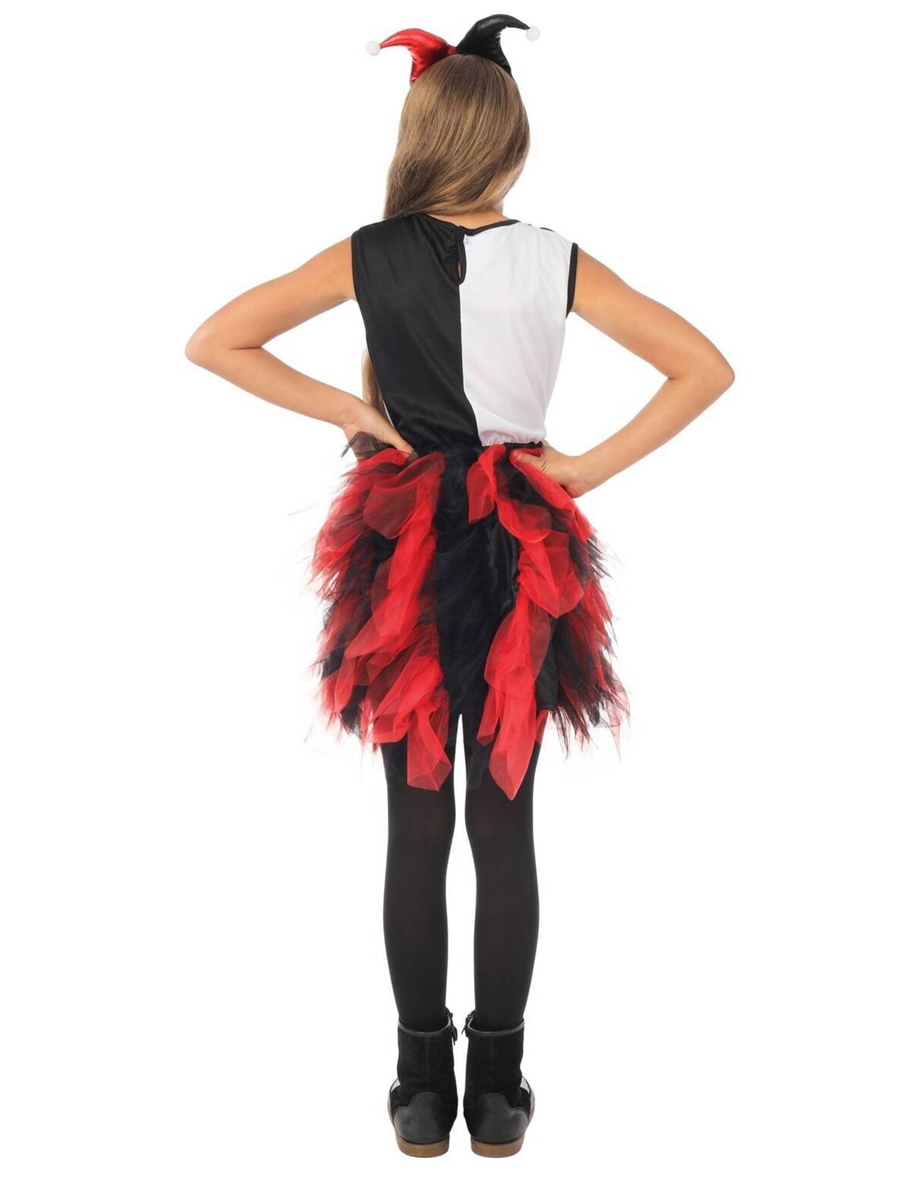 Tento harlekýnsky kostým pre dievča pozostáva z dvojfarebných šiat v čiernej, bielej a červenej farbe, doplnených tylovou spodničkou v čiernej a červenej farbe pre objemný a slávnostný efekt.
