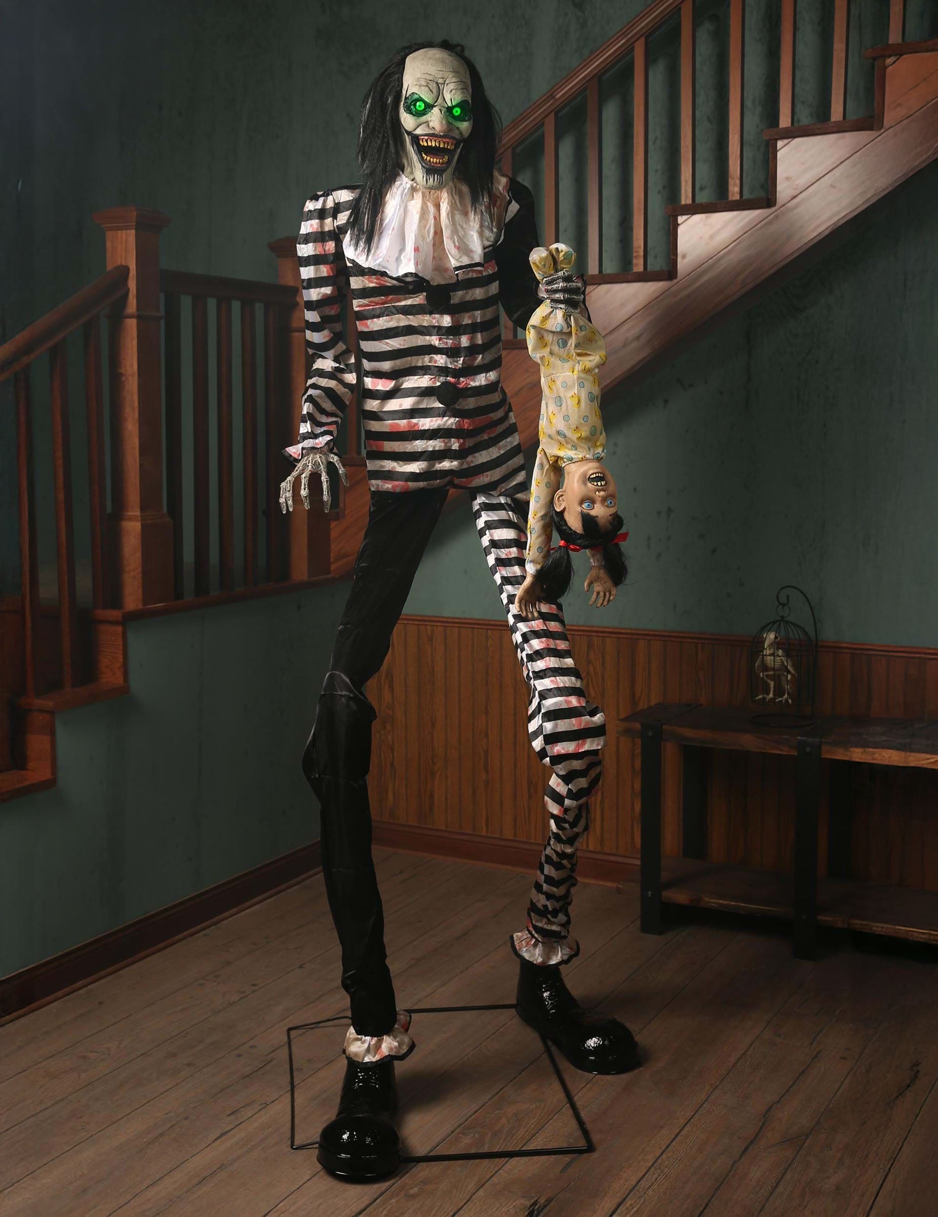 Tento desivý animovaný klaun 2,15 metrov je jednou z najviac znepokojujúcich dekorácií nezabudnuteľnej Halloweenskej scény. S jeho svetelným pohľadom, jeho pohyblivou čeľusťou a jeho zlým úsmevom okamžite nastaví tón. Postava sa pohybuje bokom, ktorý drží bábiku dieťaťa zavesenú na nohách, ktorá kričí každým pohybom. Kontrast medzi jeho klaunským kostýmom a vyjadrením jeho obete vytvára atmosféru, ktorá je strašidelná a veľkolepá. Animácia sa spúšťa automaticky vďaka infračerveným senzorom a hlasitosť zvuku je nastaviteľná tak, aby sa prispôsobila vášmu dekoru. Počas celého večera pracuje na sieti pre nepretržitý účinok.