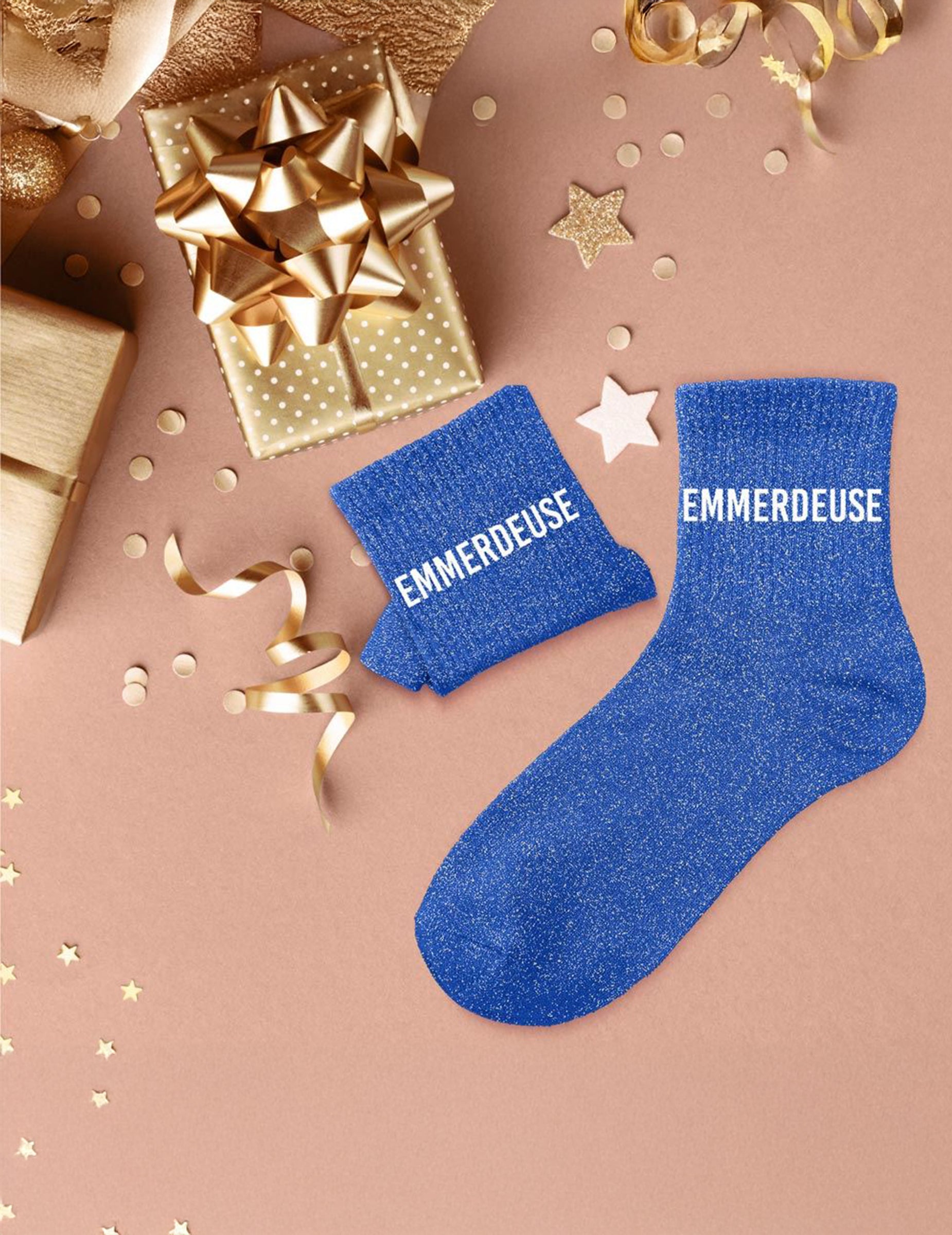 Nechajte svoju osobnosť zažiariť s týmito modrými trblietavými ponožkami pre ženy vo veľkostiach 36-42! Zdobené slovom „EMMERDEUSE“ (suka) bielymi písmenami, v sebe spájajú odvahu, humor a štýl. Ich mäkký, elastický materiál ponúka pohodlné nosenie, zatiaľ čo trblietavý lesk dodáva vášmu outfitu nádych svetla. Zábavný a originálny doplnok, ideálny ako darček plný osobnosti alebo na vyjadrenie vášho temperamentu s brilantnosťou a humorom.