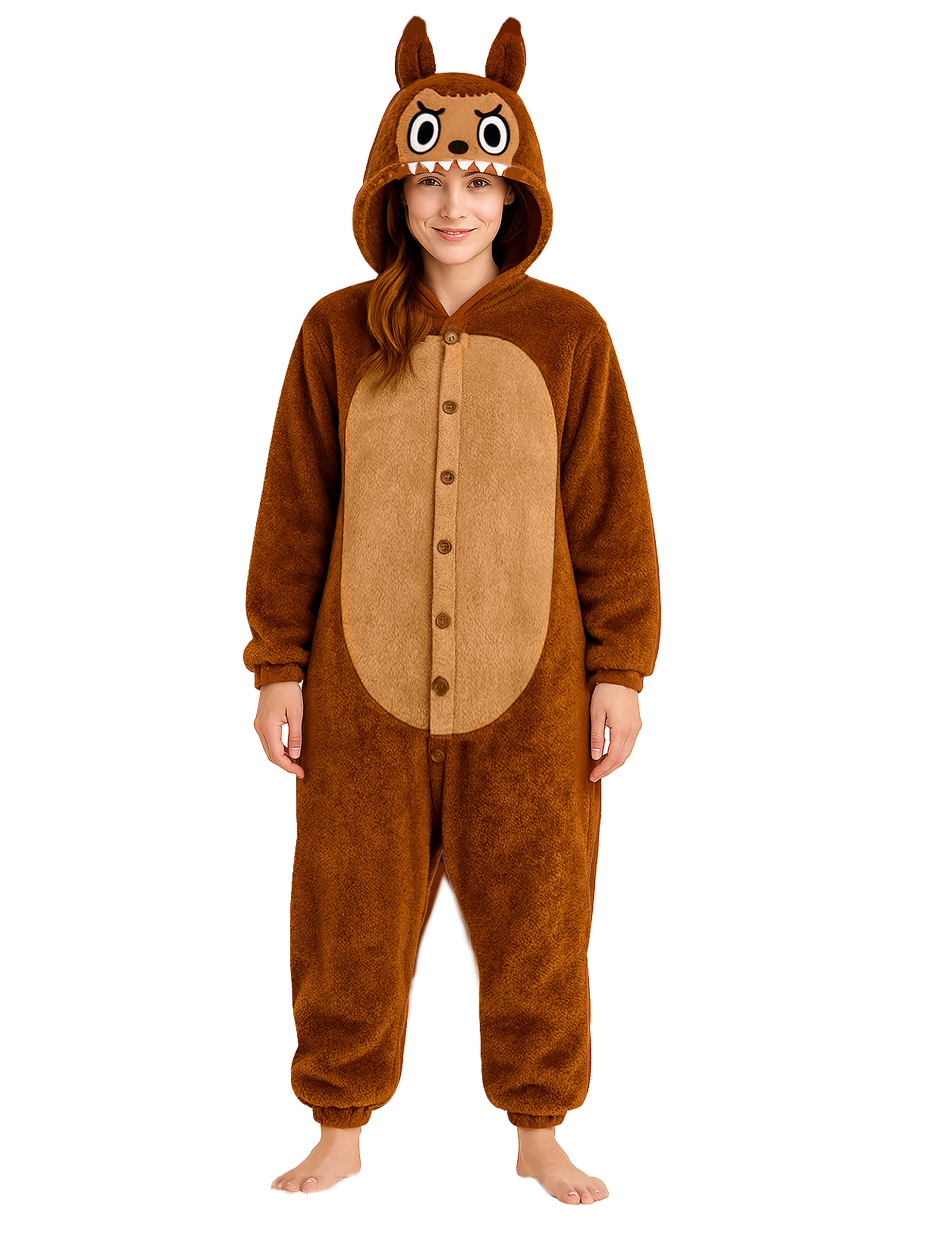 Tento dámsky plyšový kostým hnedého monštra vás pozýva stať sa rozkošným stvorením s nezbedným pohľadom a nežným srdcom. Vyrobený z mäkkého a plyšového materiálu, tento overal ponúka maximálne pohodlie a zároveň pôsobí zábavne a sympaticky.