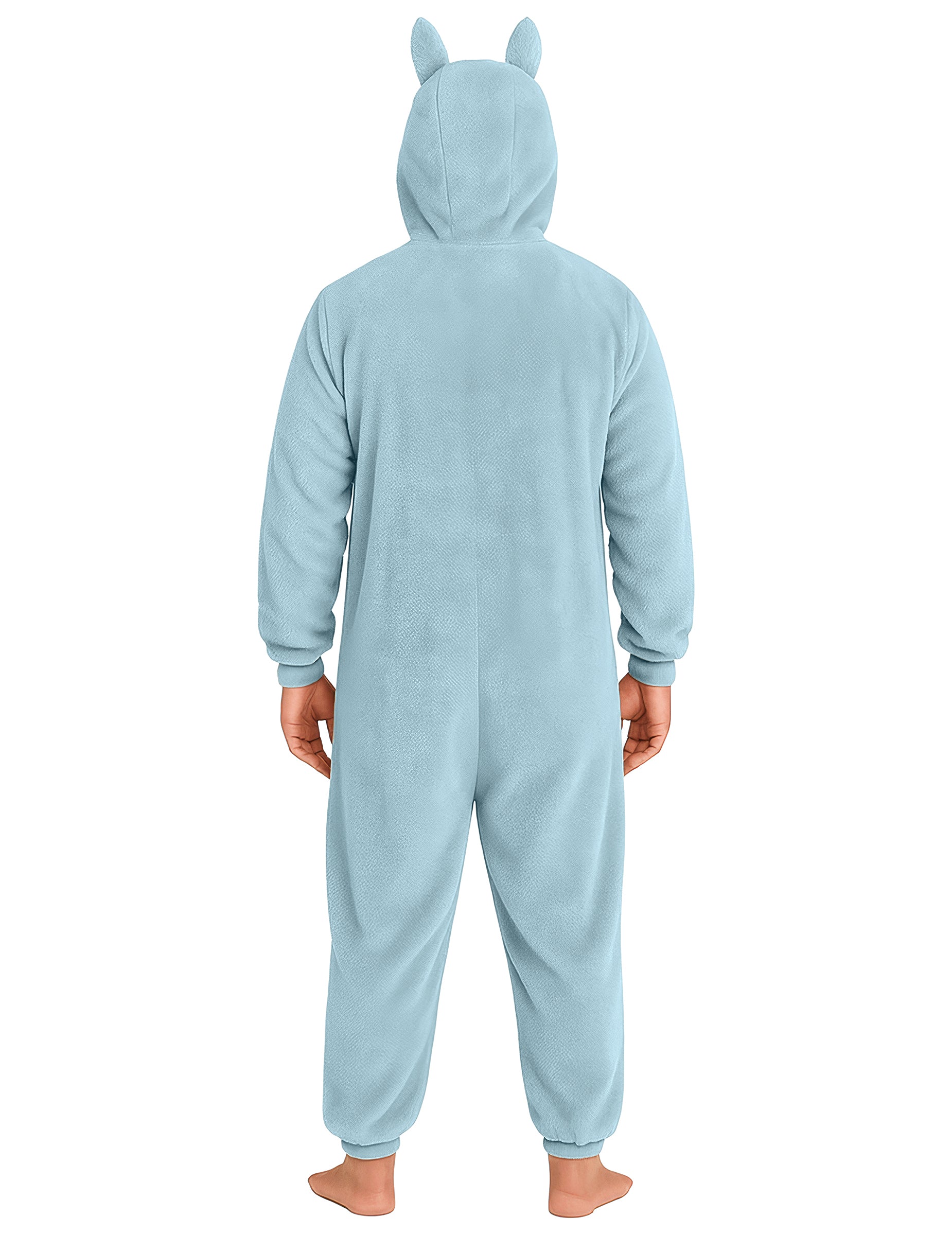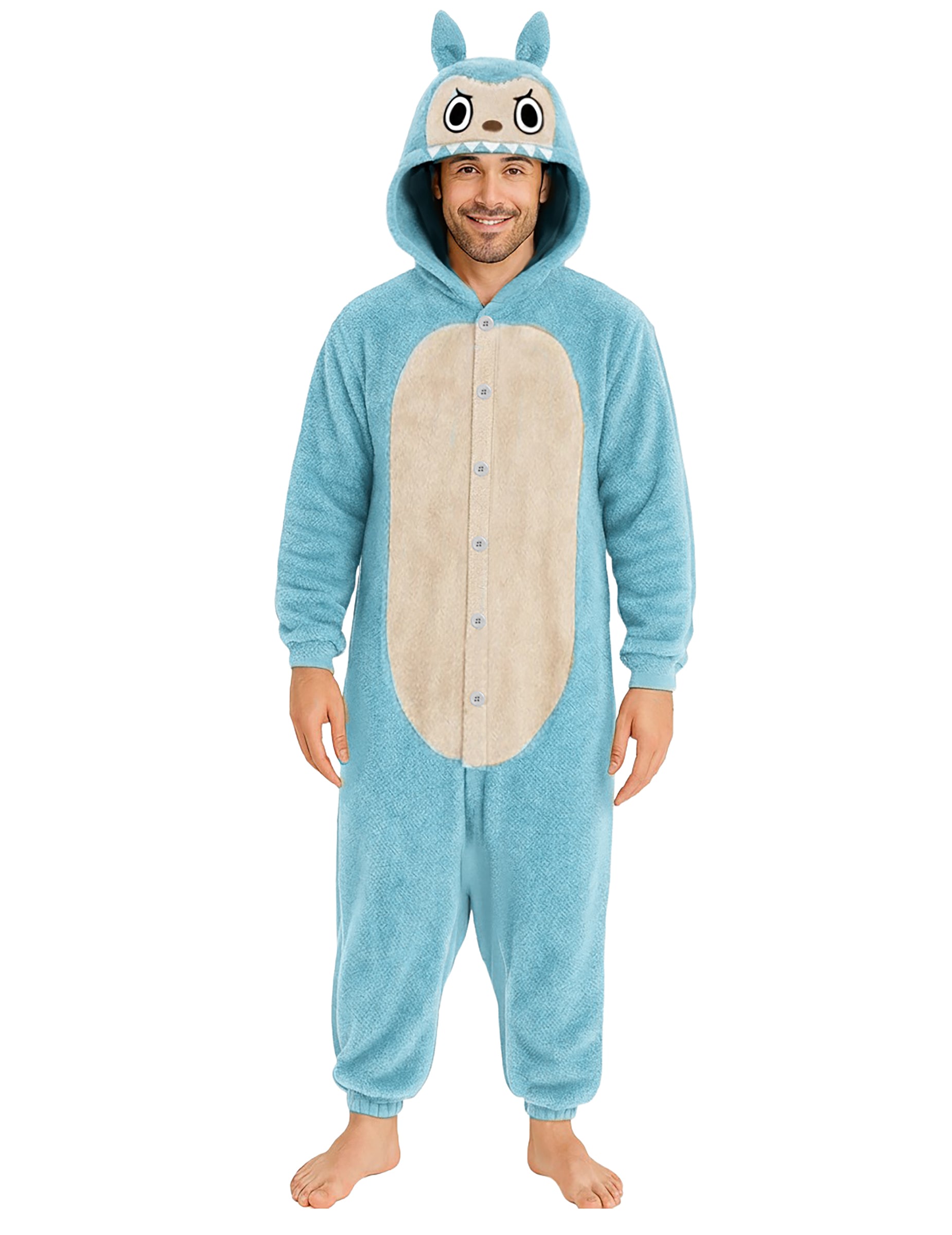 Modrá a mäkká kombinéza obopína telo pre maximálne pohodlie, ideálna na maškarný večierok alebo chvíľu oddychu. Kapucňa s veľkými ušami a šibalskou tvárou prináša zábavný a originálny nádych. Vďaka gombíkom vpredu sa ľahko oblieka a zostáva príjemná na nosenie.