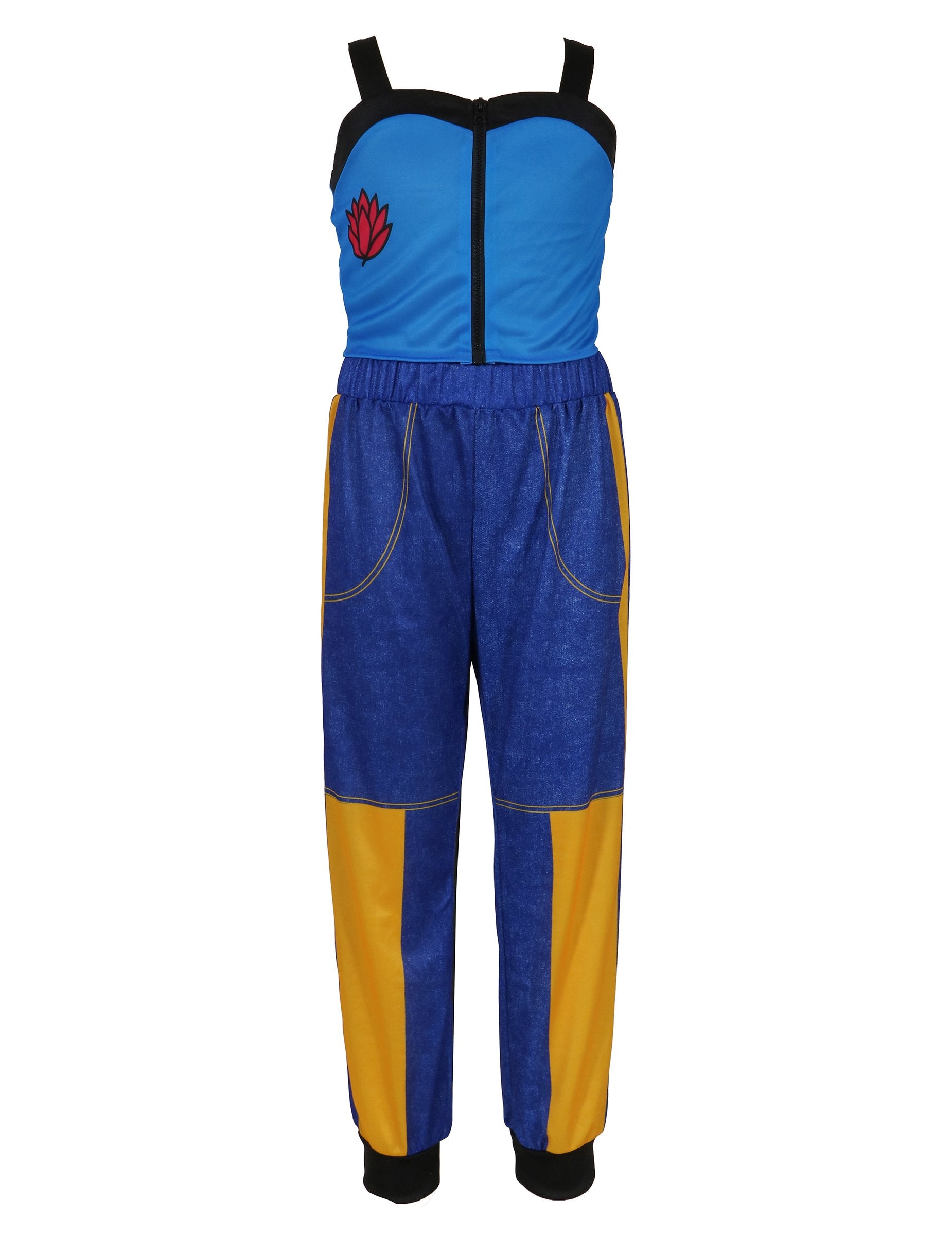 Vrch je modro-čierny, so skutočným zipsom, ktorý sa úplne otvára vpredu pre moderný a ultra štýlový vzhľad, a tiež s peknou kvetinovou potlačou na jednej strane, ktorá dodáva ženský a originálny nádych. Nohavice majú veľmi realistickú džínsovú potlač s jasne žltými detailmi, ktoré dodávajú celému outfitu energiu a umocňujú jeho trendy vzhľad.